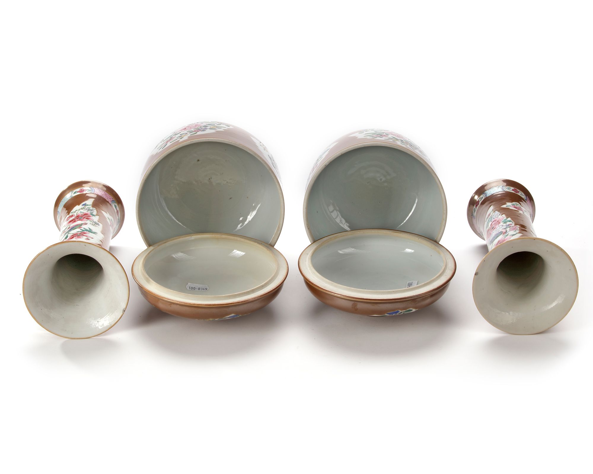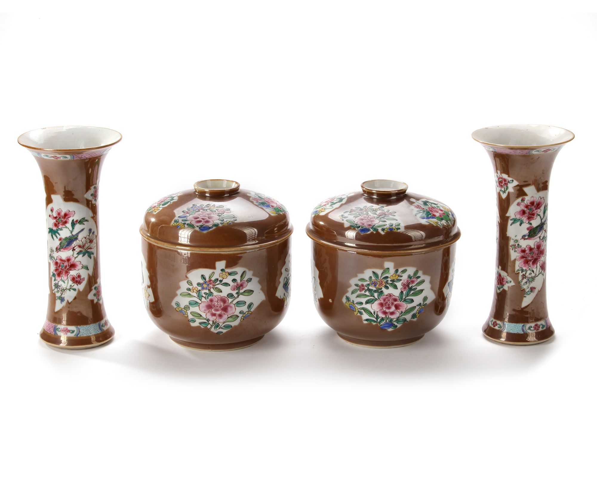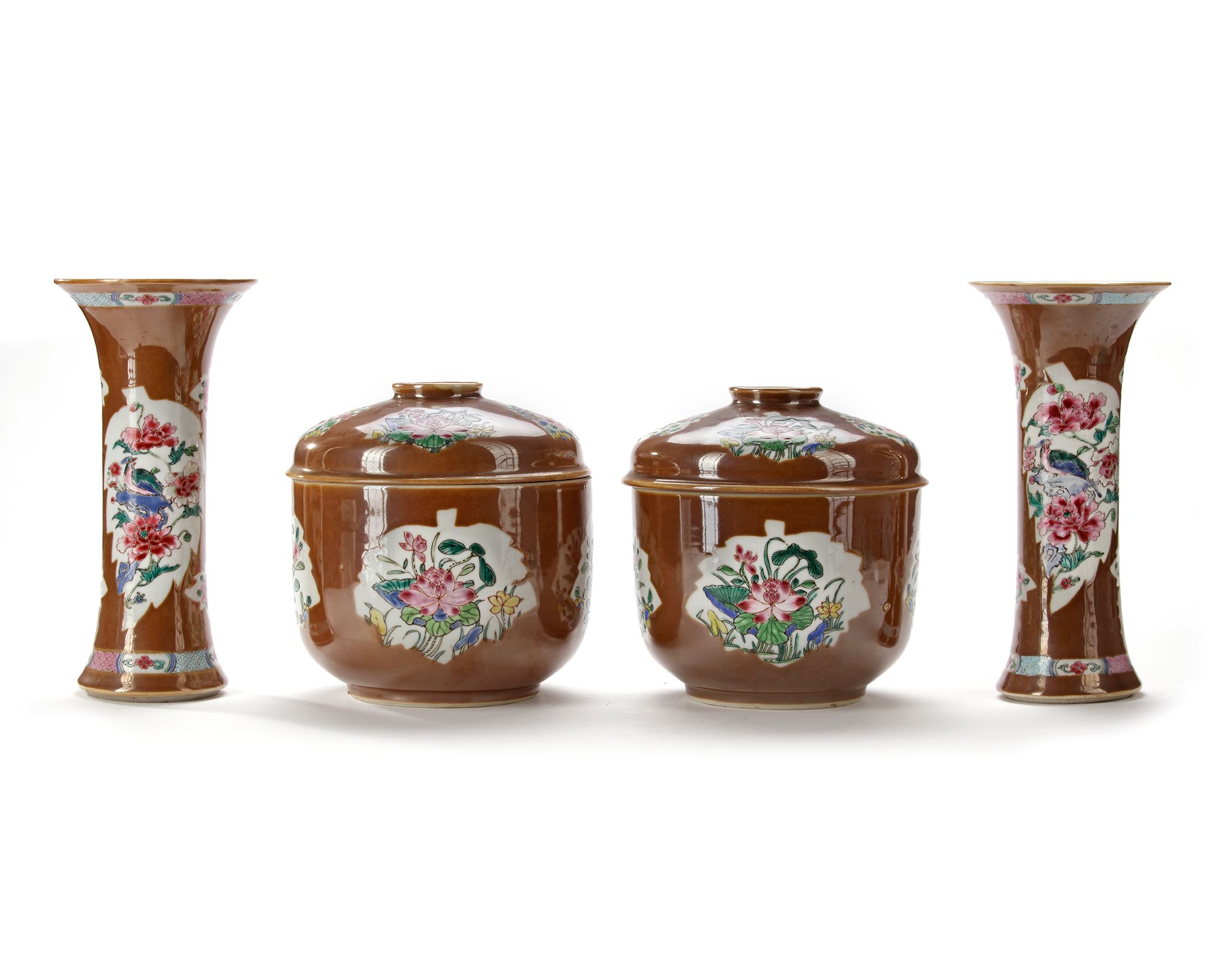 One pair for brown ground beakers, decorated in famille rose enamels with panels enclosing birds and flowers.
