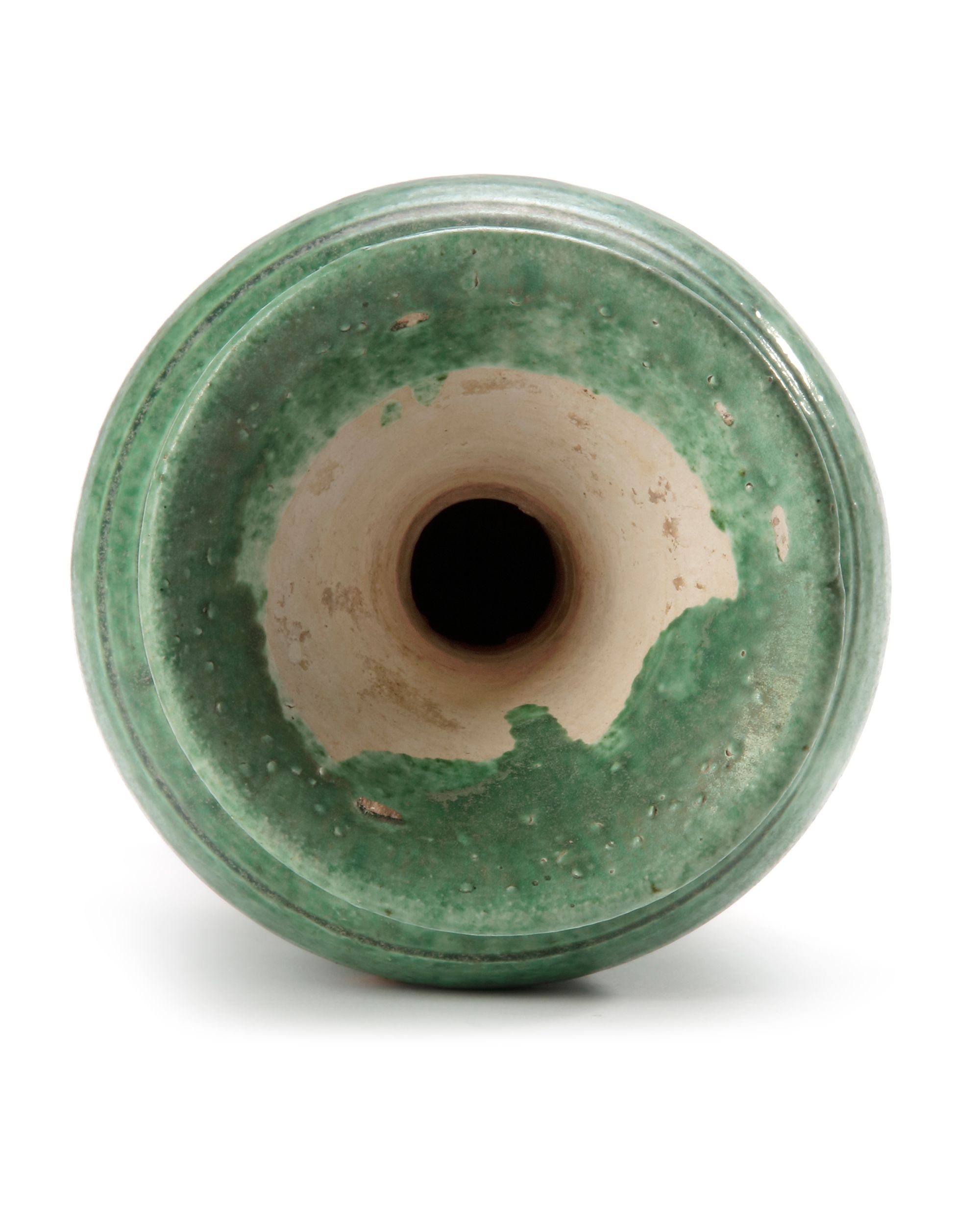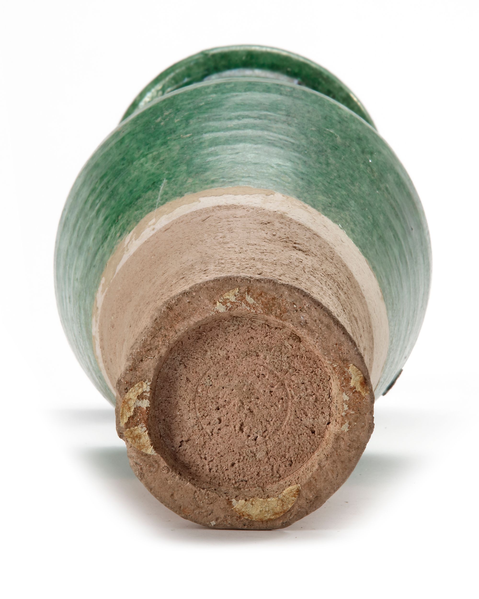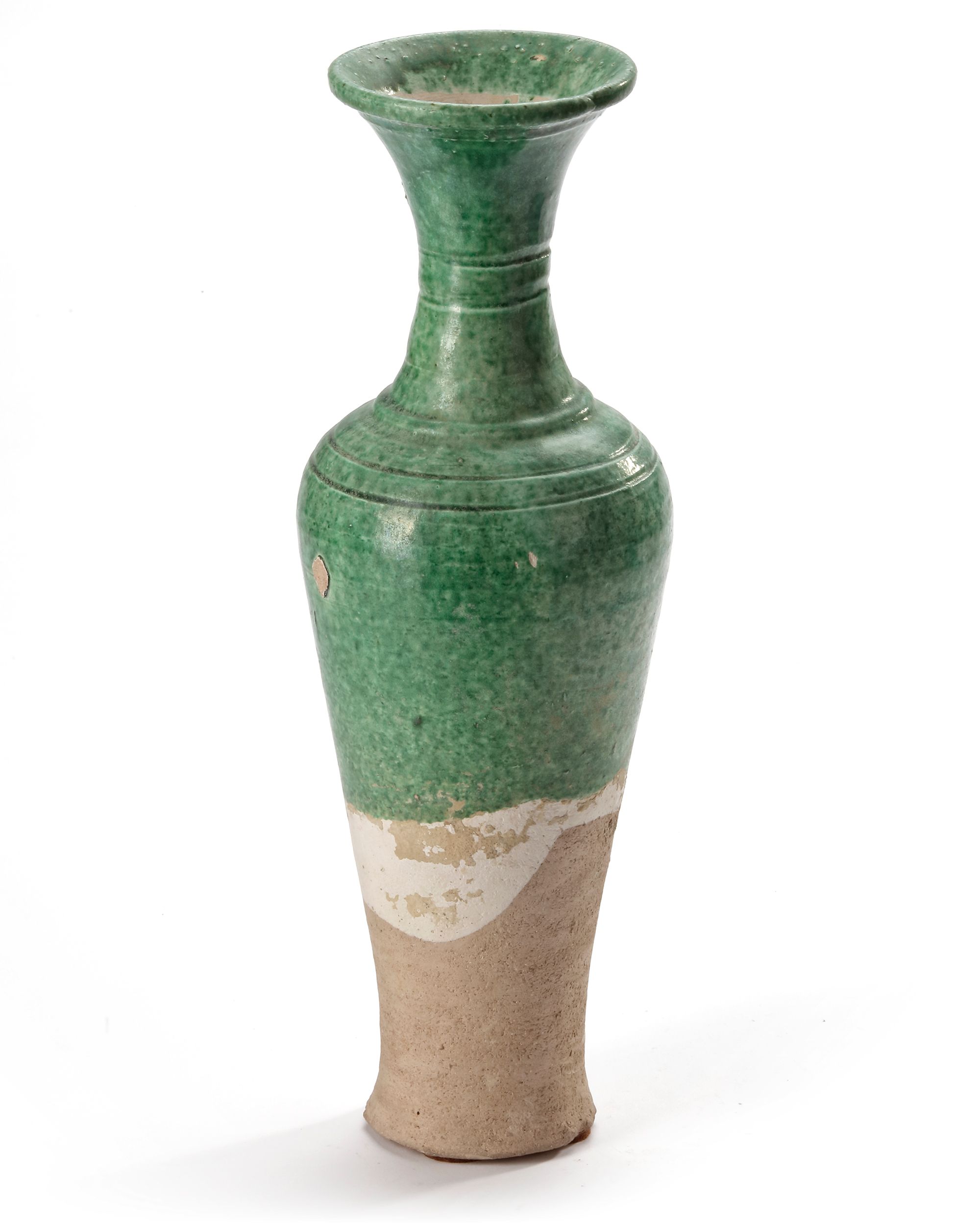 A Chinese green-glazed pottery vase of tall slender shape, a band of double grooves encircling the base. The shoulders and mid-neck flaring to a lipped rim, covered under a jade-green glaze falling irregularly to mid-body to expose the granular buff ware.
