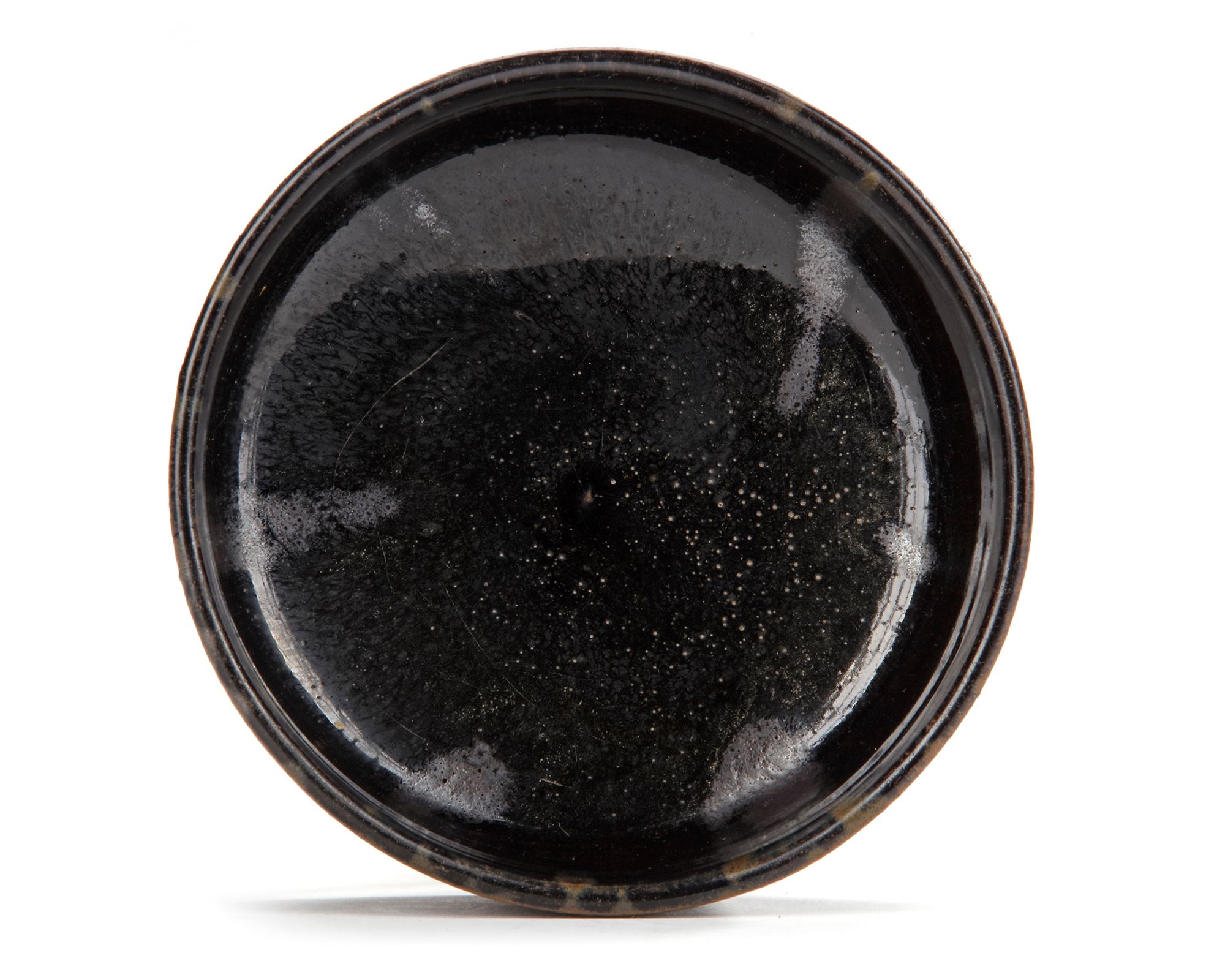 A Chinese Henan brush washer resting on a knife pared foot-rim, covered overall with a lustrous black glaze streaked with metallic grey splashes radiating from the rim inside and falling down the sides and the glaze stopping short of the foot on the exterior to reveal the buff ware.