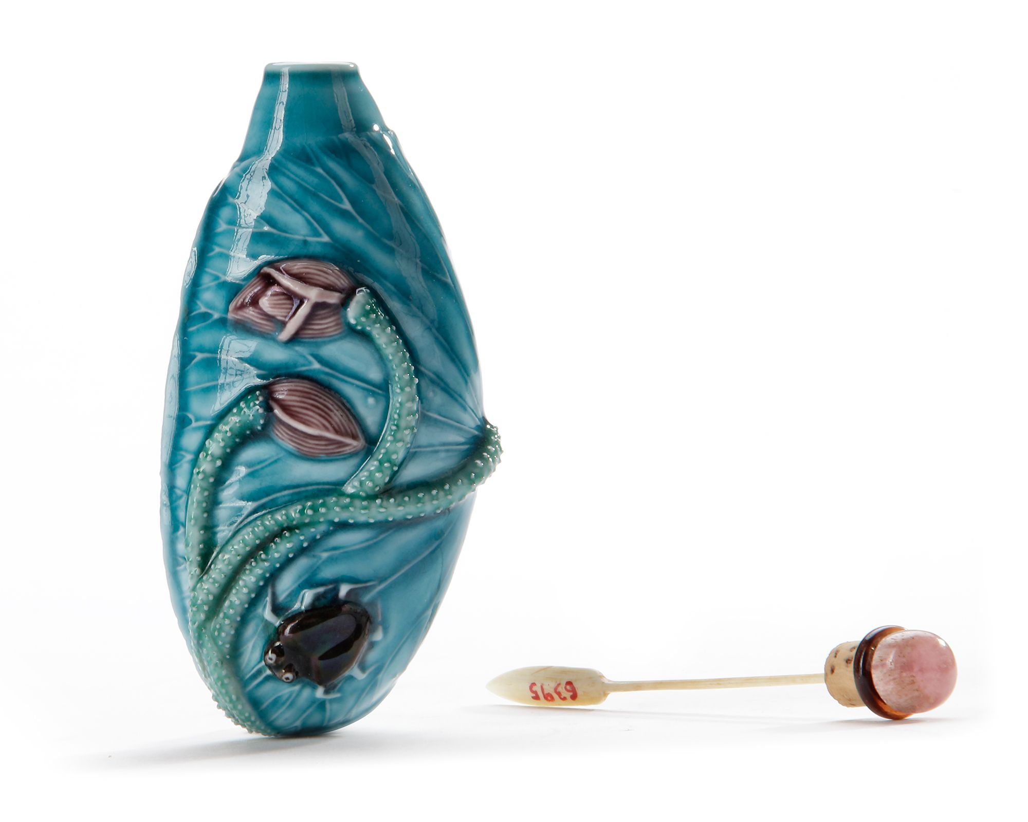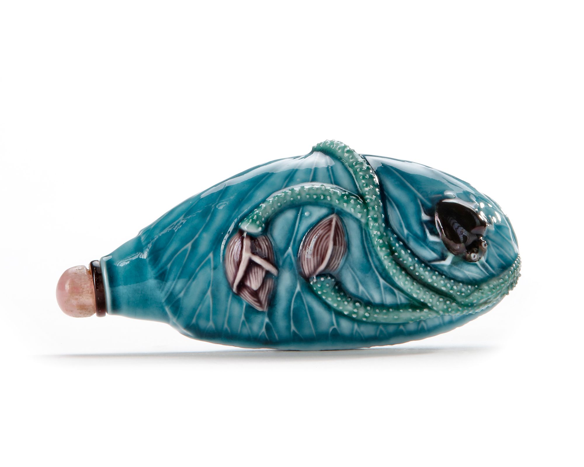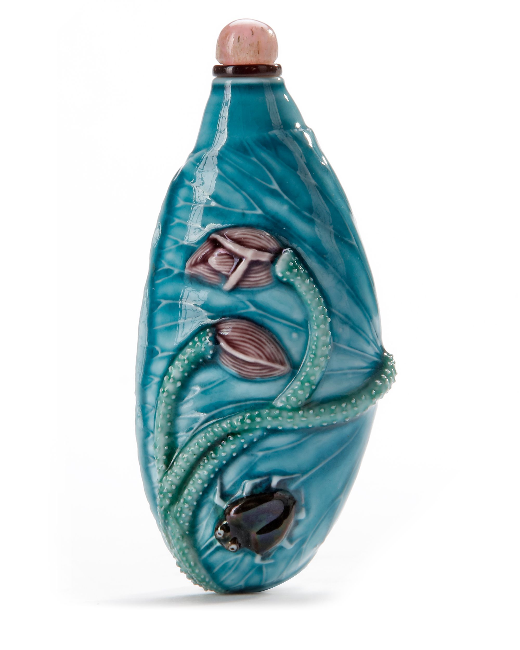 Porcelain snuff bottle, molded in the form of a curled lotus leaf, with lotus buds and insects, the bottle covered overall with a turquoise glaze with the detail picked out in black green and pink.