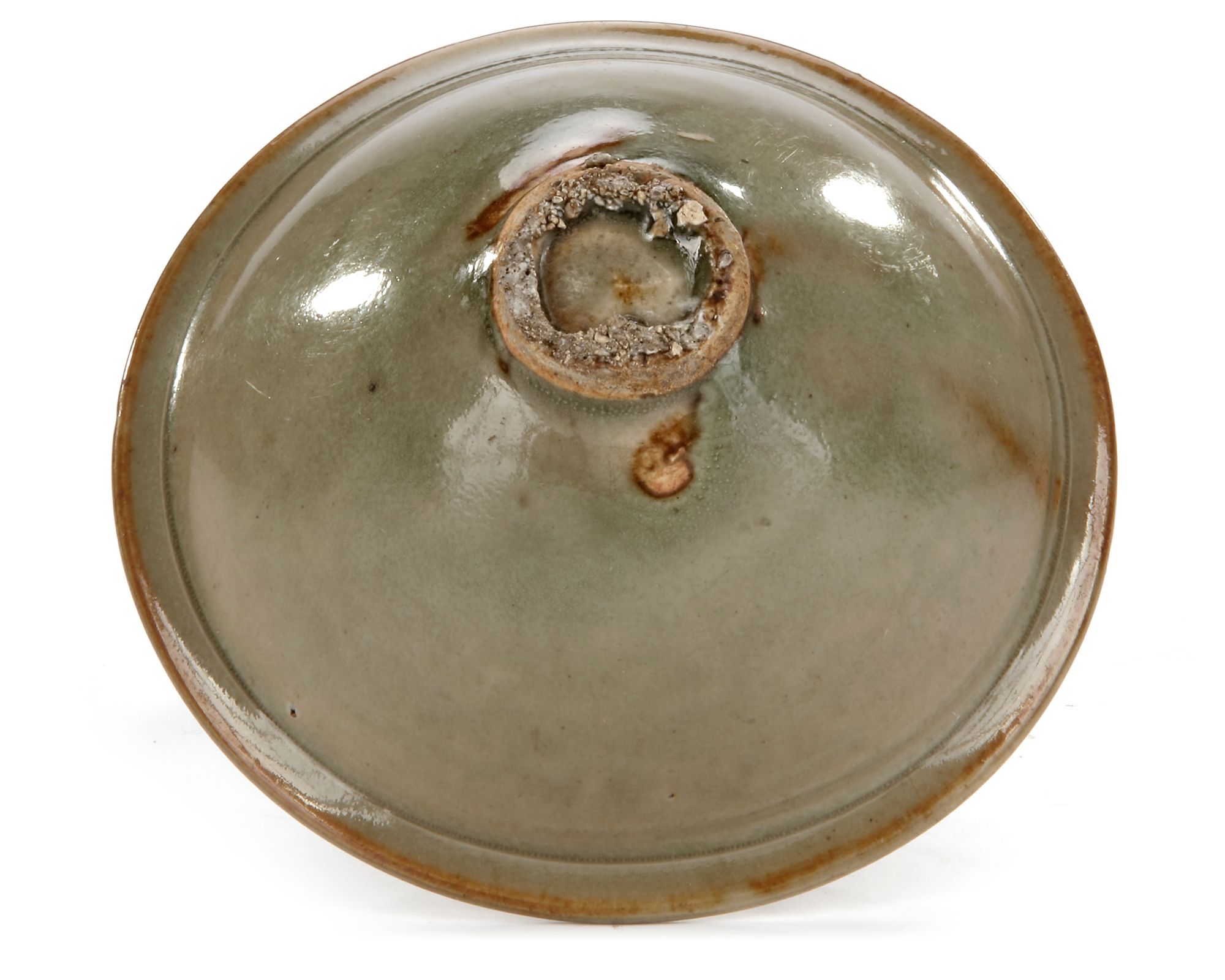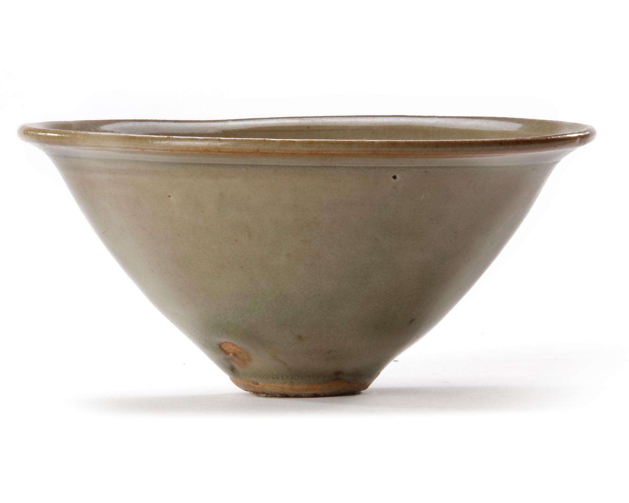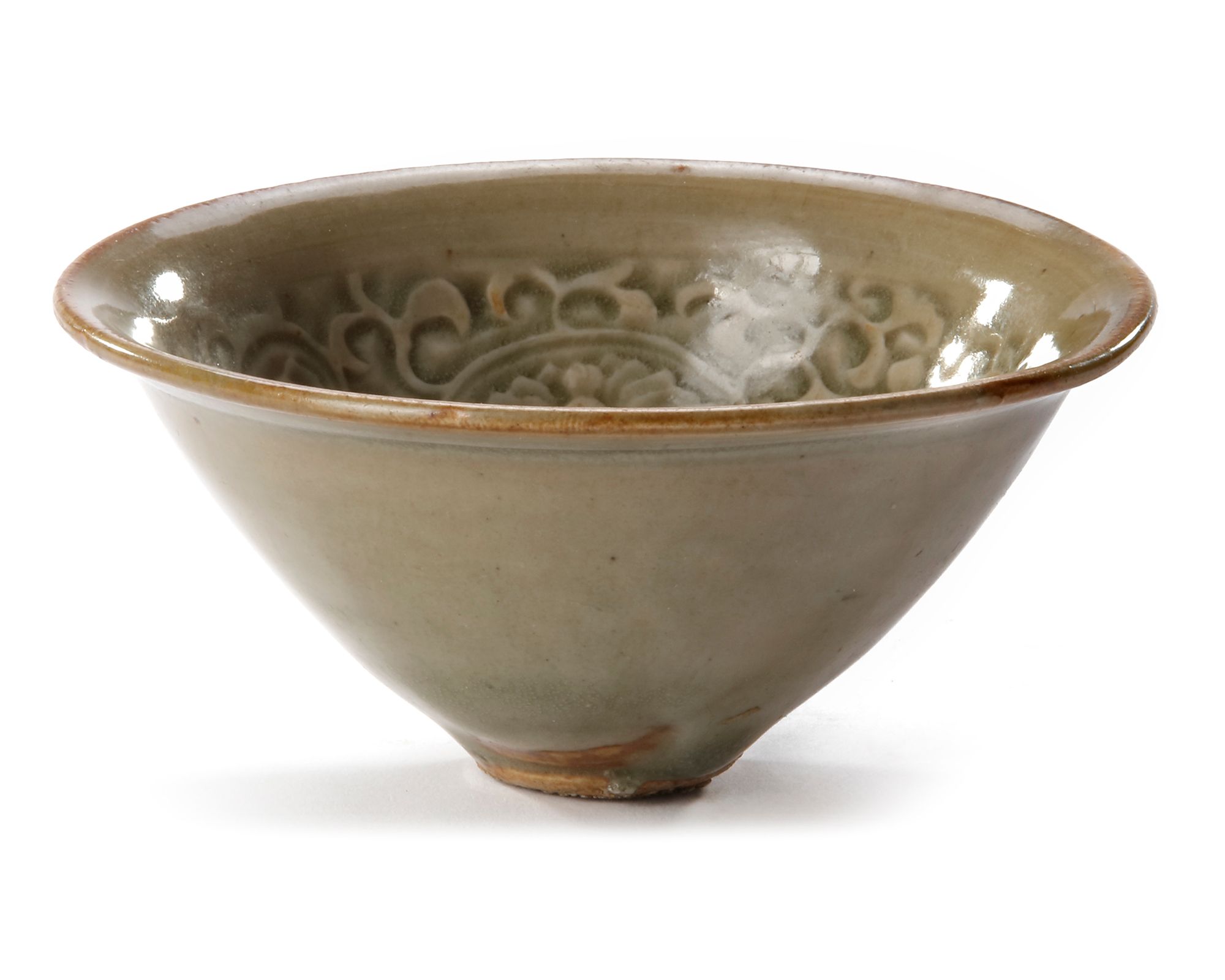 A small Chinese porcelain dish with conical sides and flared rim, the interior crisply moulded with flowers amongst foliage, covered overall in a bubble suffused olive-green glaze.