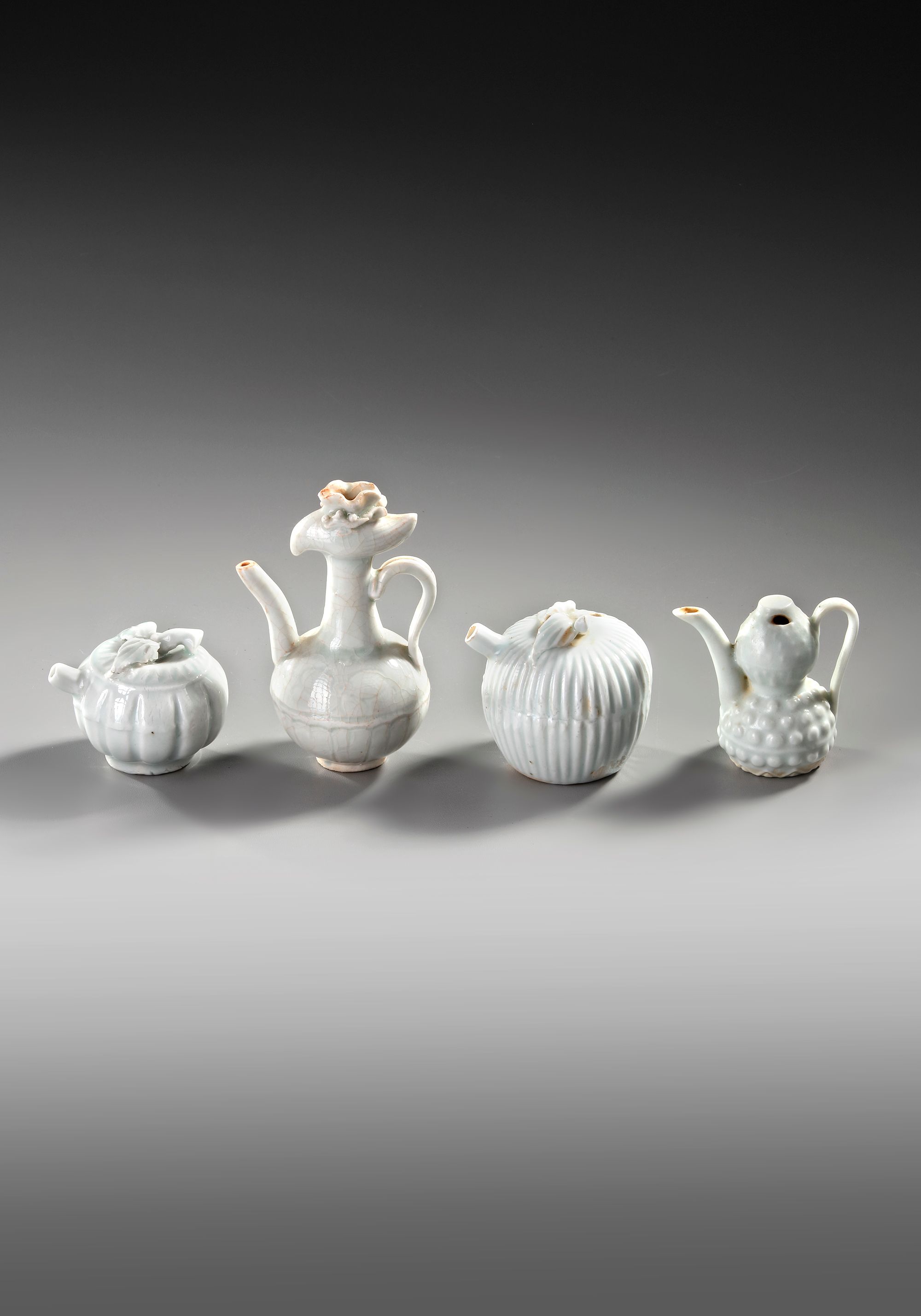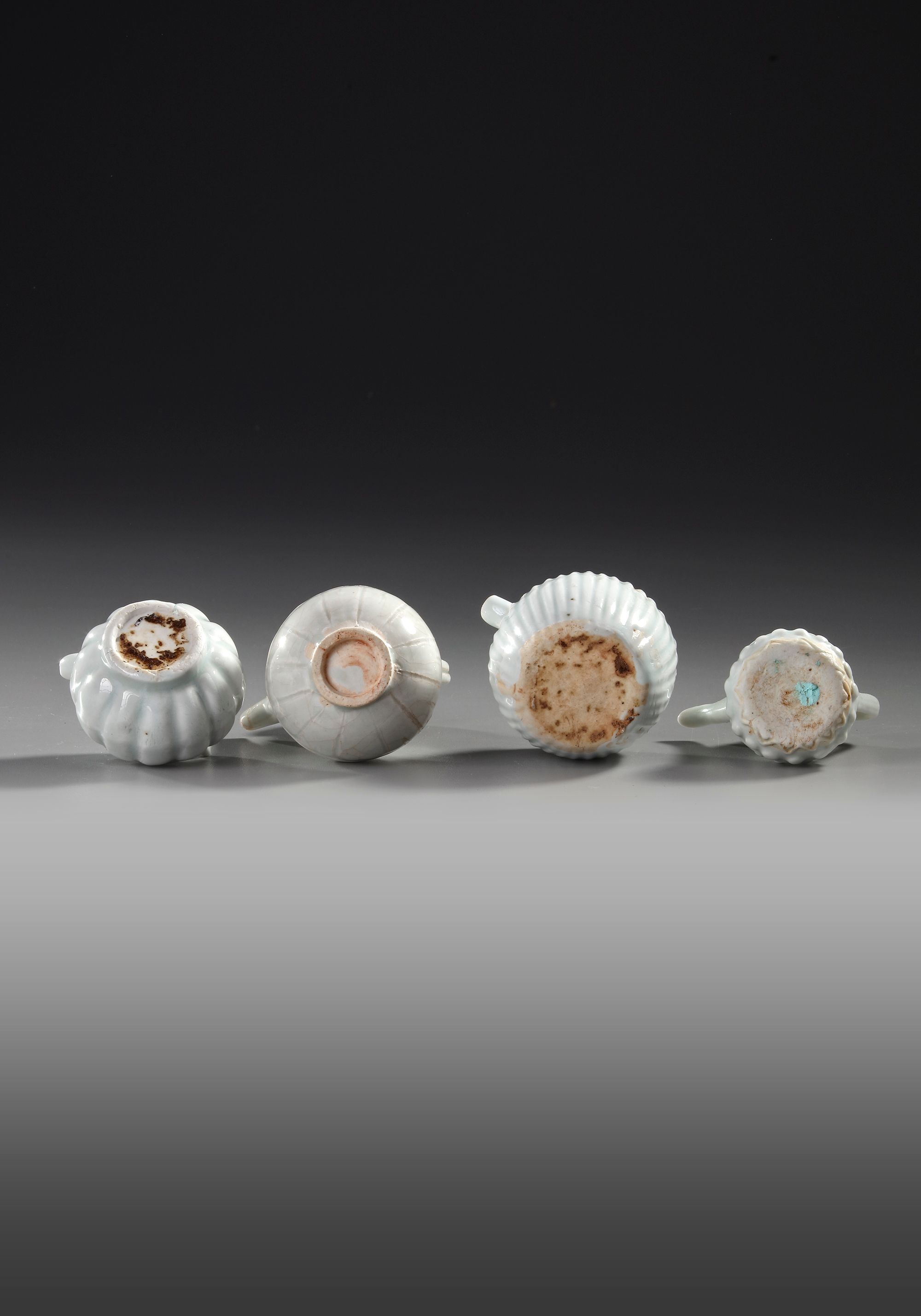 Two small Chinese Qingbai fruit shaped water droppers with small spout and a branch shaped handle. Height: 5-6 cm.