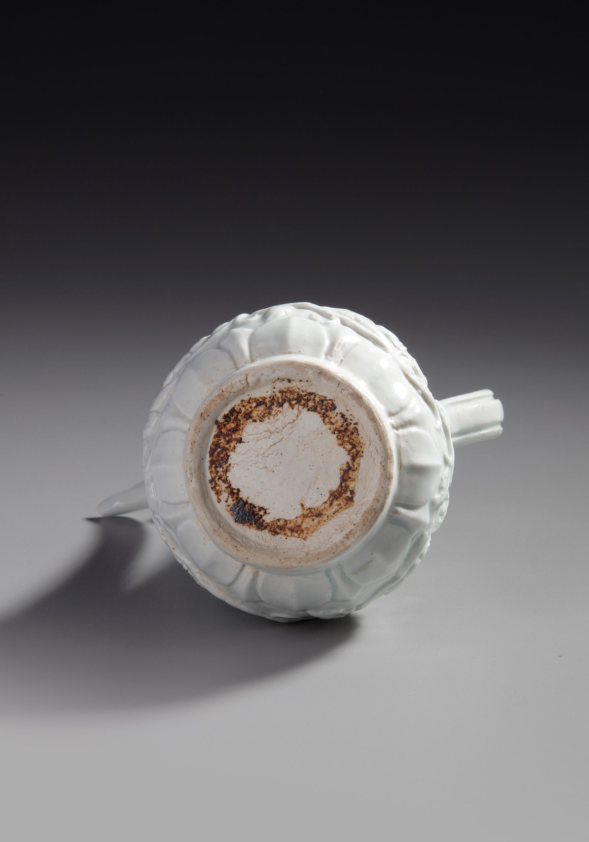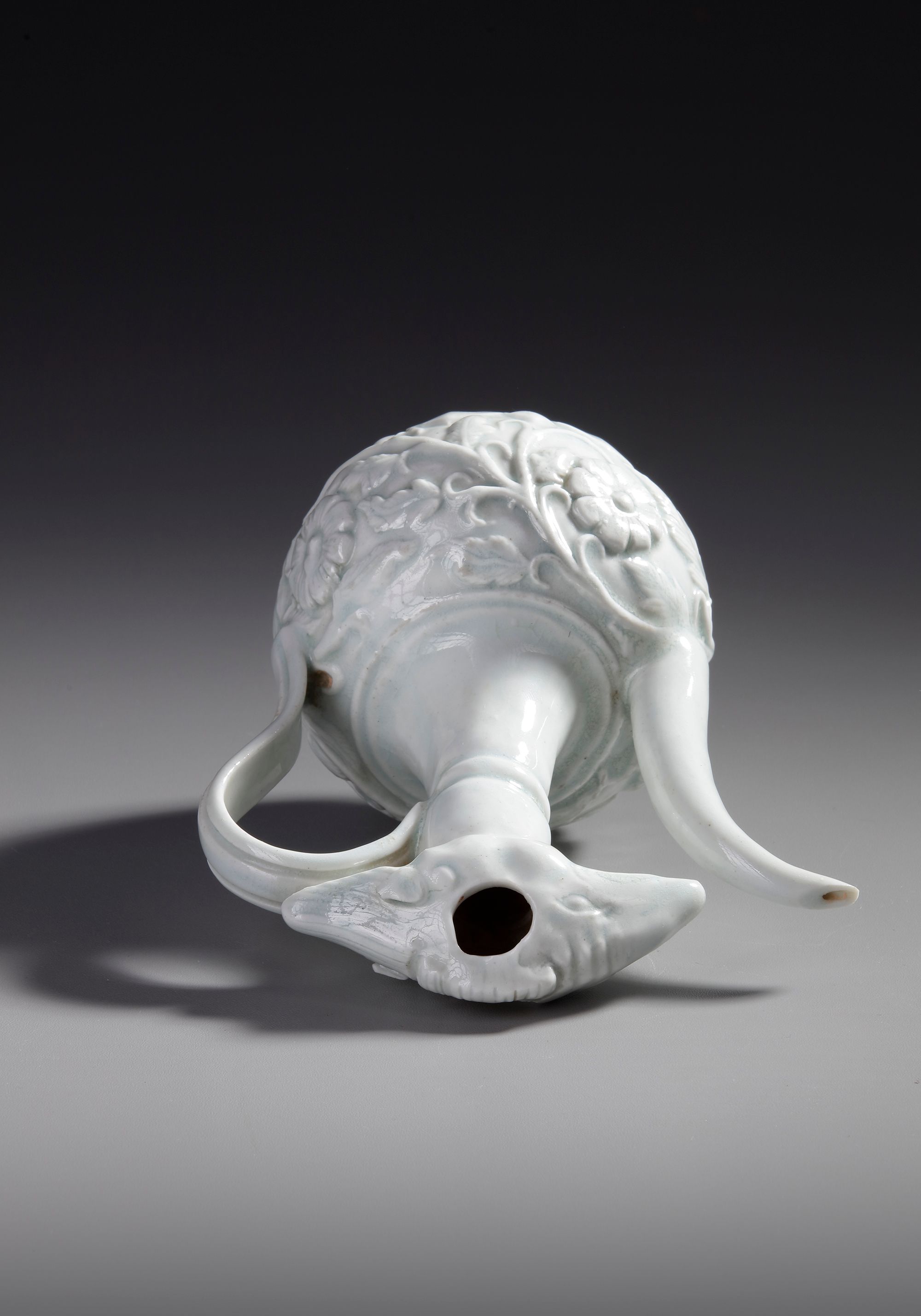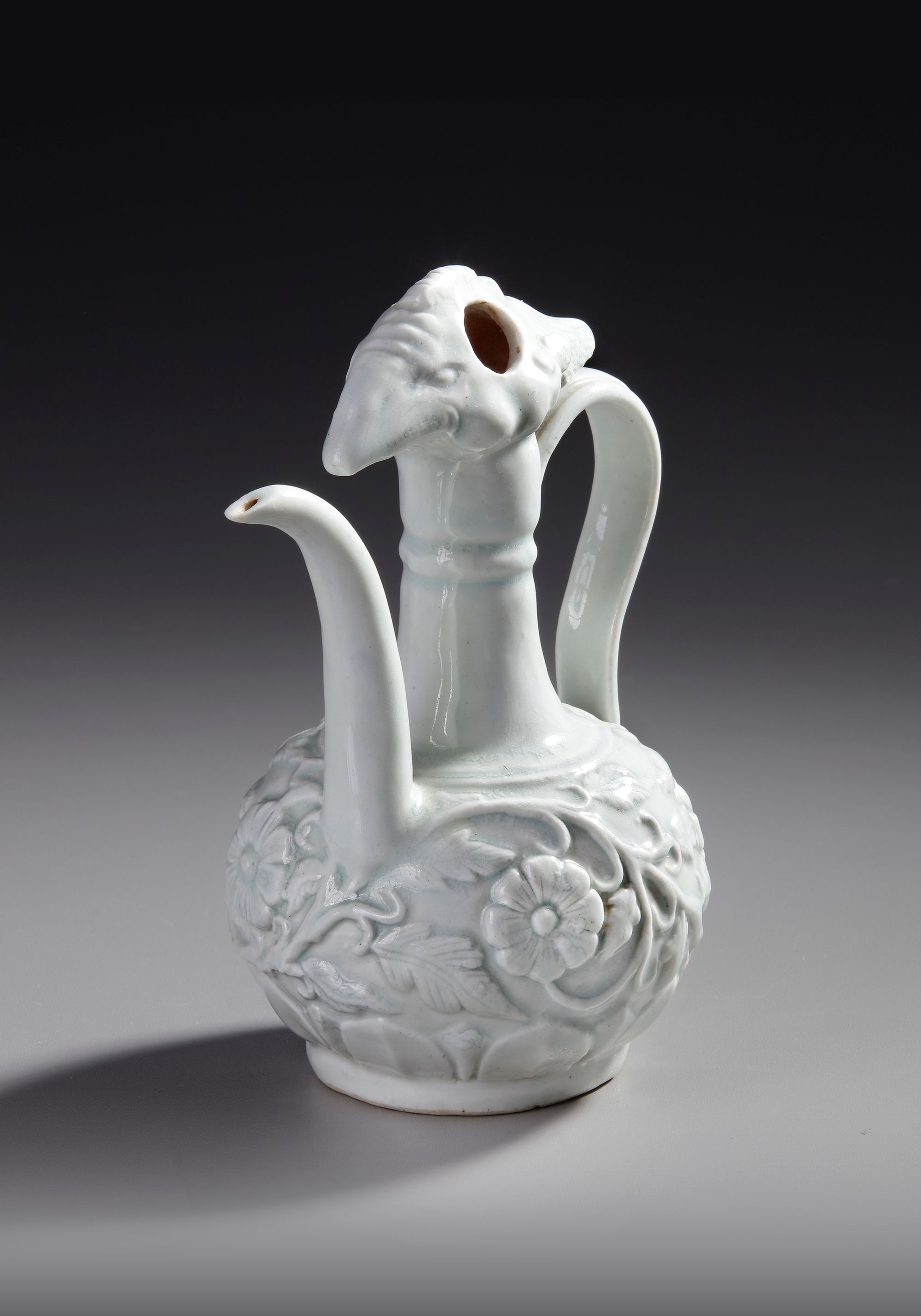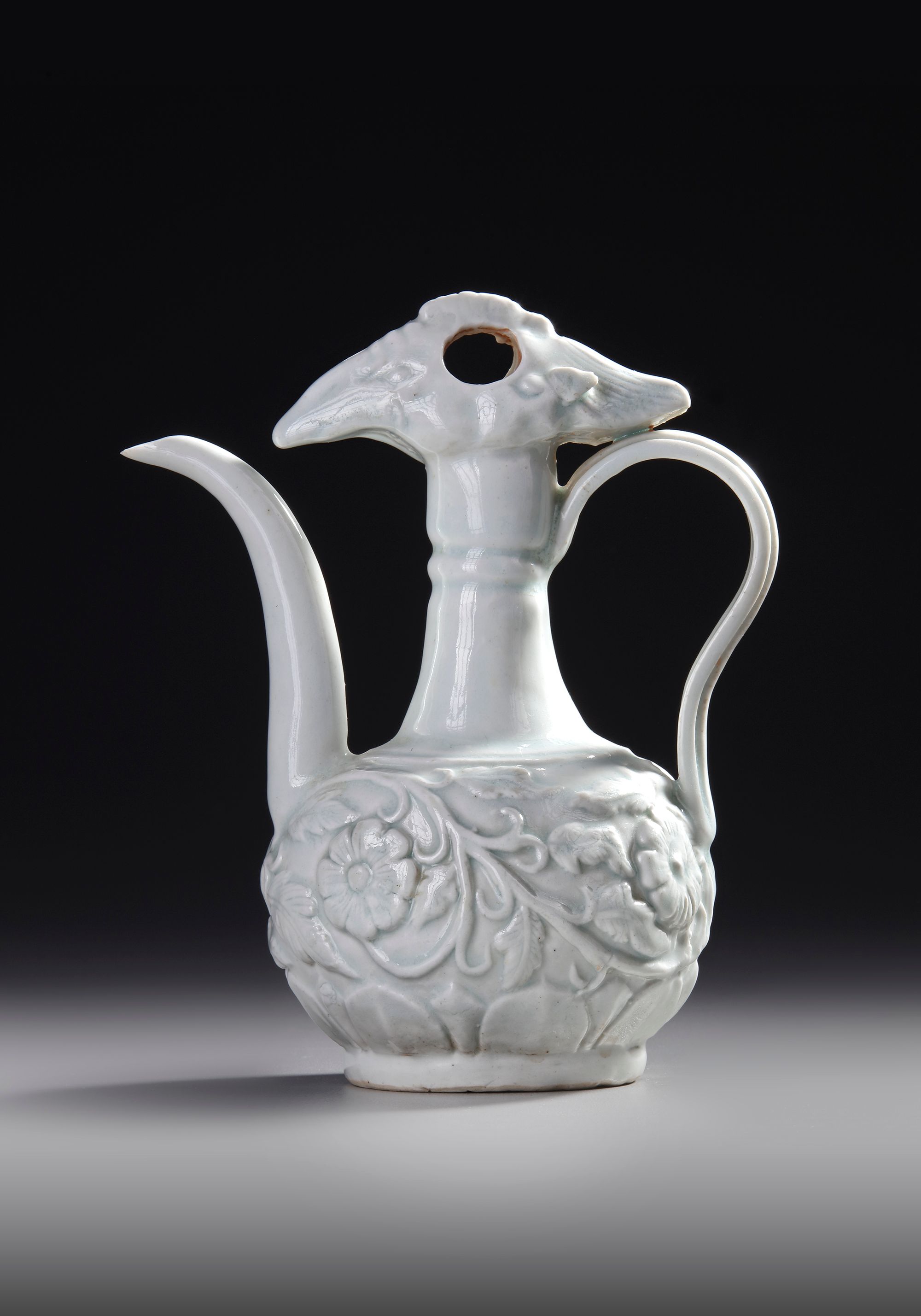 The bulbous body rises to a tapering ribbed neck surmounted by a phoenix head, and has a strap handle opposite the short, curved spout. The body applied and incised with floral leafy sprays.