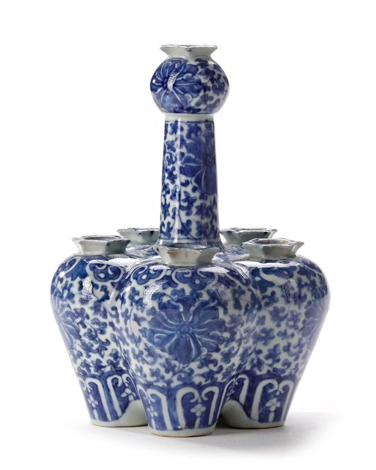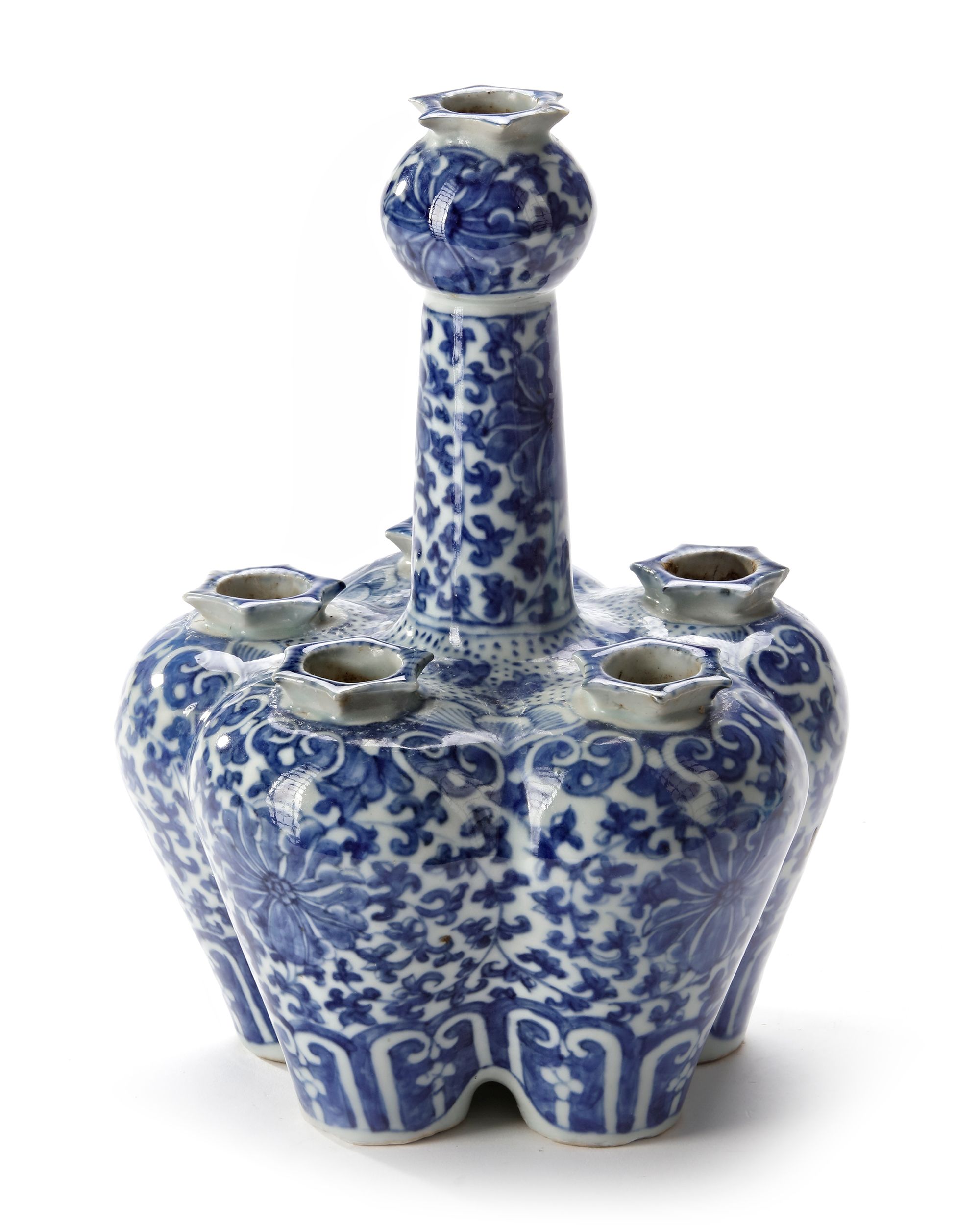 Modelled as five conjoined baluster vases around a long central tapering neck terminating in a crocus-head mouth painted to the body with chrysanthemum flower heads amongst floral leafy sprays, set between ruyi-heads around the shoulders and a petal lappet border to the base, the neck is similarly decorated.