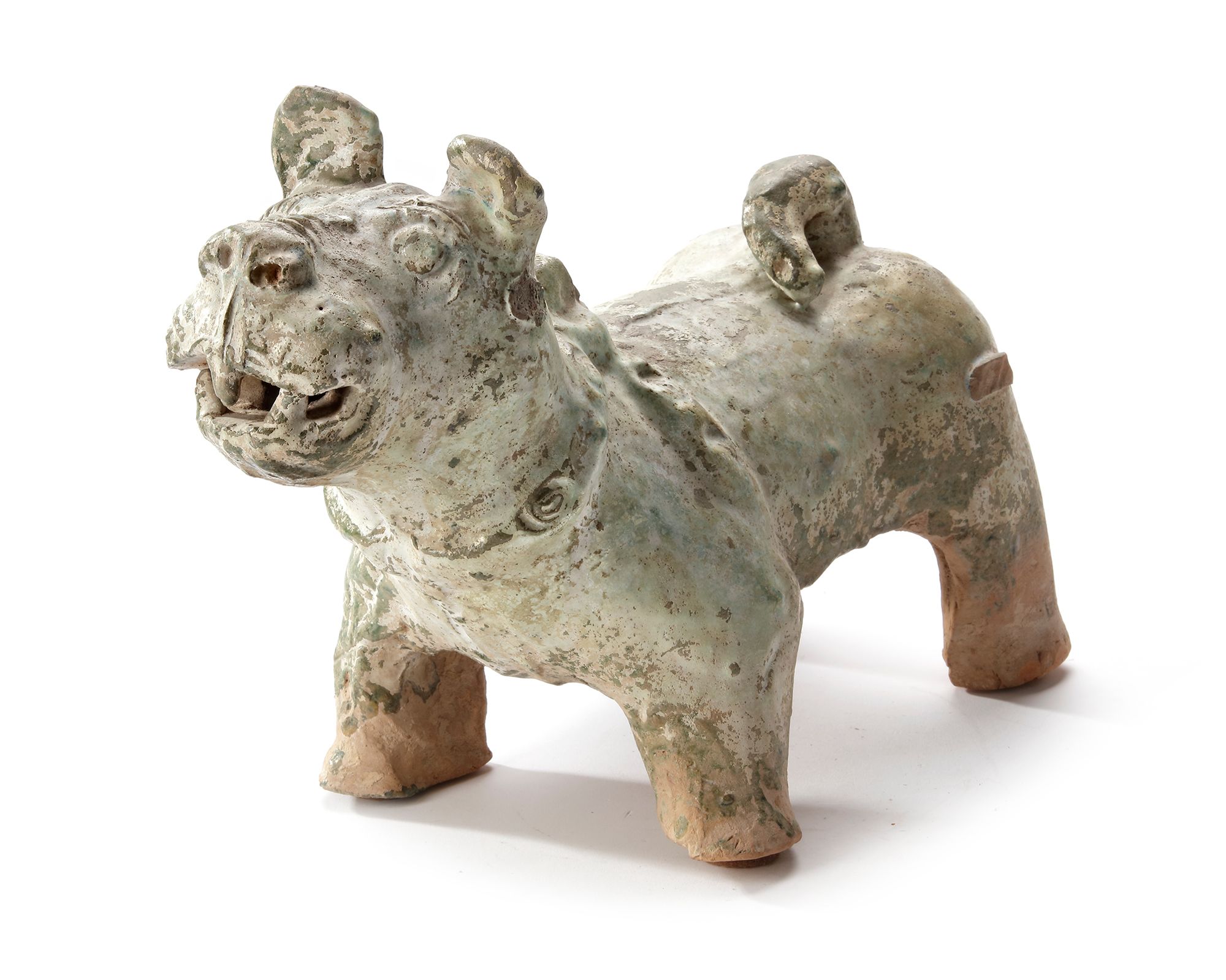 A very similar green-glazed dog is illustrated in Kandai no bijutsu, pl. 135; a brown-glazed one is illustrated in Hobson's Eumorfopulos Collection Catalogue, vol. 1, pl. IX, no. 63; and another was included in the O.C.S. Exhibition, "Iron in the Fire," Oxford, 1988, cat. no.9. Compare also with the similar dogs in the Tokyo National Museum, illustrated in the Catalogue of Chinese Ceramics I, Tokyo, 1988, no. 130; and in the Idemitsu Museum illustrated in the 15th Anniversary Catalogue, Tokyo, 1981, no. 393.