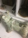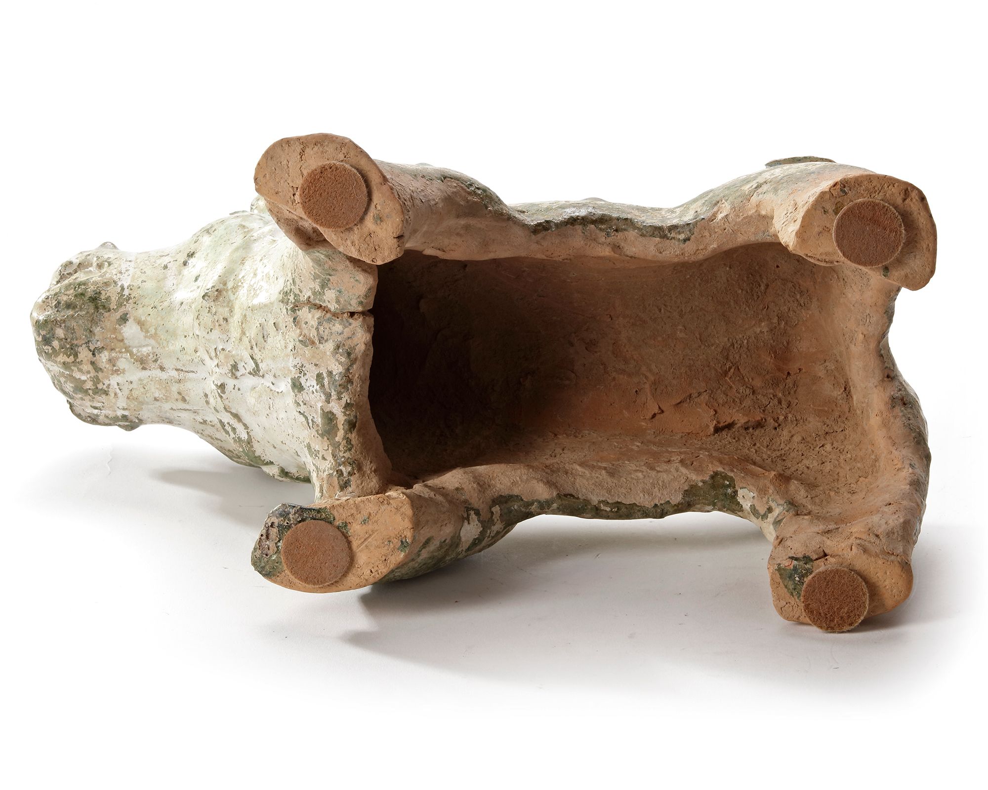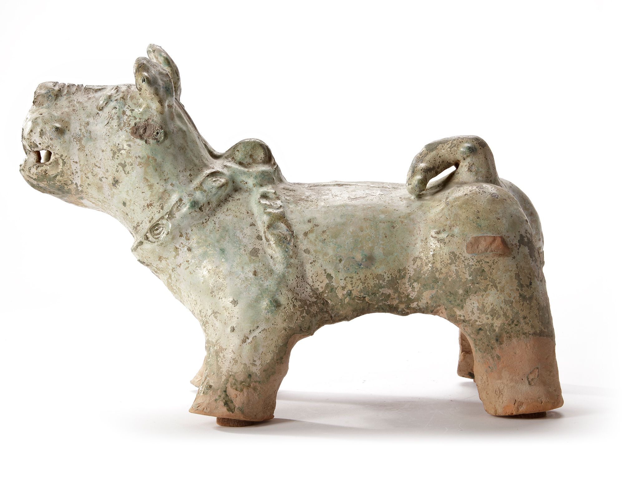 During the Han Dynasty, dogs of various types were frequently placed in tombs. This type of short-legged mastiff with ringed harness and open mouth appears to have been very popular.