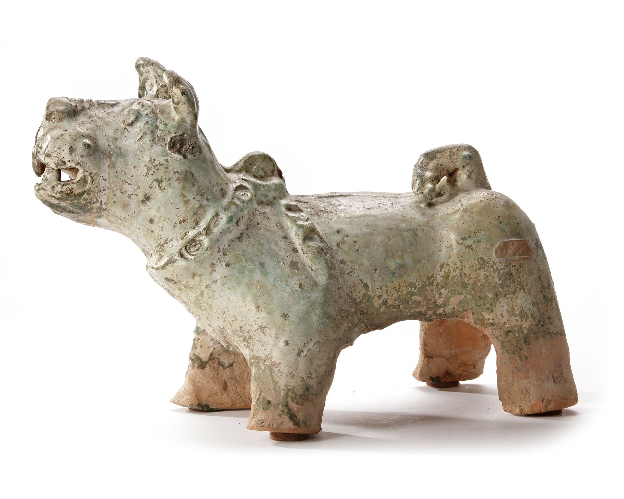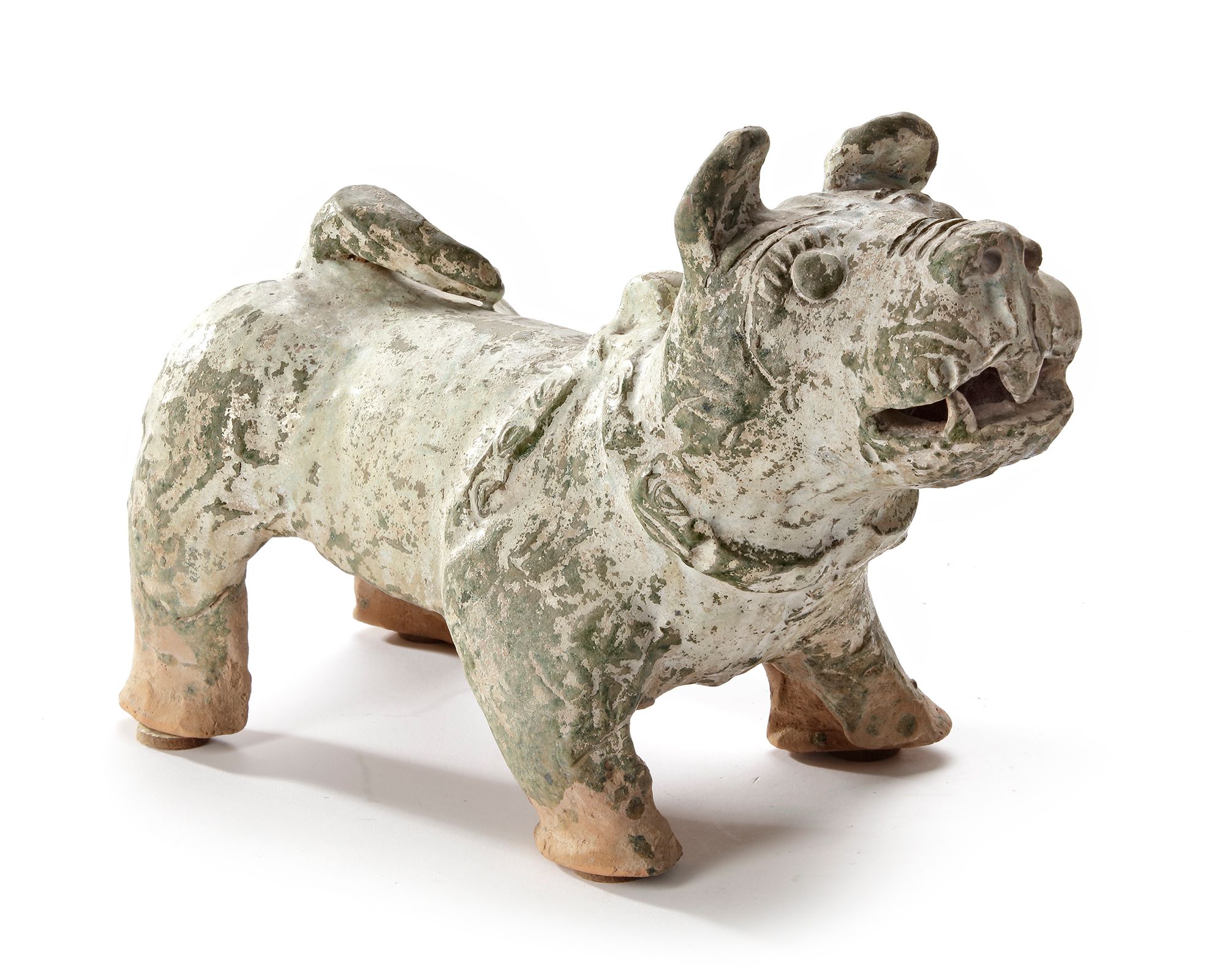 The green-glazed dog stands foursquare with its head raised. The face is well-modeled with bulging eyes, ears curled forward and alert, its open mouth reveals fangs and a lolling tongue. Double straps around the neck and chest join in a loop at the back. The tail curls up to one side, and the short feet have pointed toes. The entire dog is covered in a green glaze, which has become iridescent in areas.