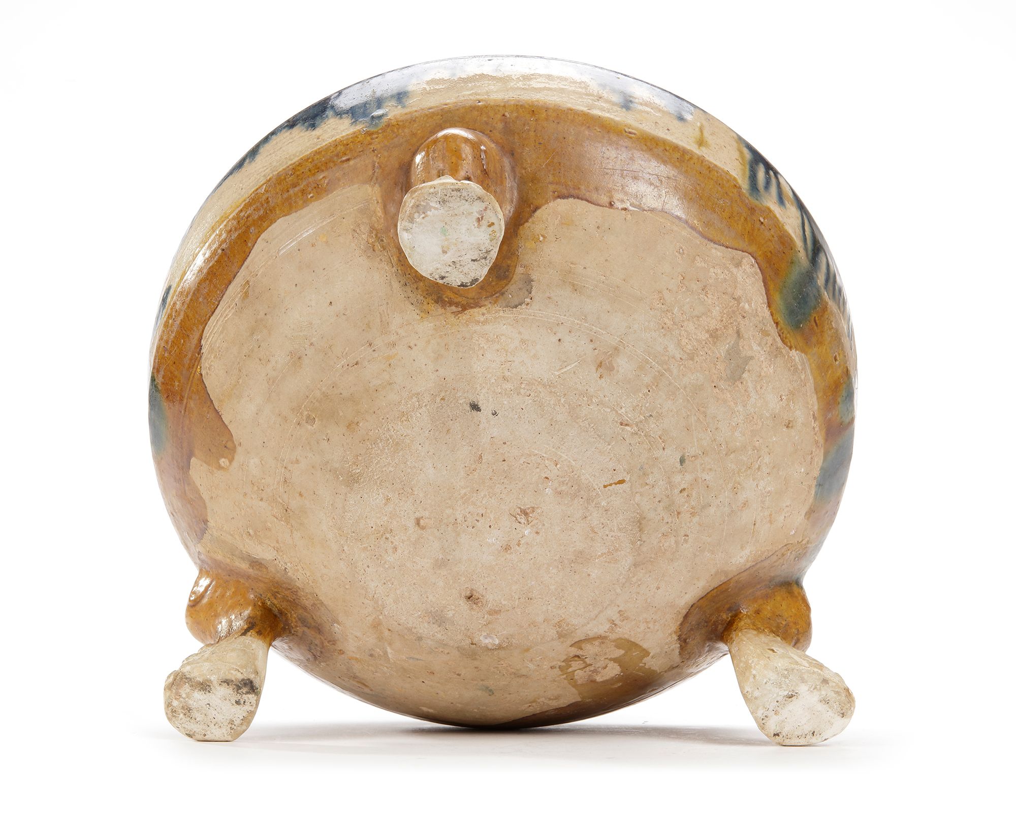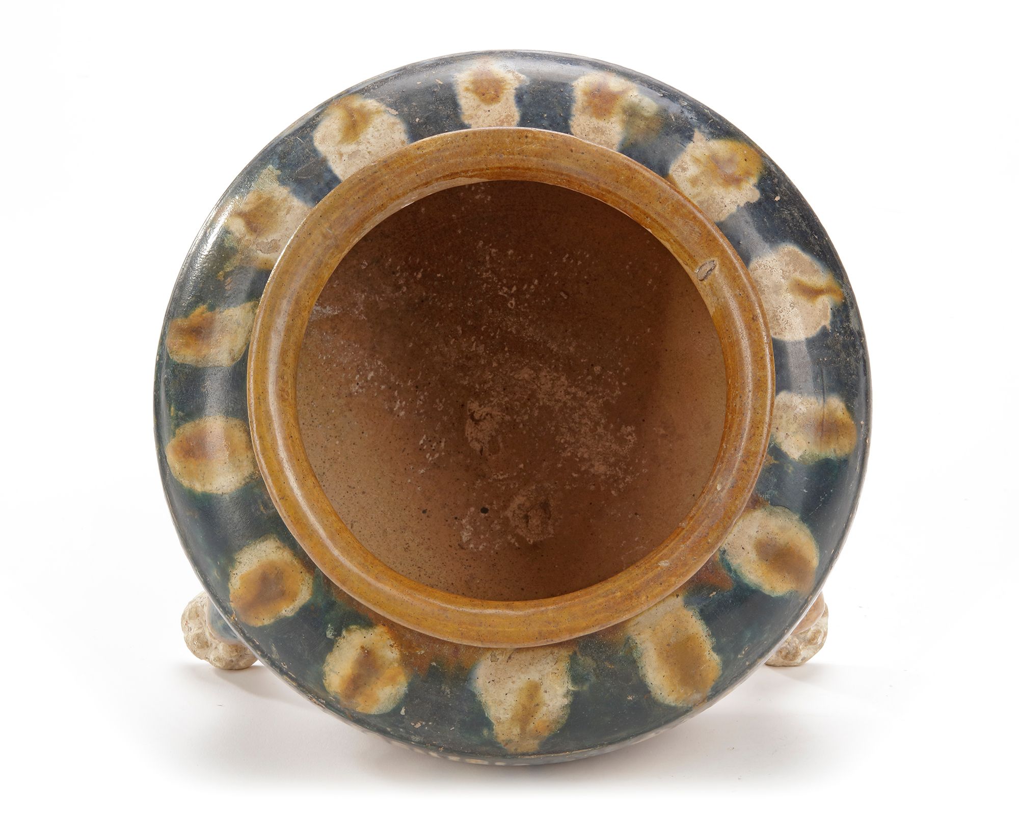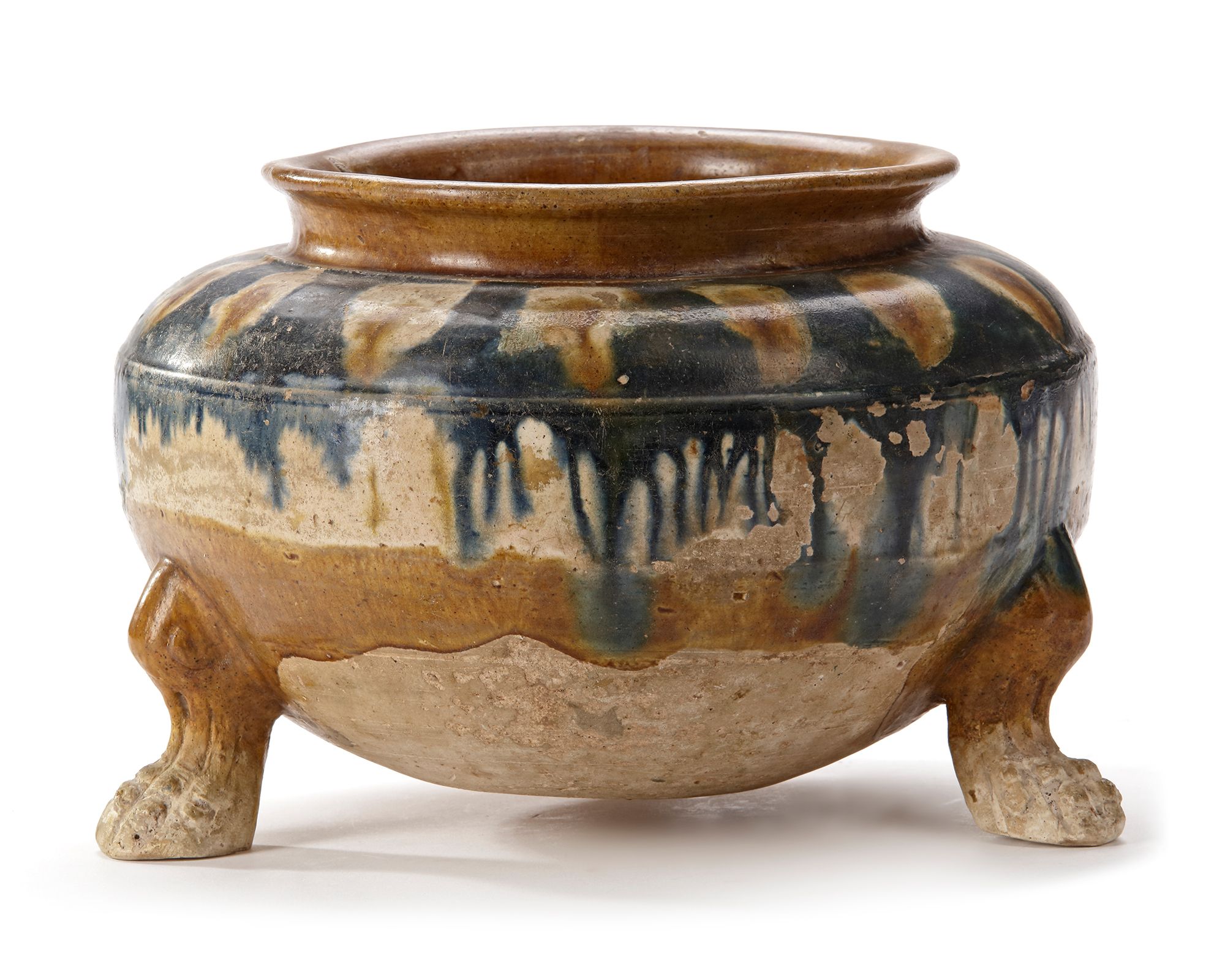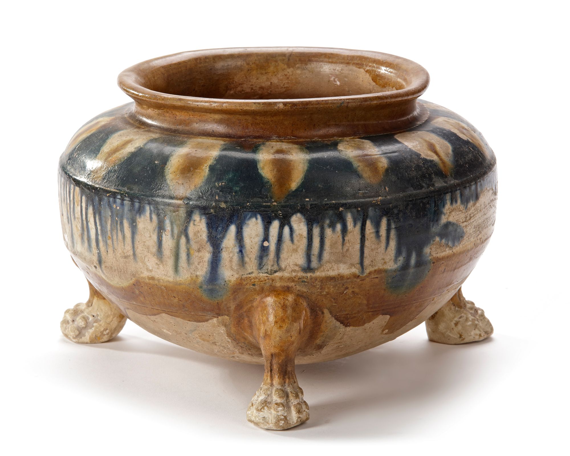 Of squat rounded form supported on 3 claw feet; the shoulder decorated with ivory glaze splashed on a brilliant deep blue glaze, falling in streaks.