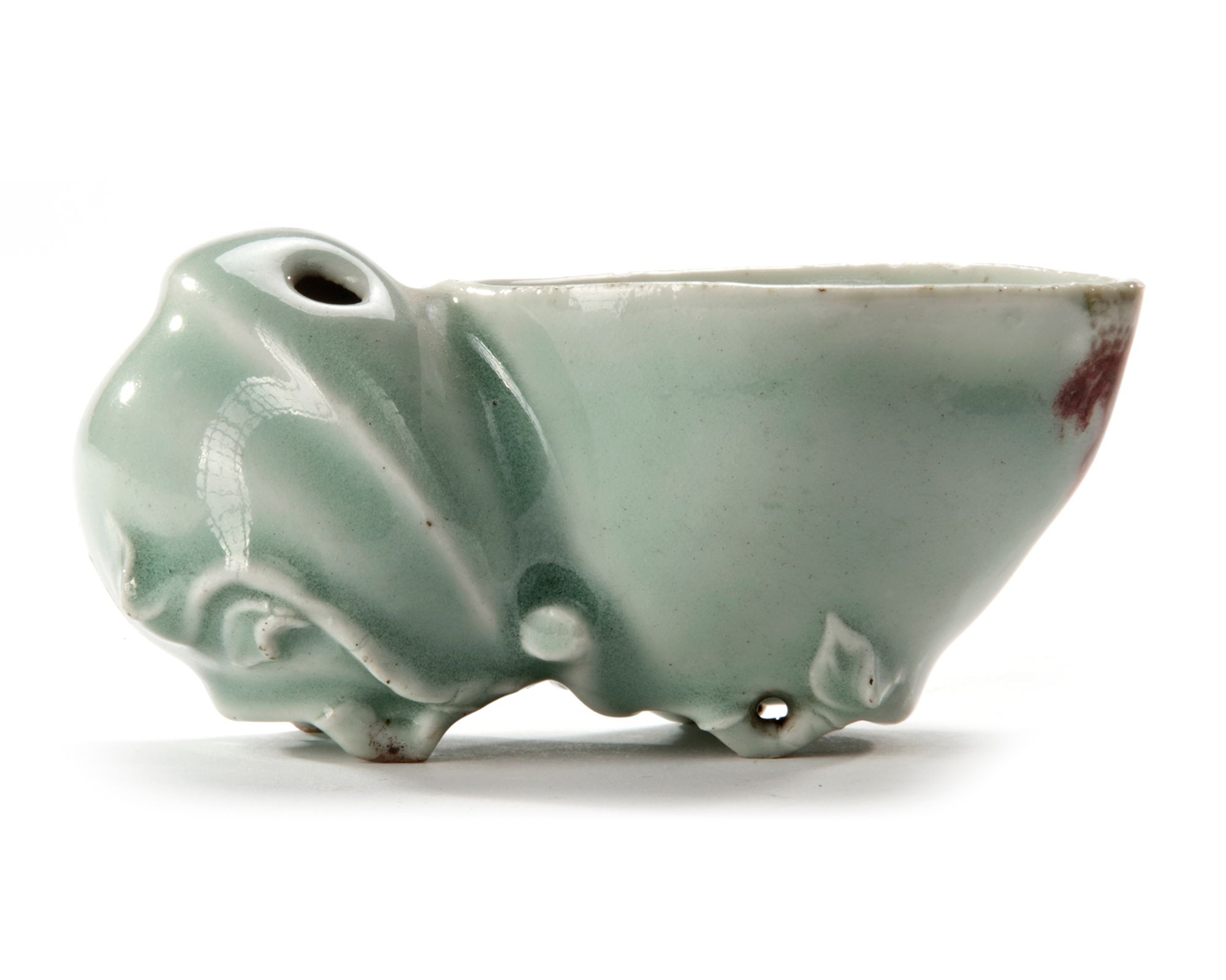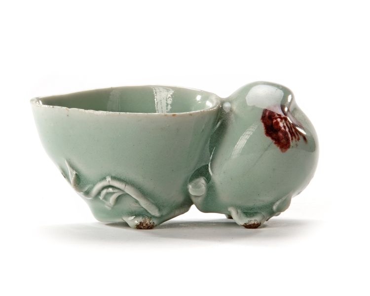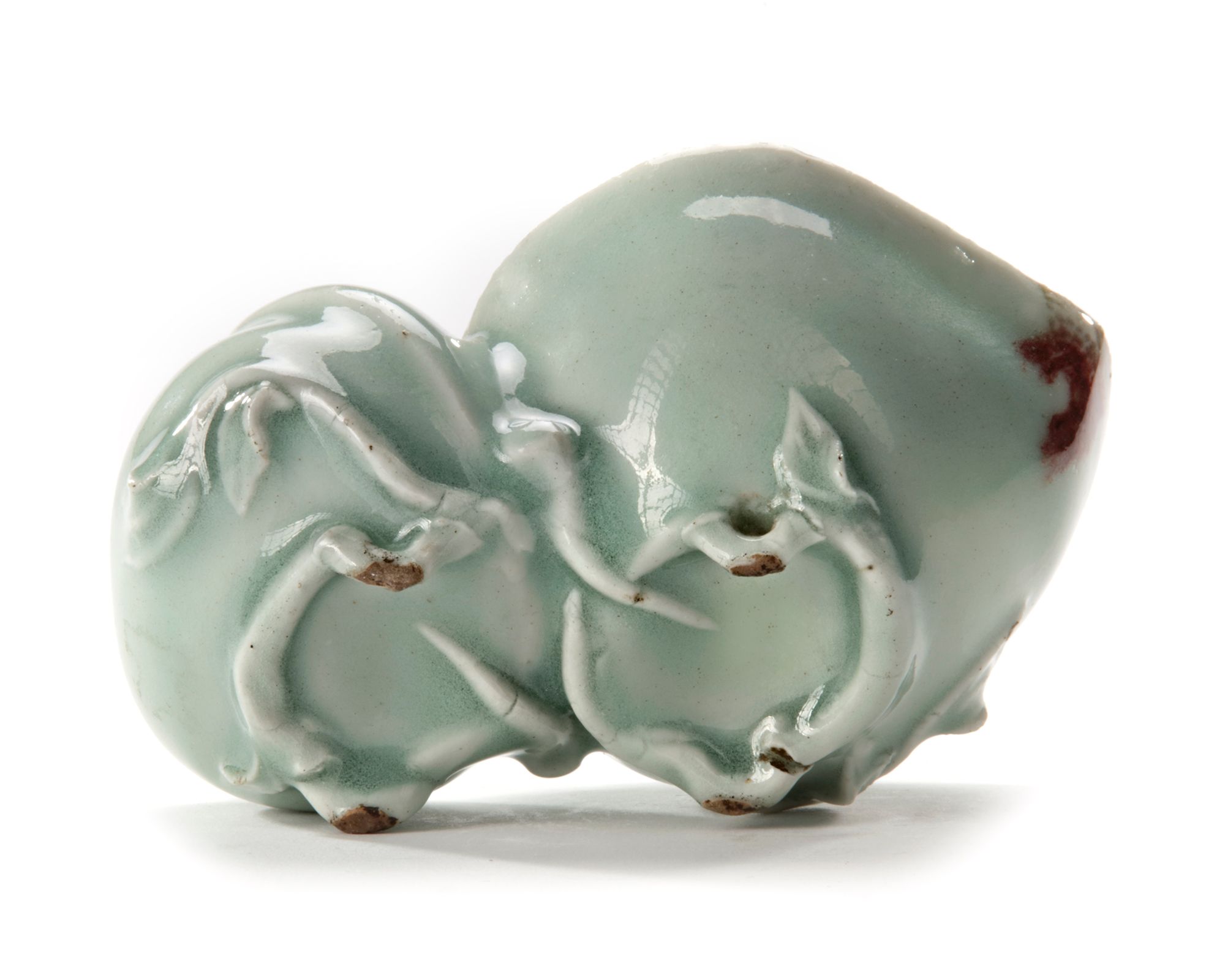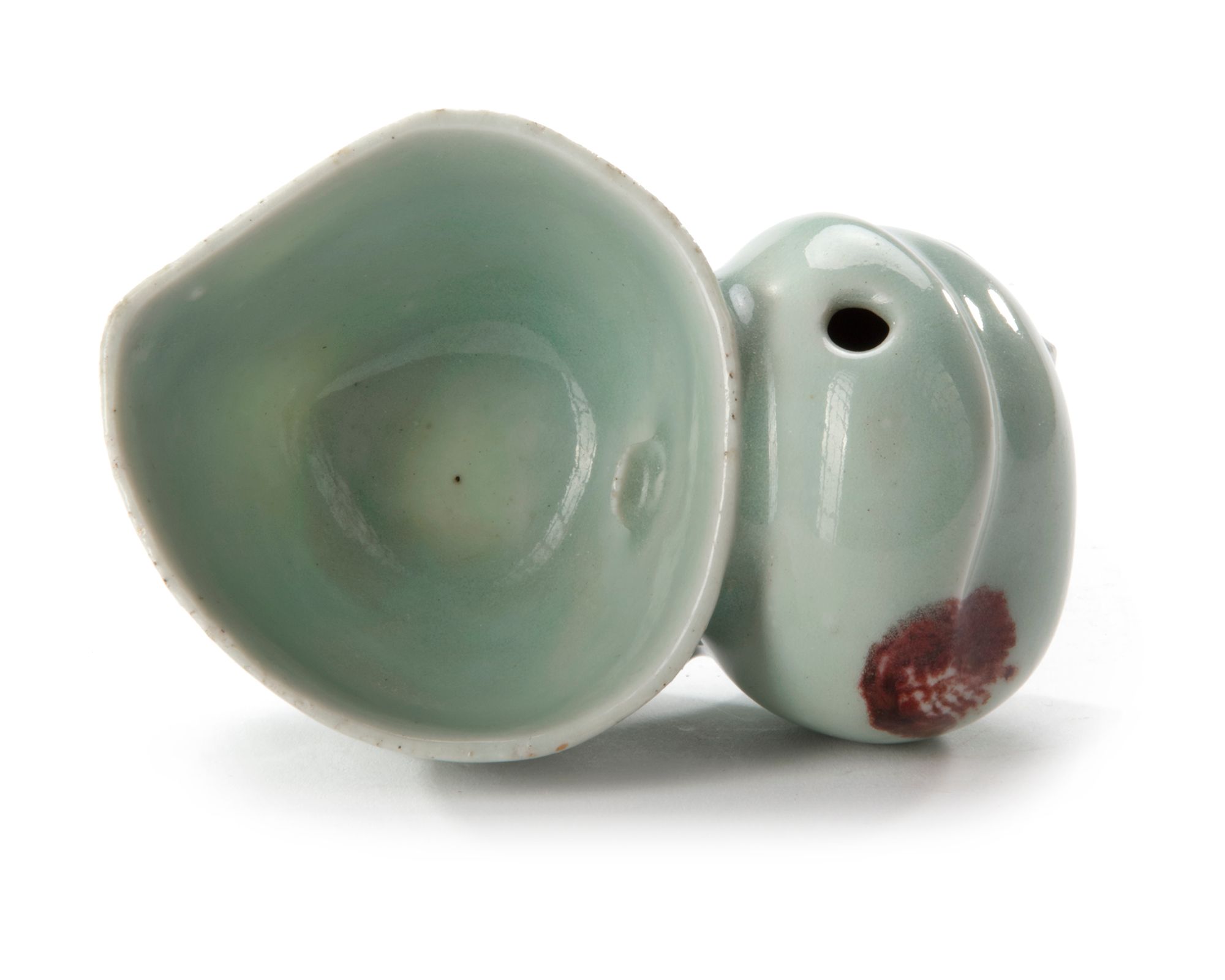The watercup and dropper combined in the shape of a peach and seed-pod, the stem forming a short handle, and a small pod the brush rest, with leaves and stalks around the base and forming the feet. The two parts have a communicating water channel, covered in purple splashed olive- green glaze.