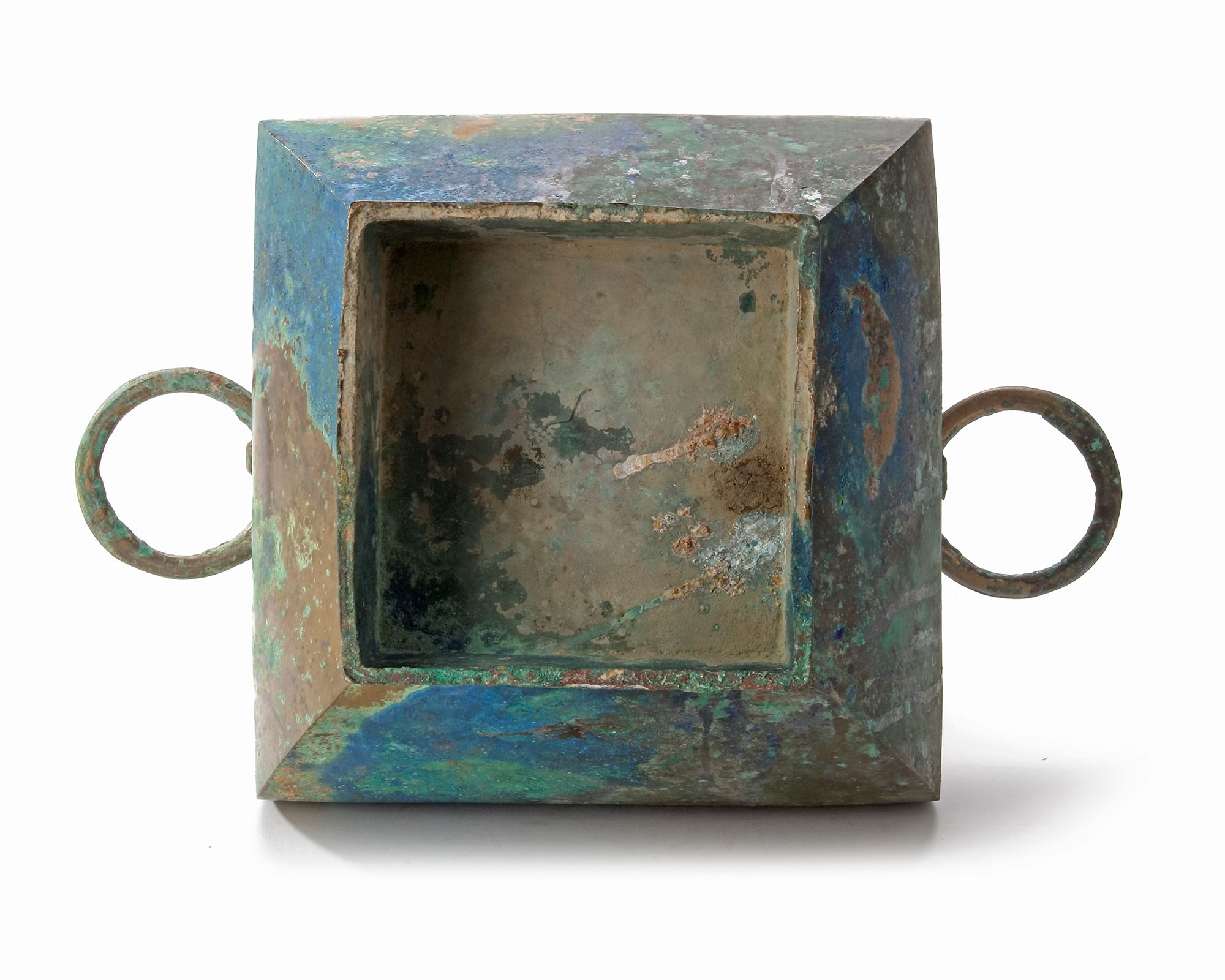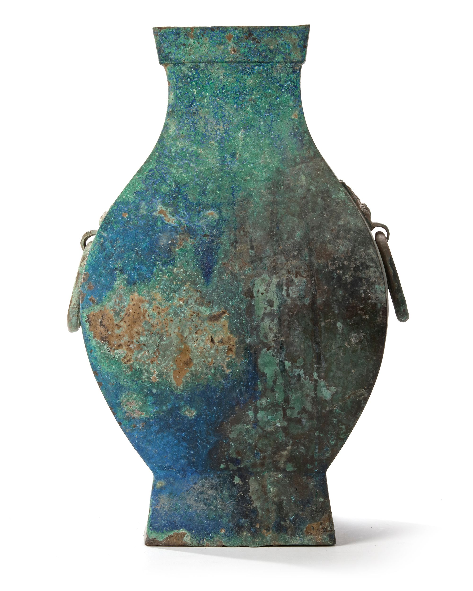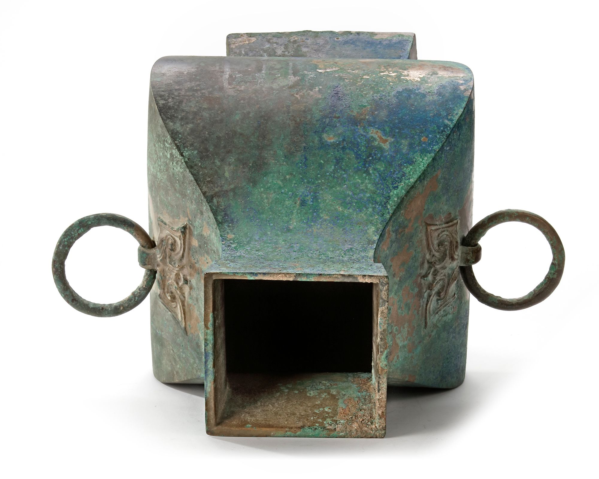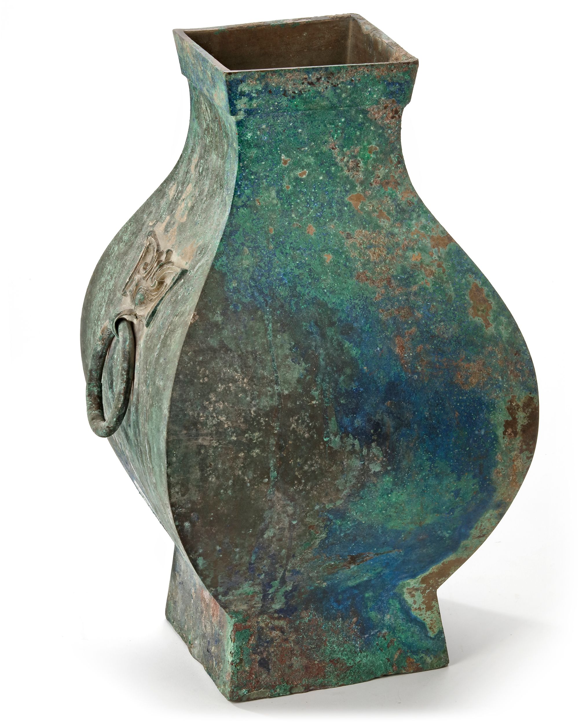 The bulbous body of the square-form vase is decorated with a pair of taotie-mask handles with loose rings, supported on a tall spreading foot. The bronze has a mottled patina.