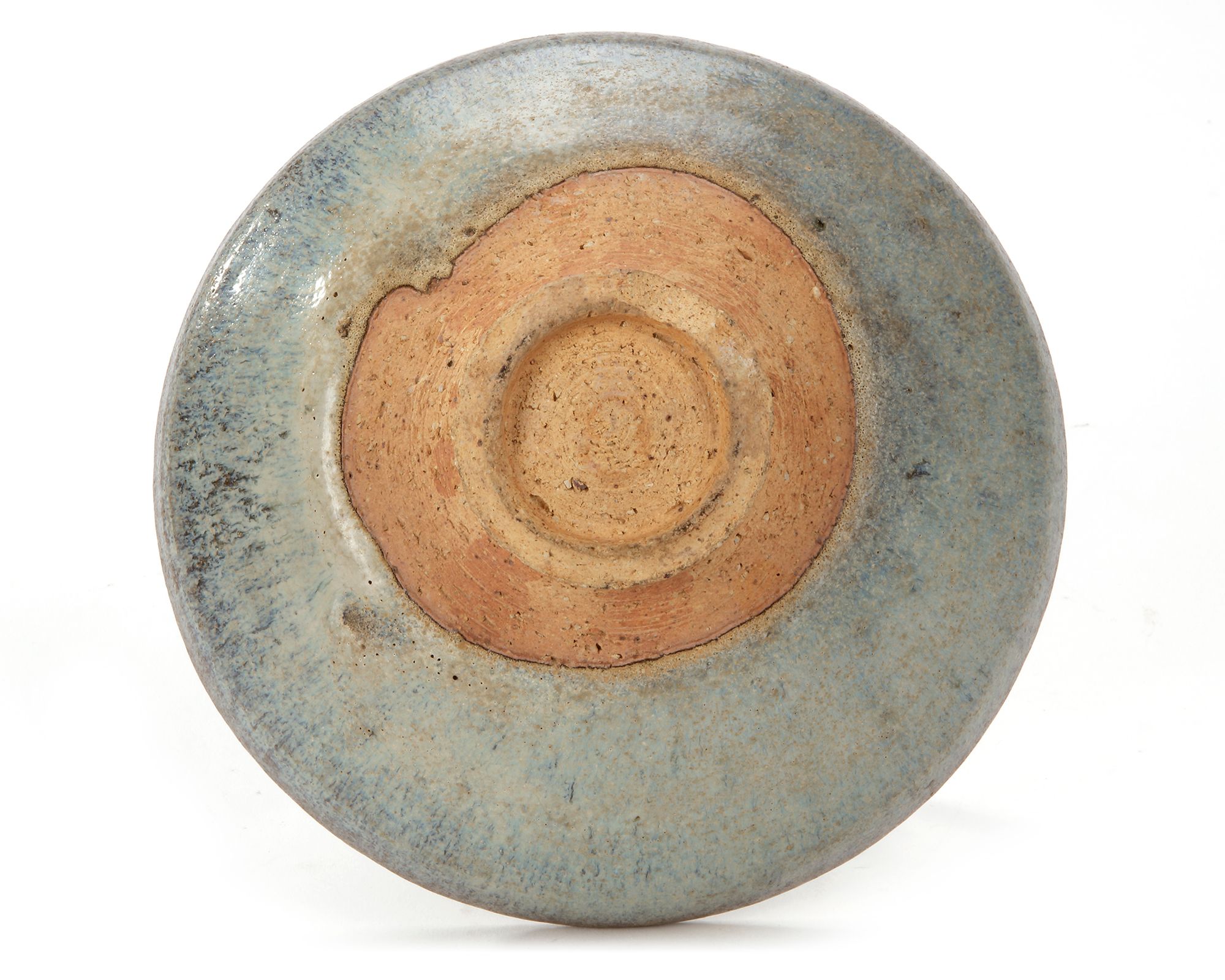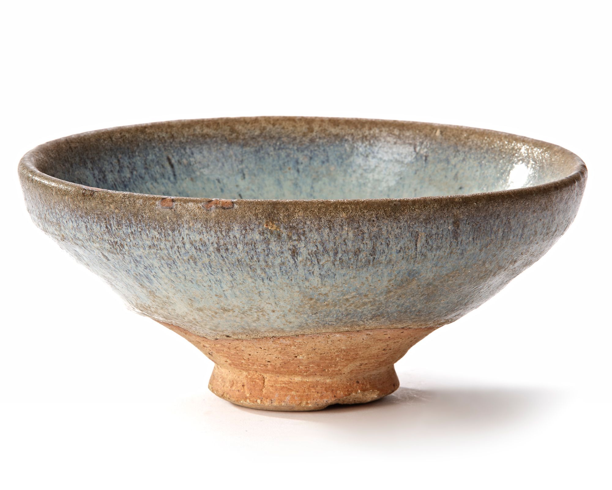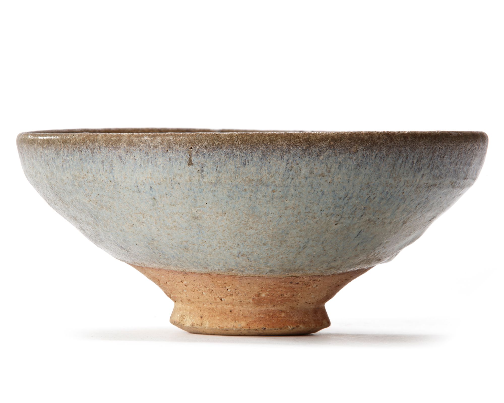 A Junyao bowl, the conical sides springing from a splayed foot and applied both inside and out with a bubble suffused glaze of milky blue tone thinning on the contracted rim showing the buff body beneath, and coagulating around the base.