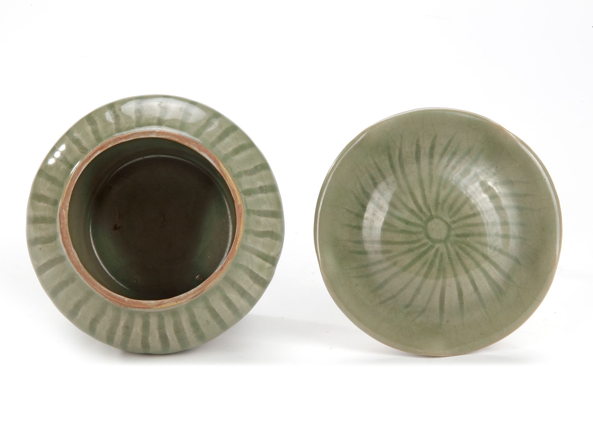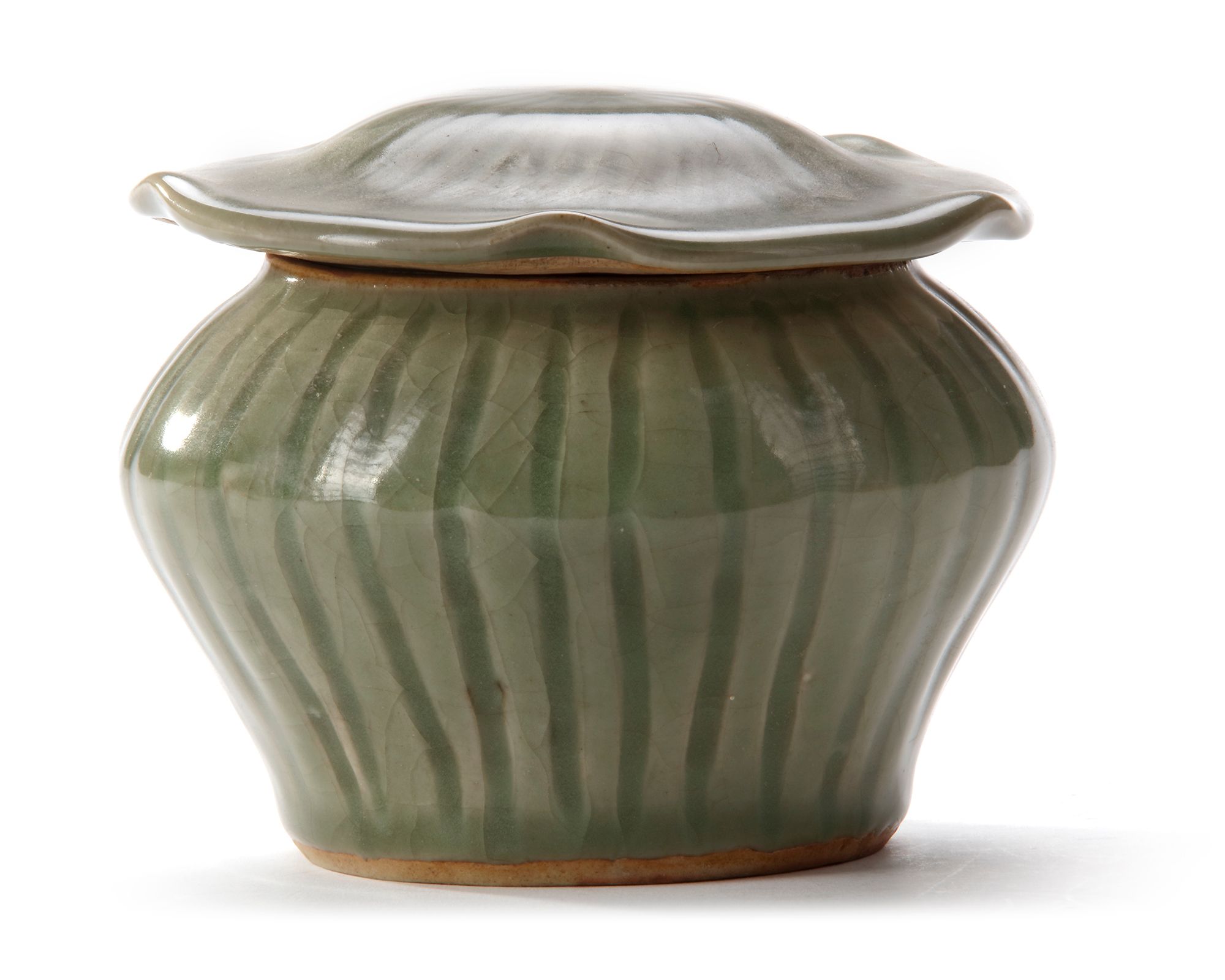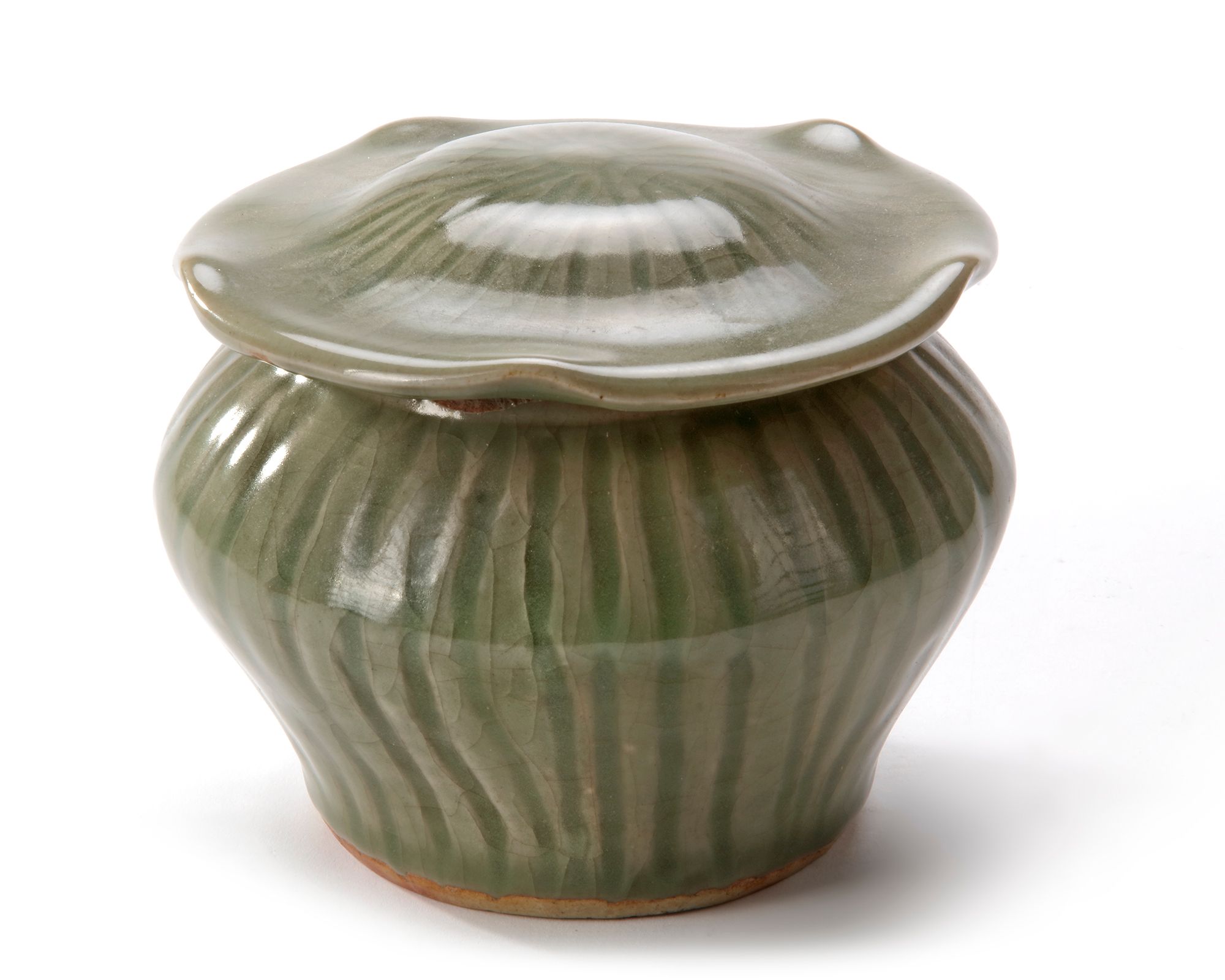 The potted jar of compressed form, moulded with vertical ribs extending from below the short neck to the thick foot, the lobed cover in the form of a lotus leaf with similarly ribbed sides, both covered overall with a finely crackled glaze of sea-green tone thinning to pale green on the ribs and stopping irregularly at the foot, exposing the buff ware.