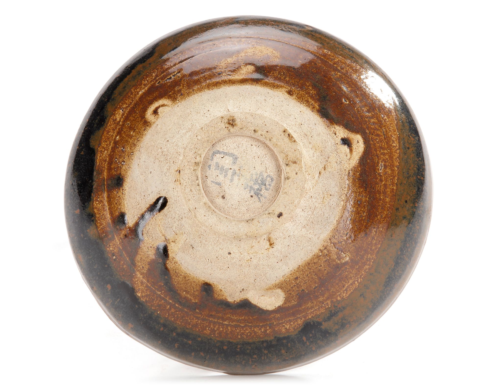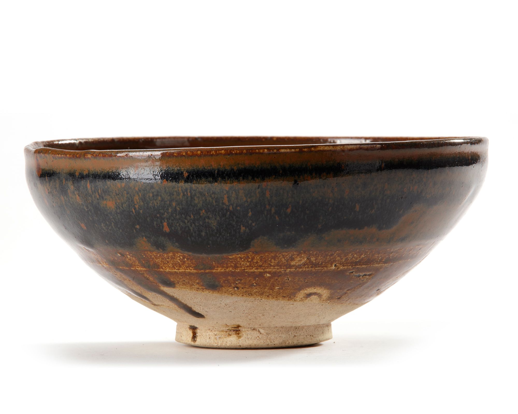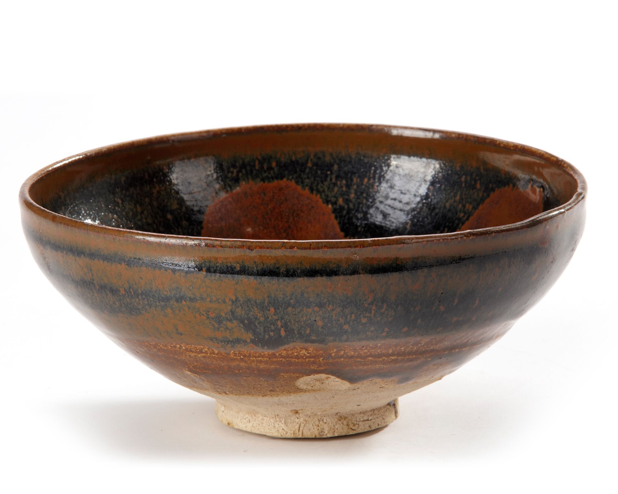 A Henan bowl of thickly potted conical form, the sides springing from a broad, knife-pared footrim and contracted at the rim, covered with black glaze with overall brownish speckling and five rust splashes on the interior, glaze falling short of the base on the underside showing the buff body.