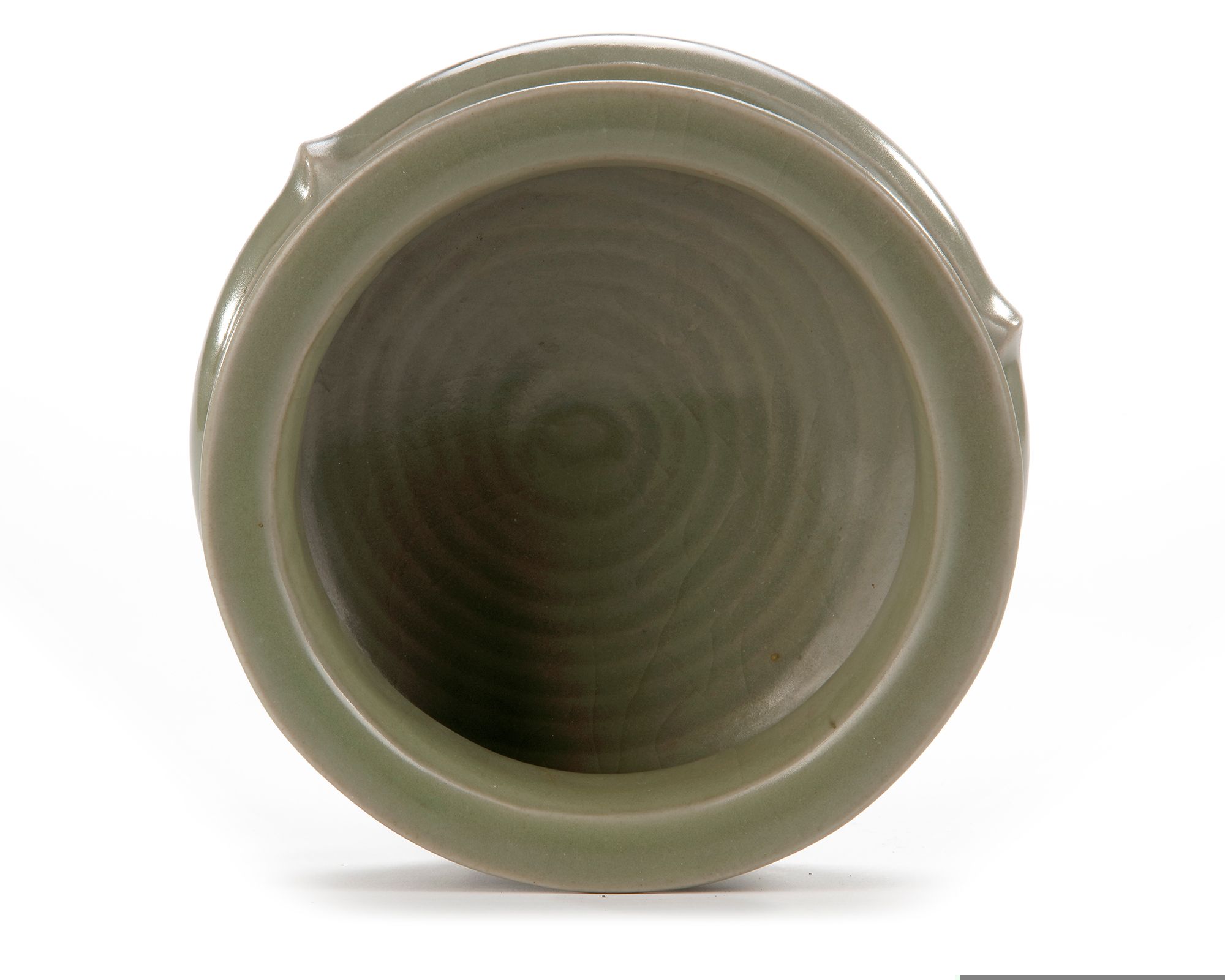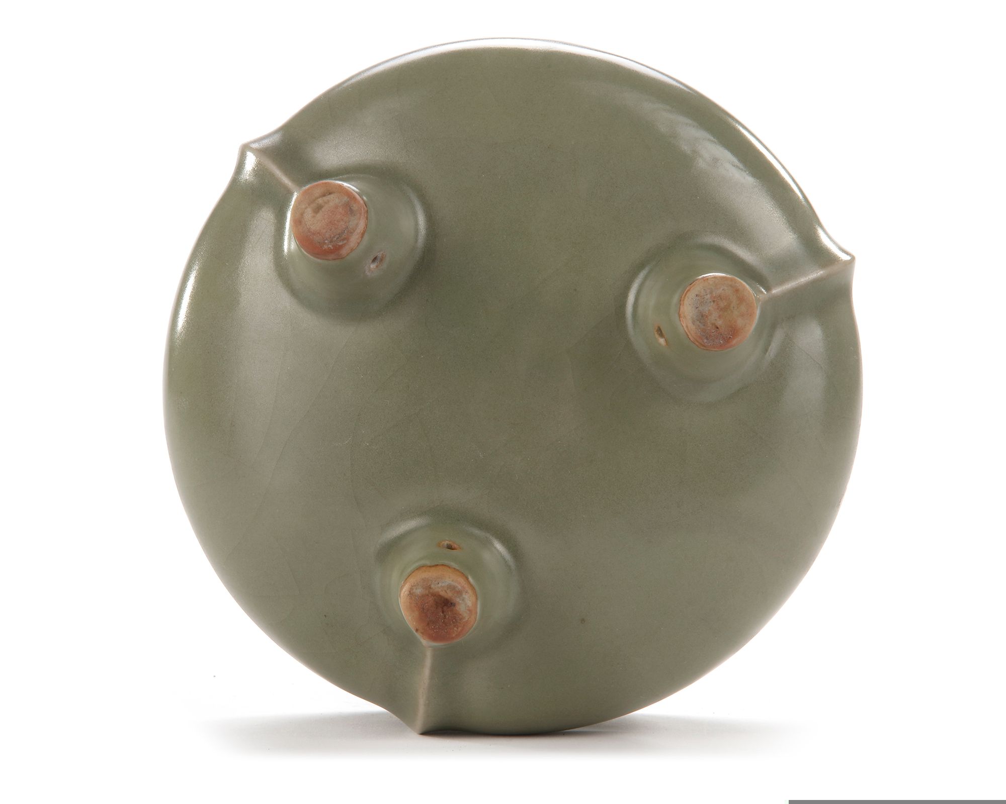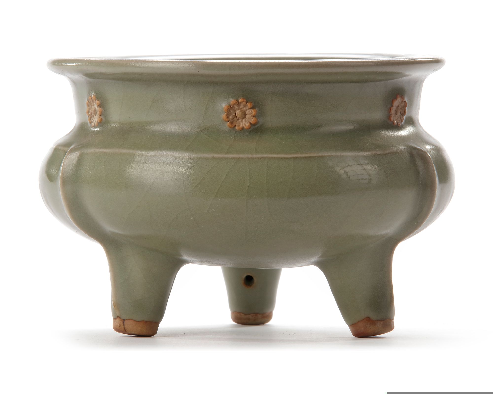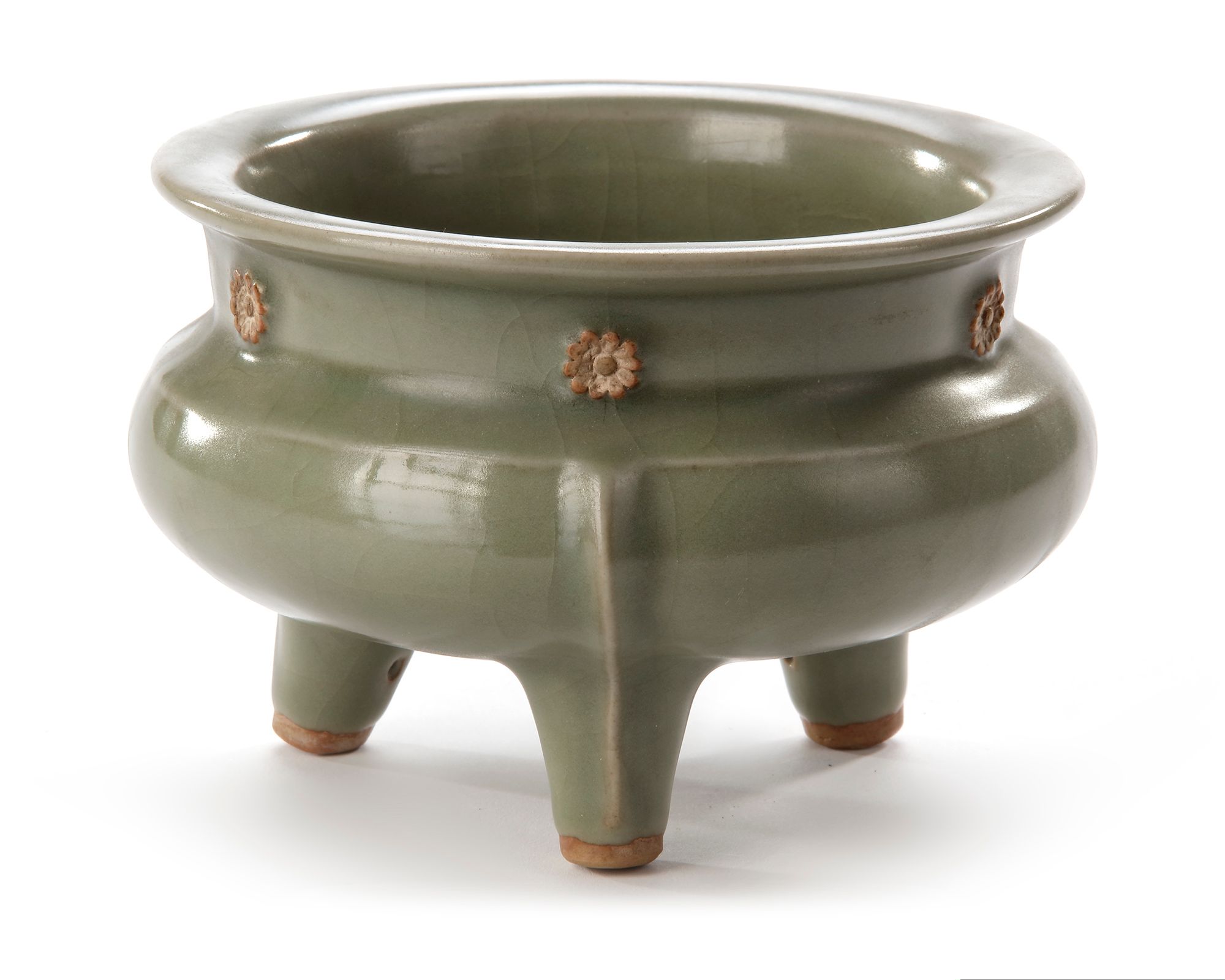 The compressed body is raised on three short feet and has a flat everted rim, unglazed floral bosses around the neck, with three narrow flanges beginning at a slight ridge on the shoulder and trailing down each leg. The censer is covered overall with a sea-green glaze of even tone.