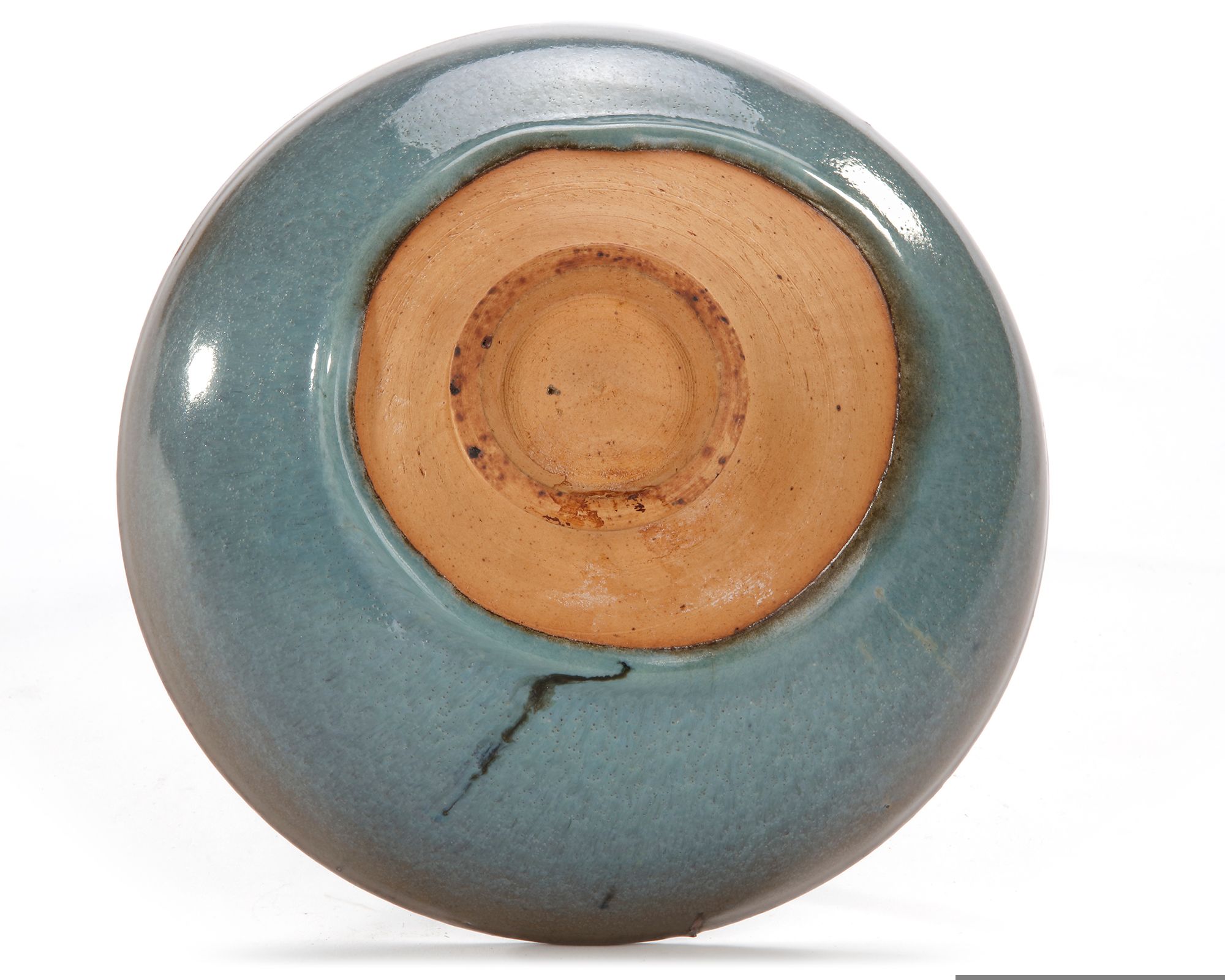 The bowl is covered with a rich pale blue glaze, falling short of the foot rim to reveal the buff stoneware body and a small purple splash to the interior.