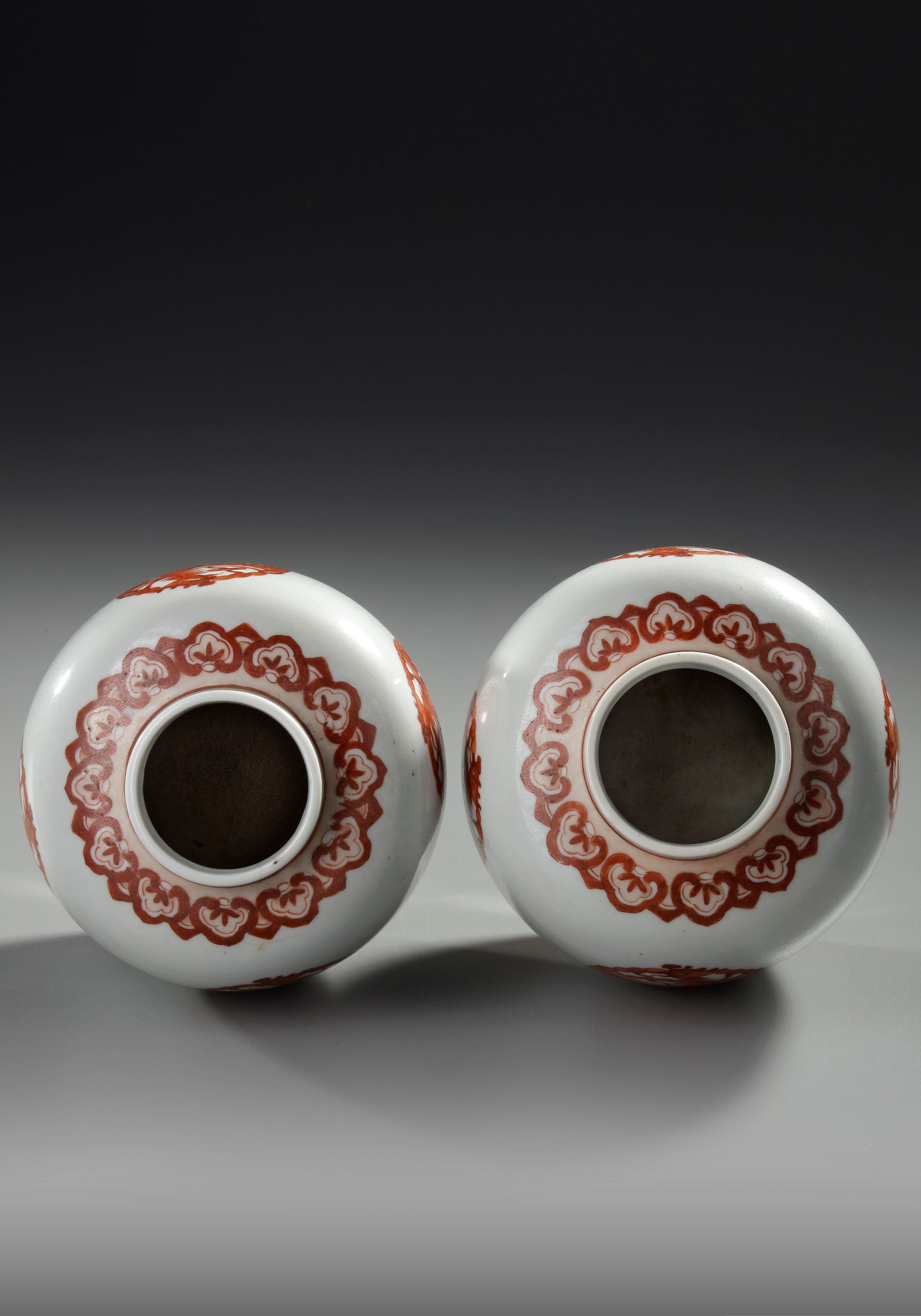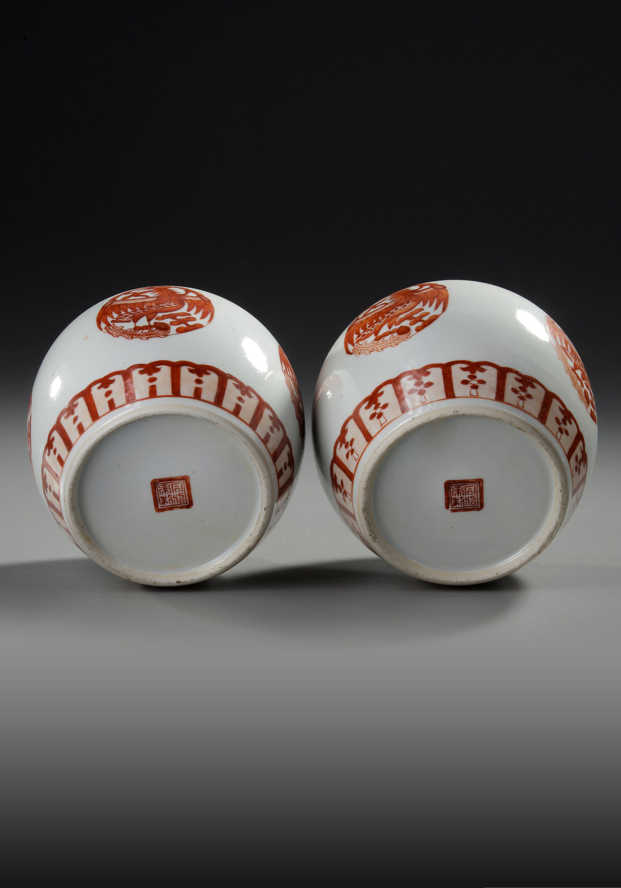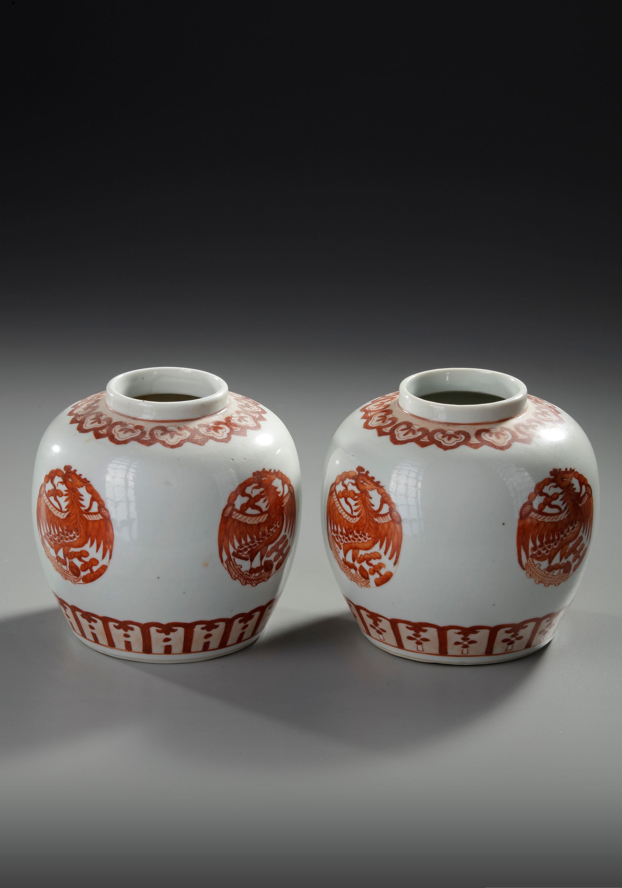 A pair of chinese porcelain pots, decorated to the body with roundels of phoenix birds, set between a band of ruyi heads to the shoulder and a lappet plantain border to the base. The bottom with a Chinese four seal character within a double square.