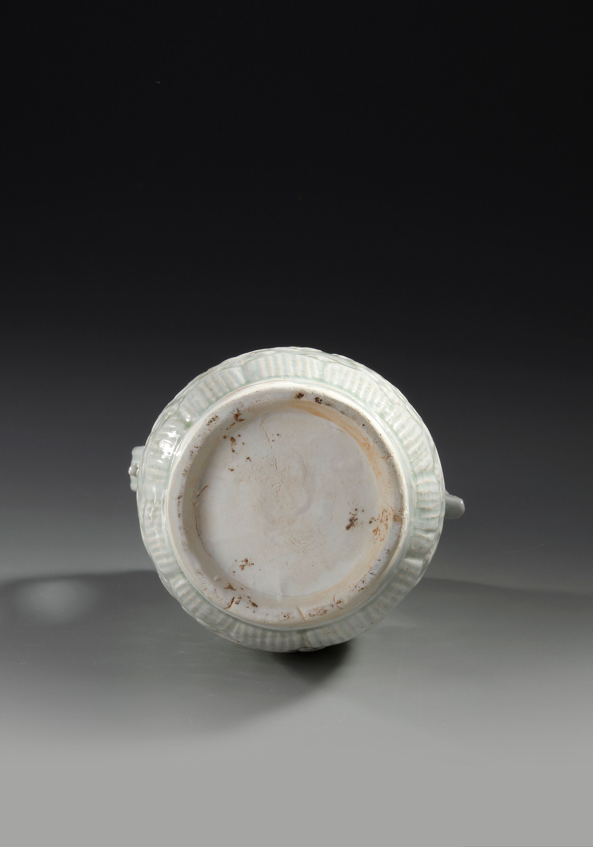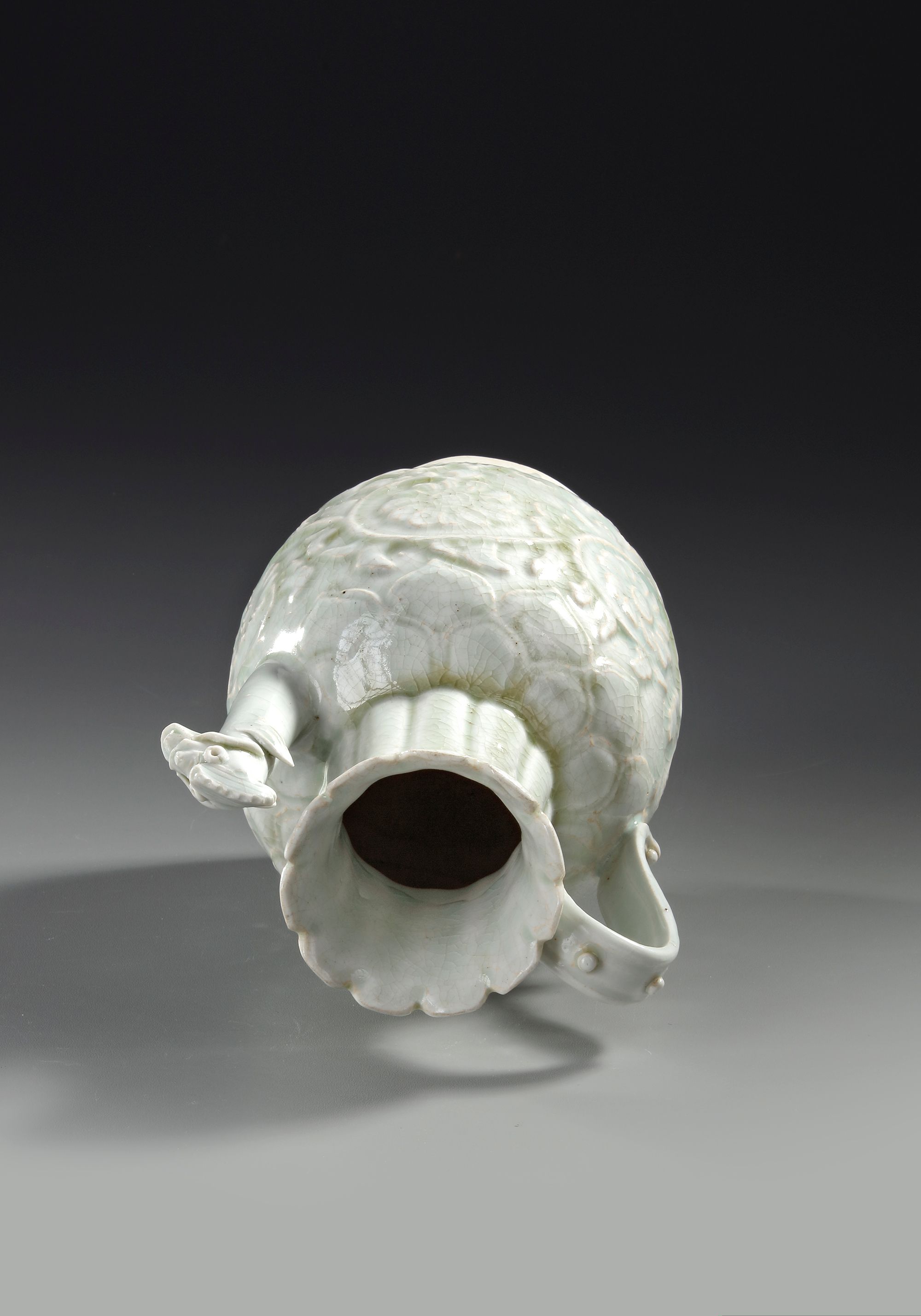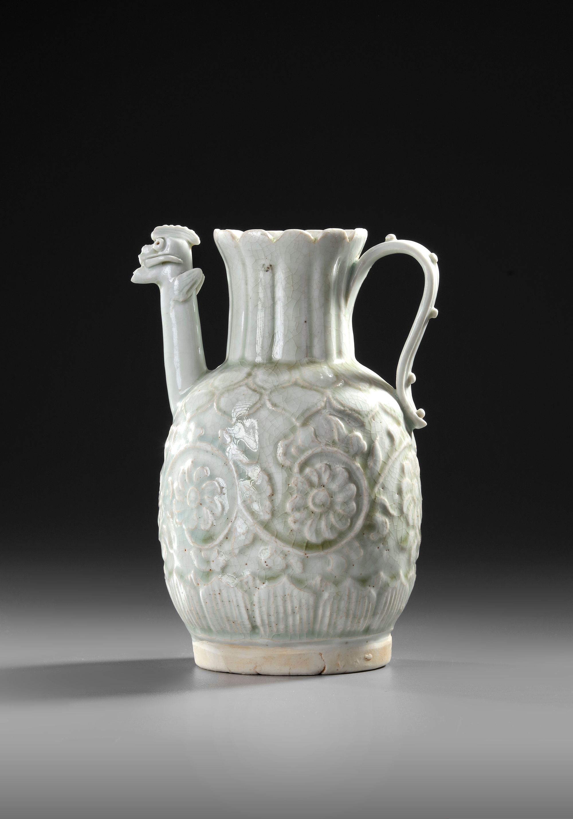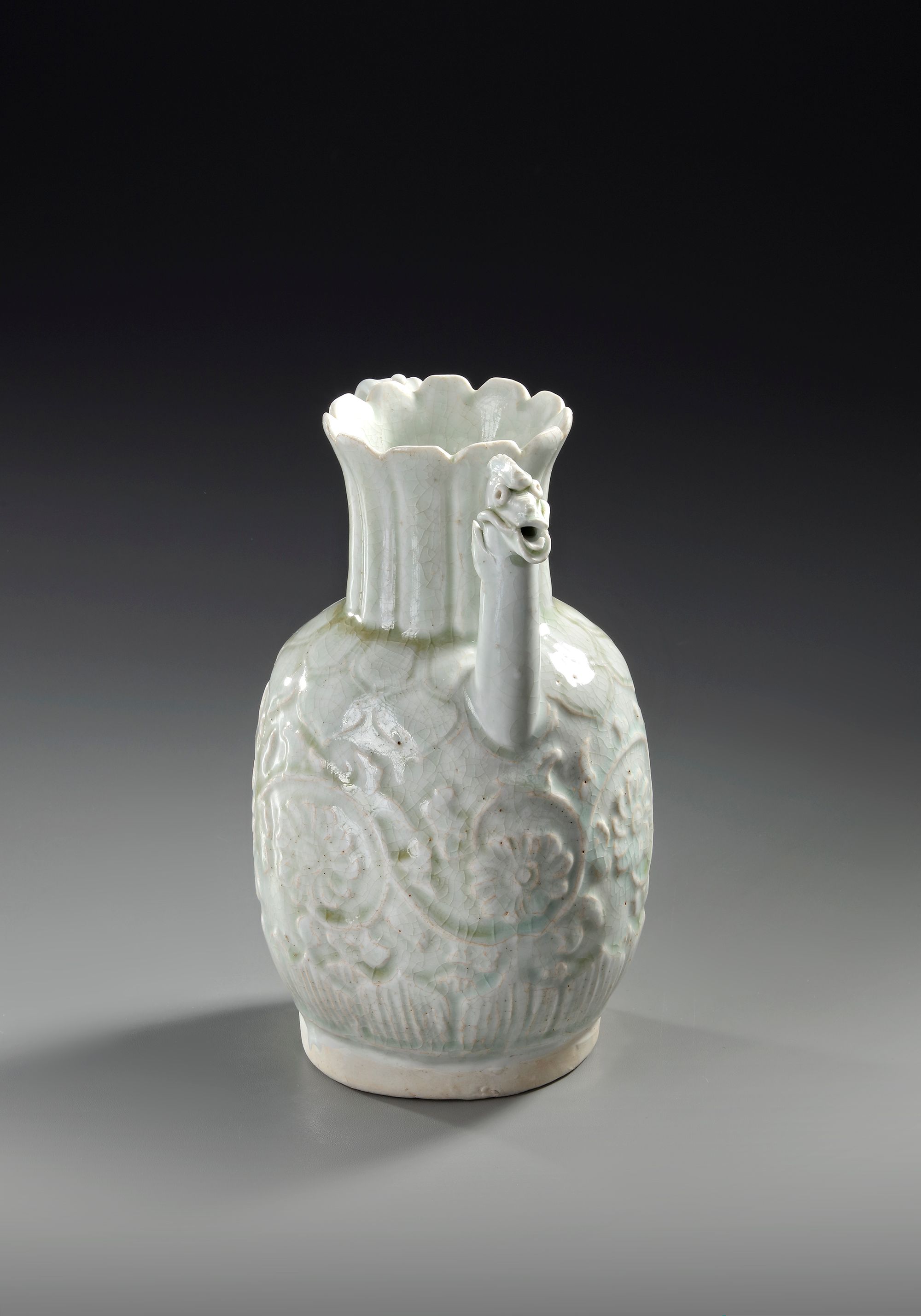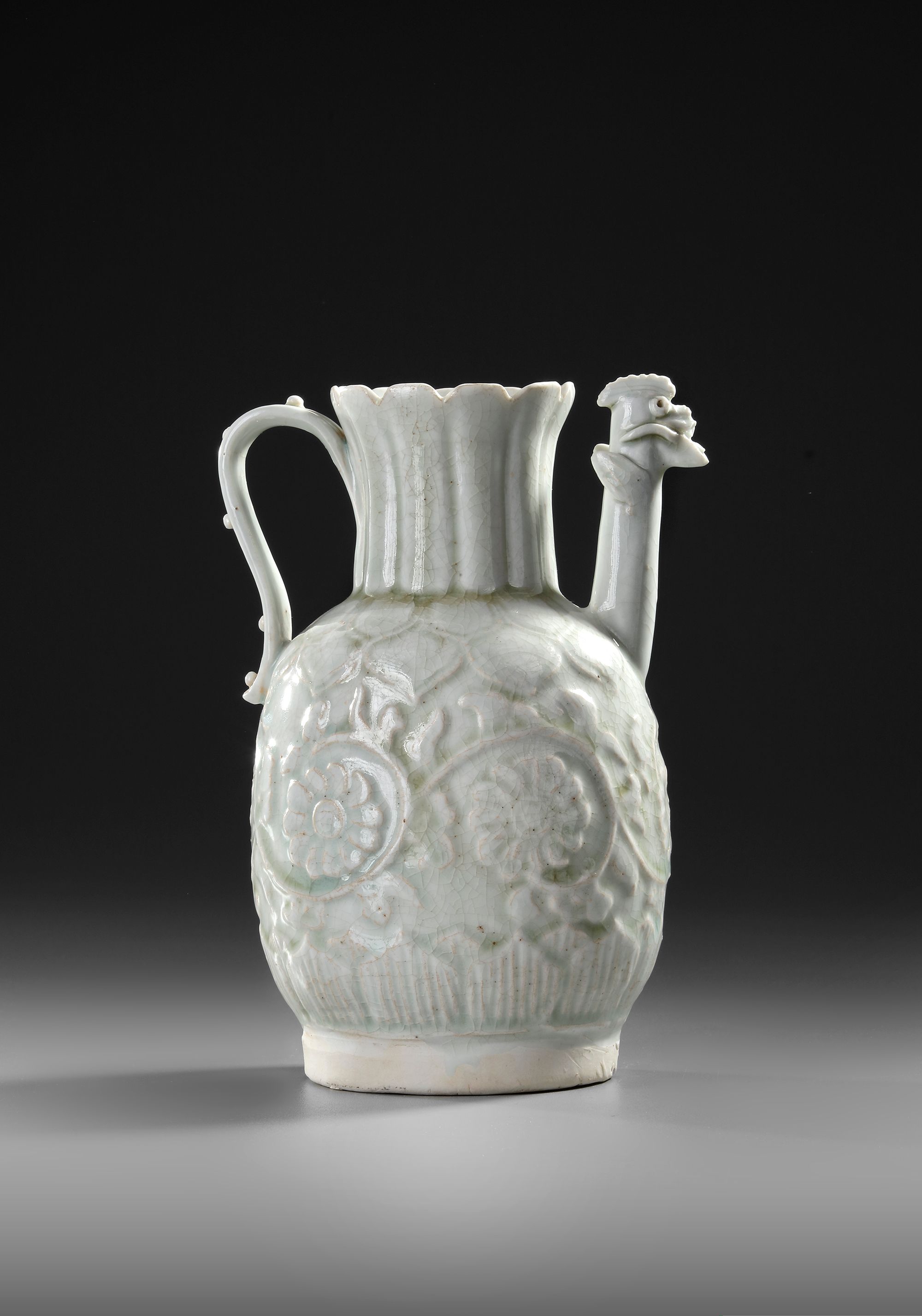 A Chinese porcelain ewer, the ovoid body rising to a long lobbed neck and an everted rim, a strap handle opposite the chicken head spout. The body applied and incised with floral leafy sprays between two bands of leaves and a petal lappet border to the base. The ewer is covered overall in a pale blue transparent glaze.