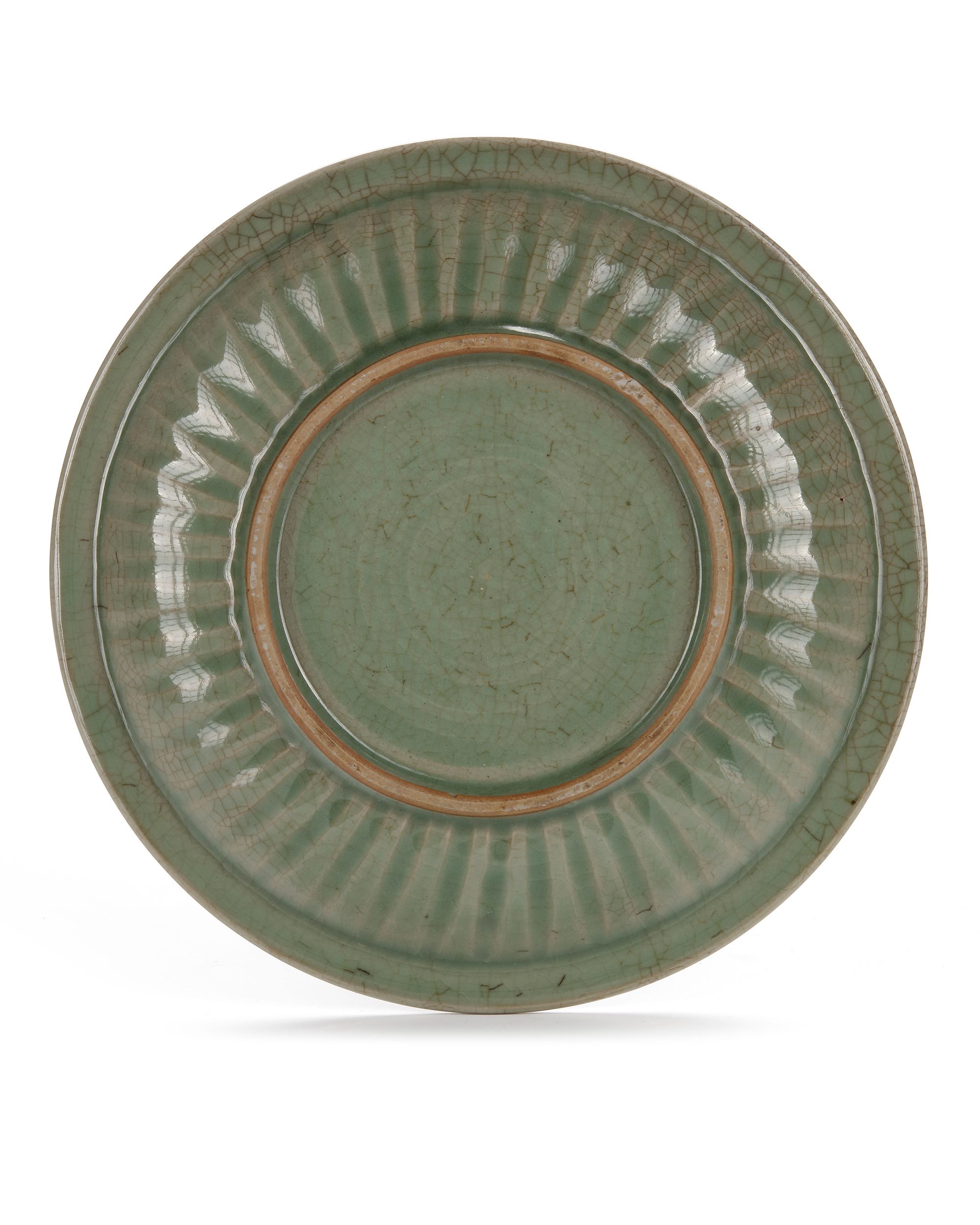 The dish is sturdily potted with shallow rounded sides rising to an everted rim. The interior is decorated in relief with a scaly four-clawed dragon leaping amidst fiery pearls surrounded by a wave inner border, floral bosses around the rim.The exterior is carved with chrysanthemum petals. The dish is covered overall in a glaze of sea-green colour, except an unglazed circle on the base burnt orange in the firing.