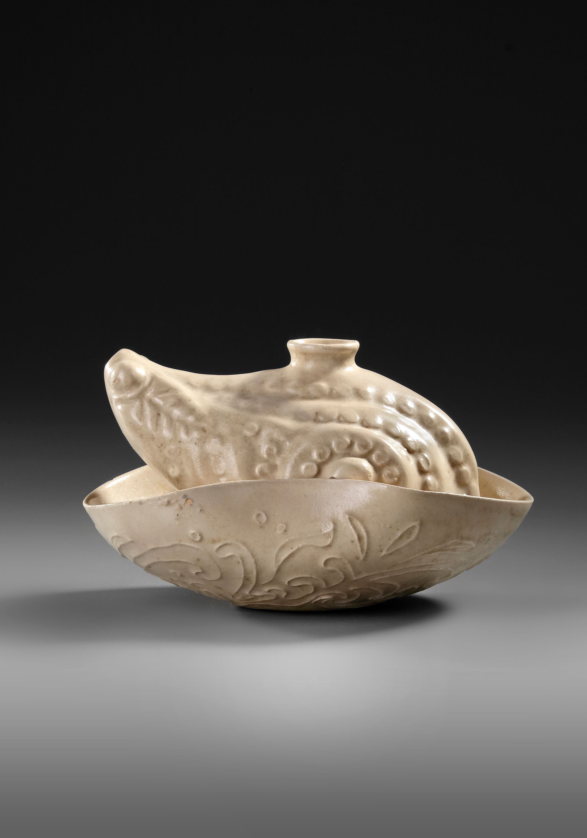 The large water dropper is moulded in the shape of a crouching frog with a circular aperture on its back and a short spout issuing from its mouth, seated on an attached bowl carved with floral leafy sprays.