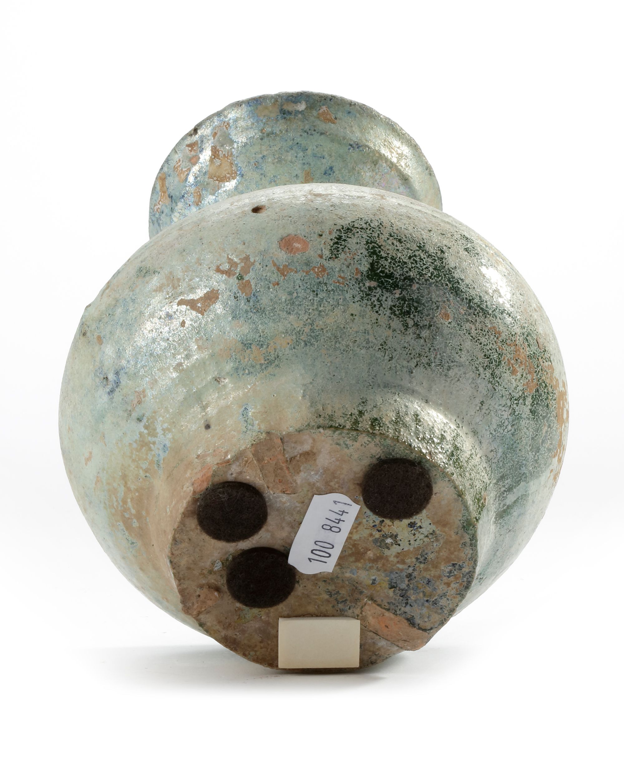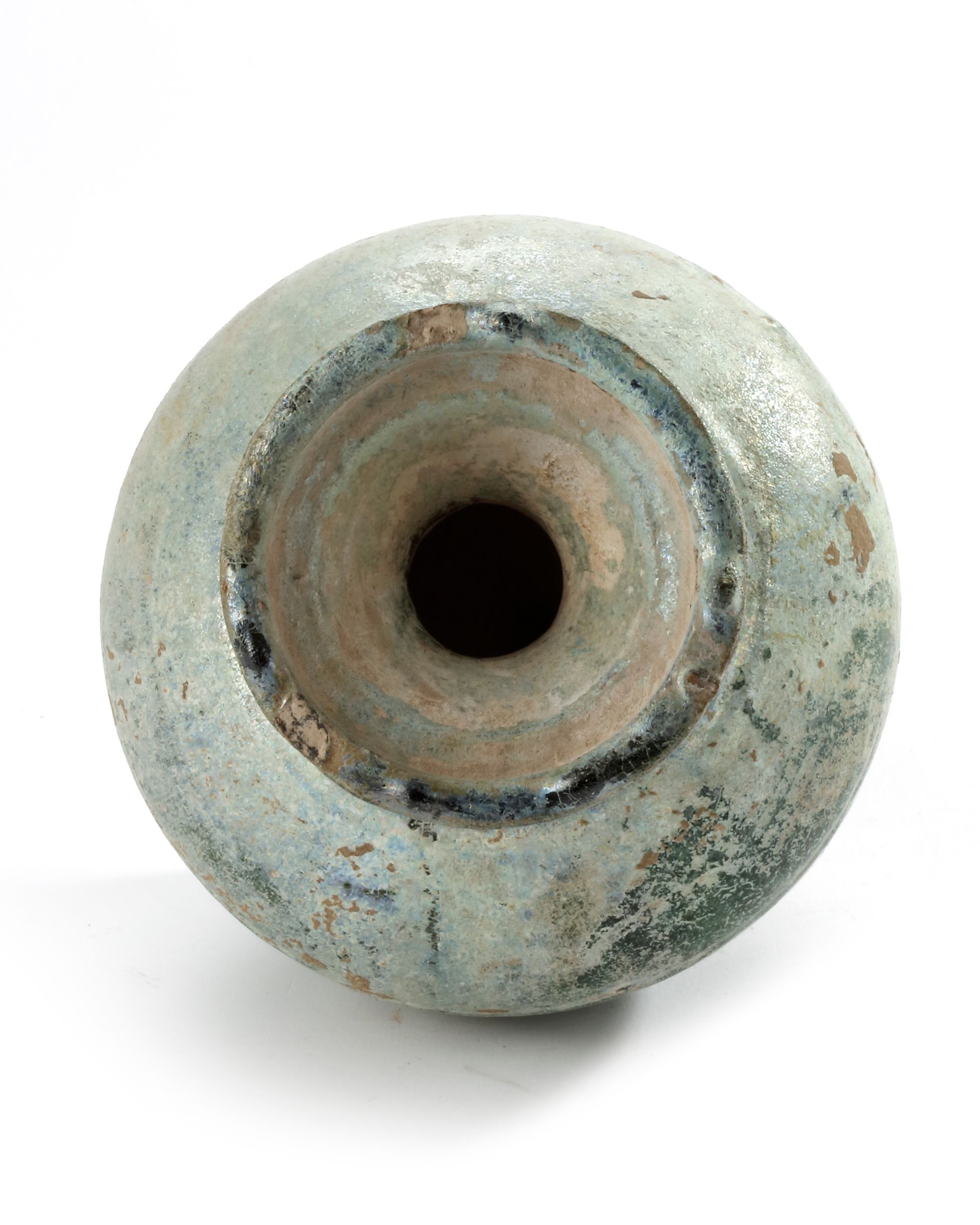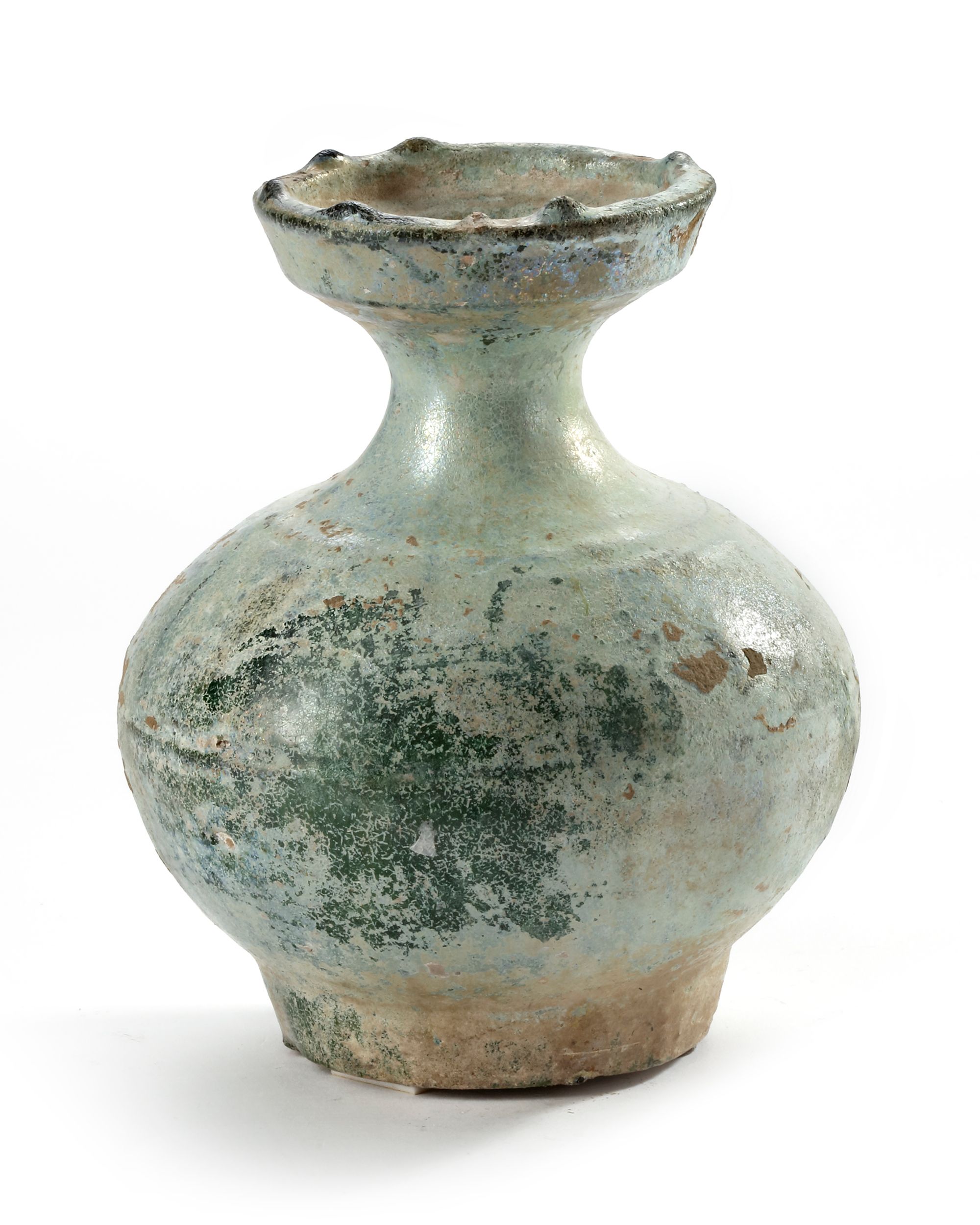 The jar with a compressed globular body tapering towards a flat base and surmounted by a waisted neck with flared galleried rim, the glaze degraded to an overall silvery tone.