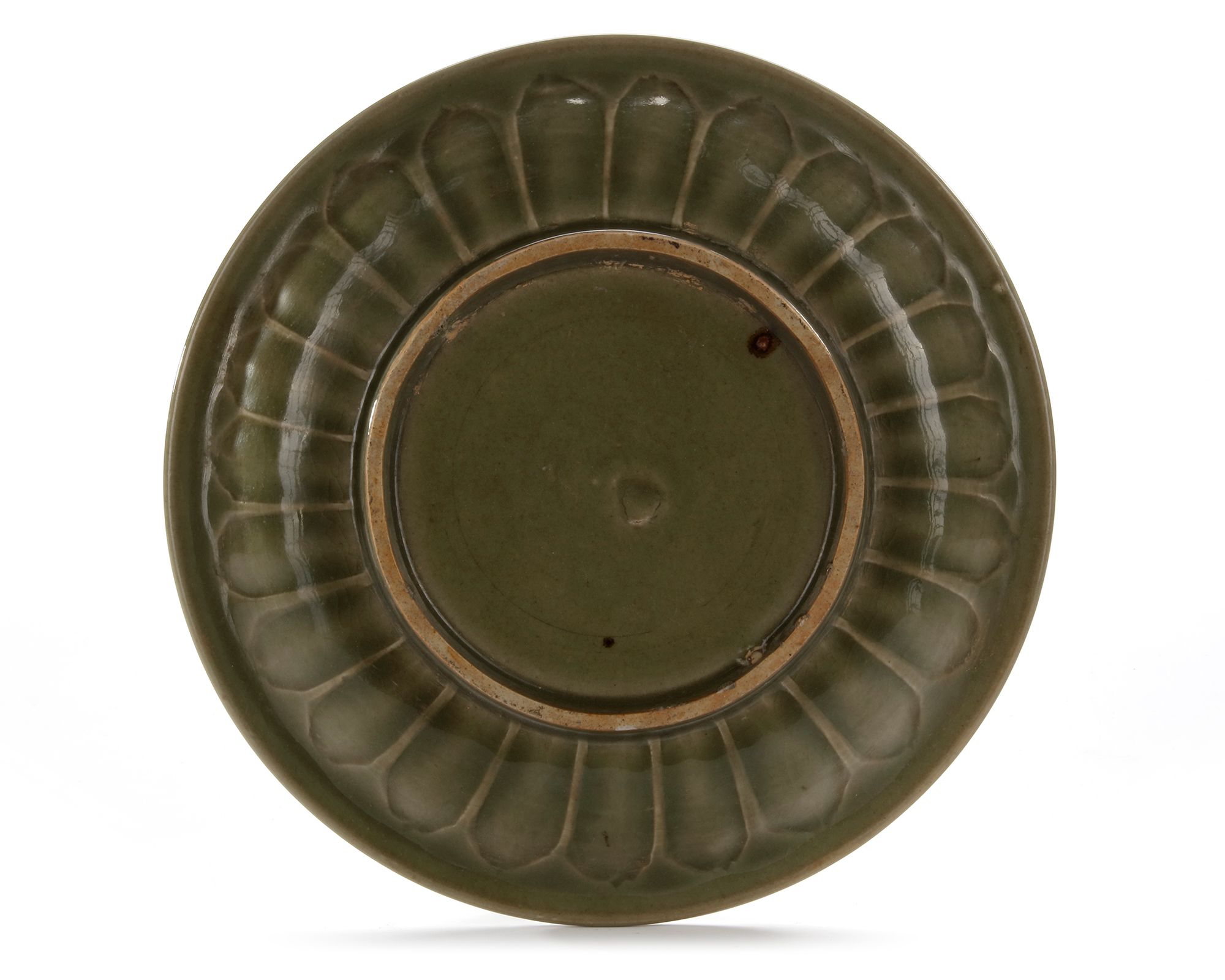 The moulded fluted exterior is carved with a lotus petal band. The dish is covered overall with a sea-green glaze which highlights the raised and carved design, the base has an unglazed ring which has fired orange.