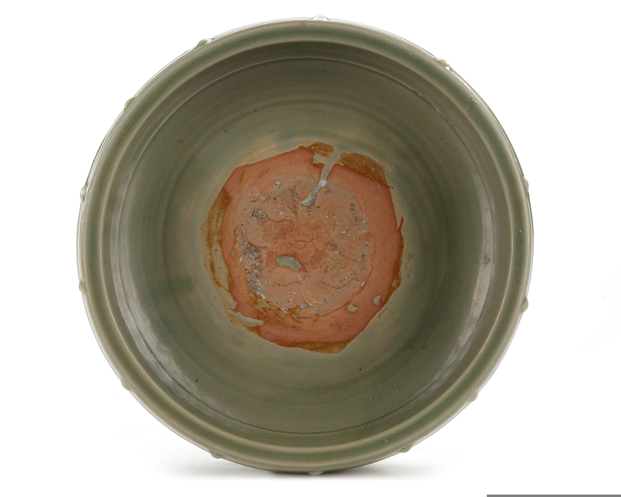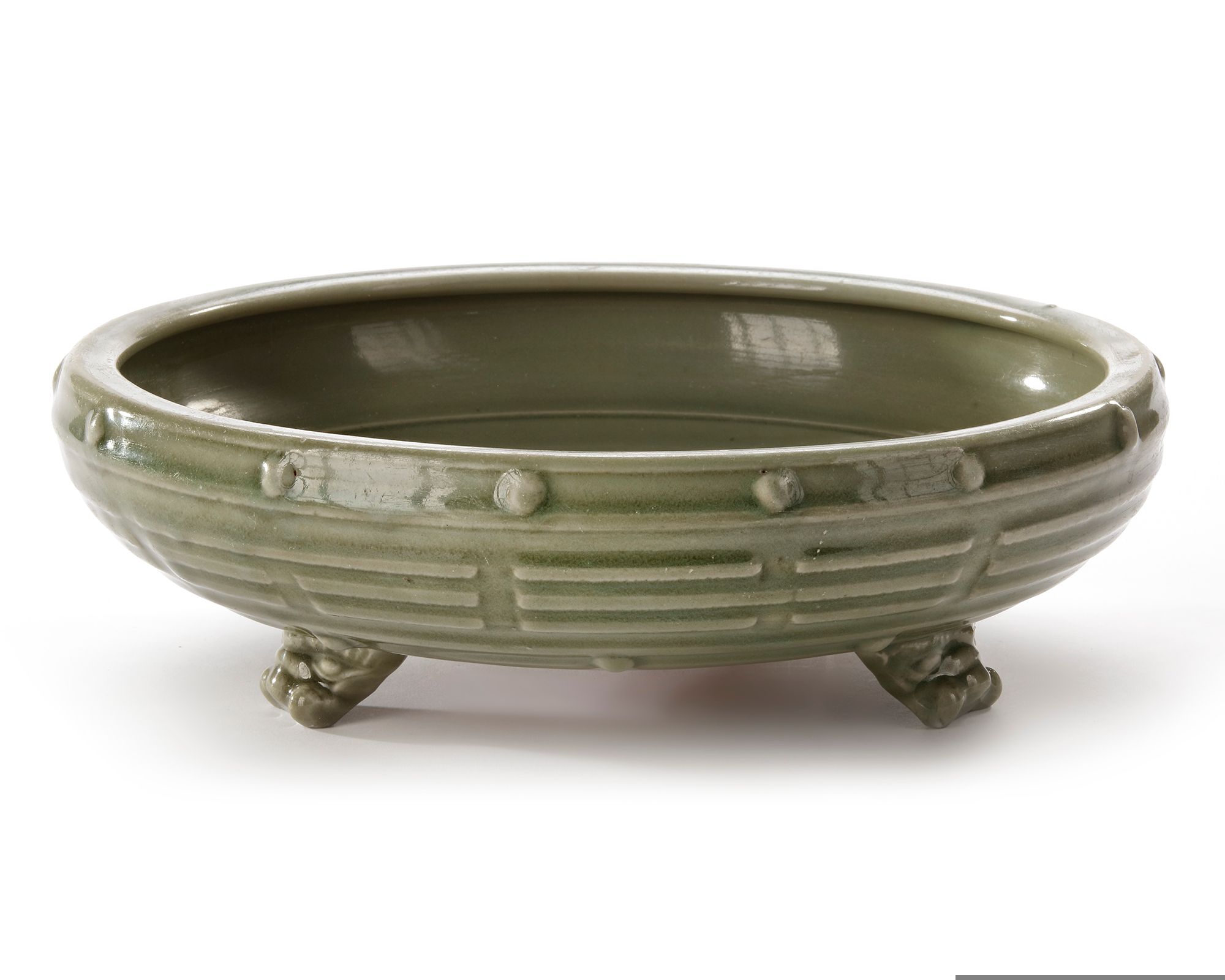 Ceramics robustly potted and raised on three mask-and-paw feet, the shallow rounded sides carved with the 'Eight Trigrams', between bands of applied bosses encircling the incurved rim and base, covered with a lustrous sea-green glaze falling short of the center of the interior and the raised beveled disc on the base, both burnt orange in the firing.