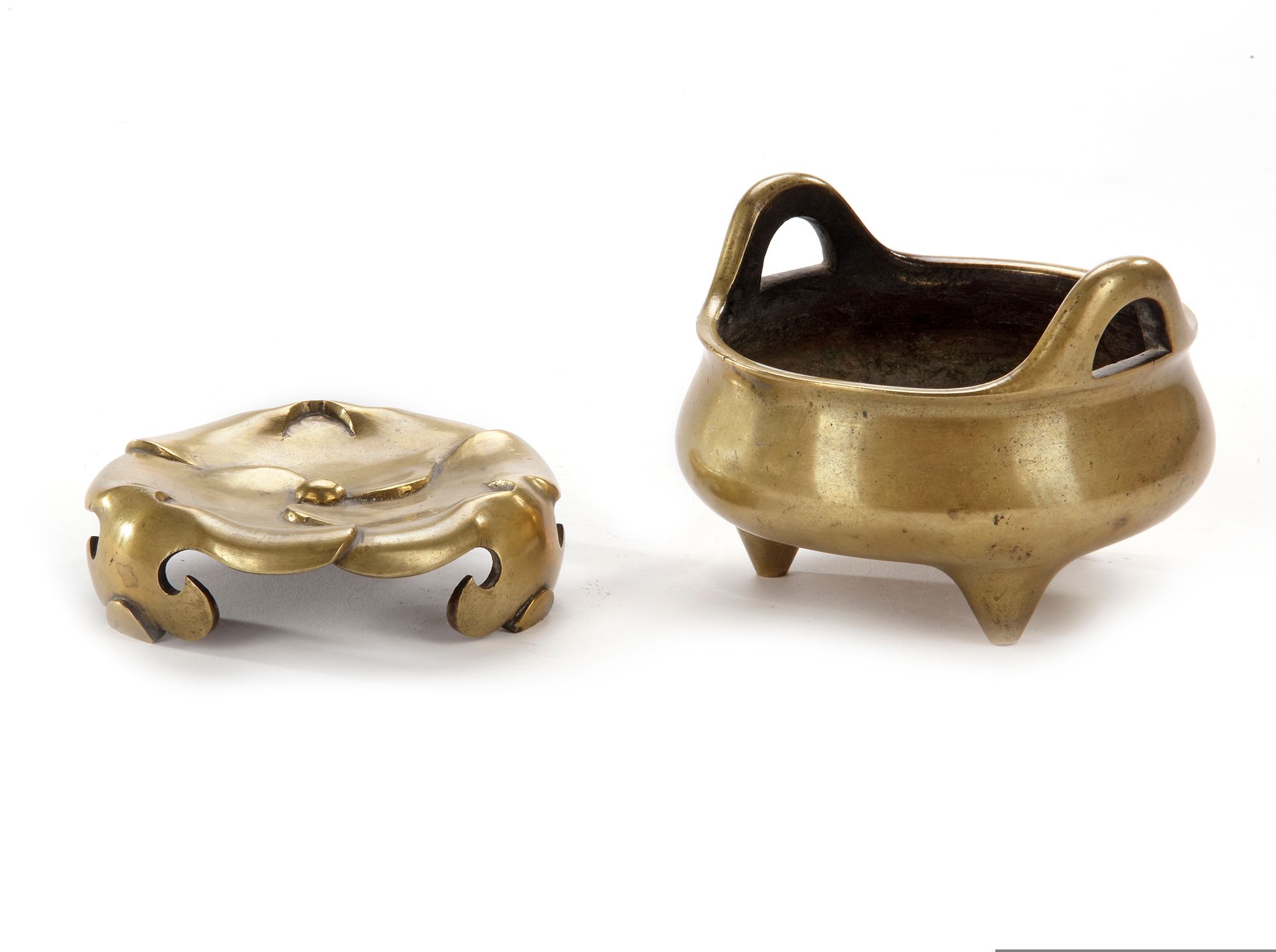 A GILT CHINESE TRIPOD BRONZE CENSER AND A STAND, 18TH-19TH CENTURY