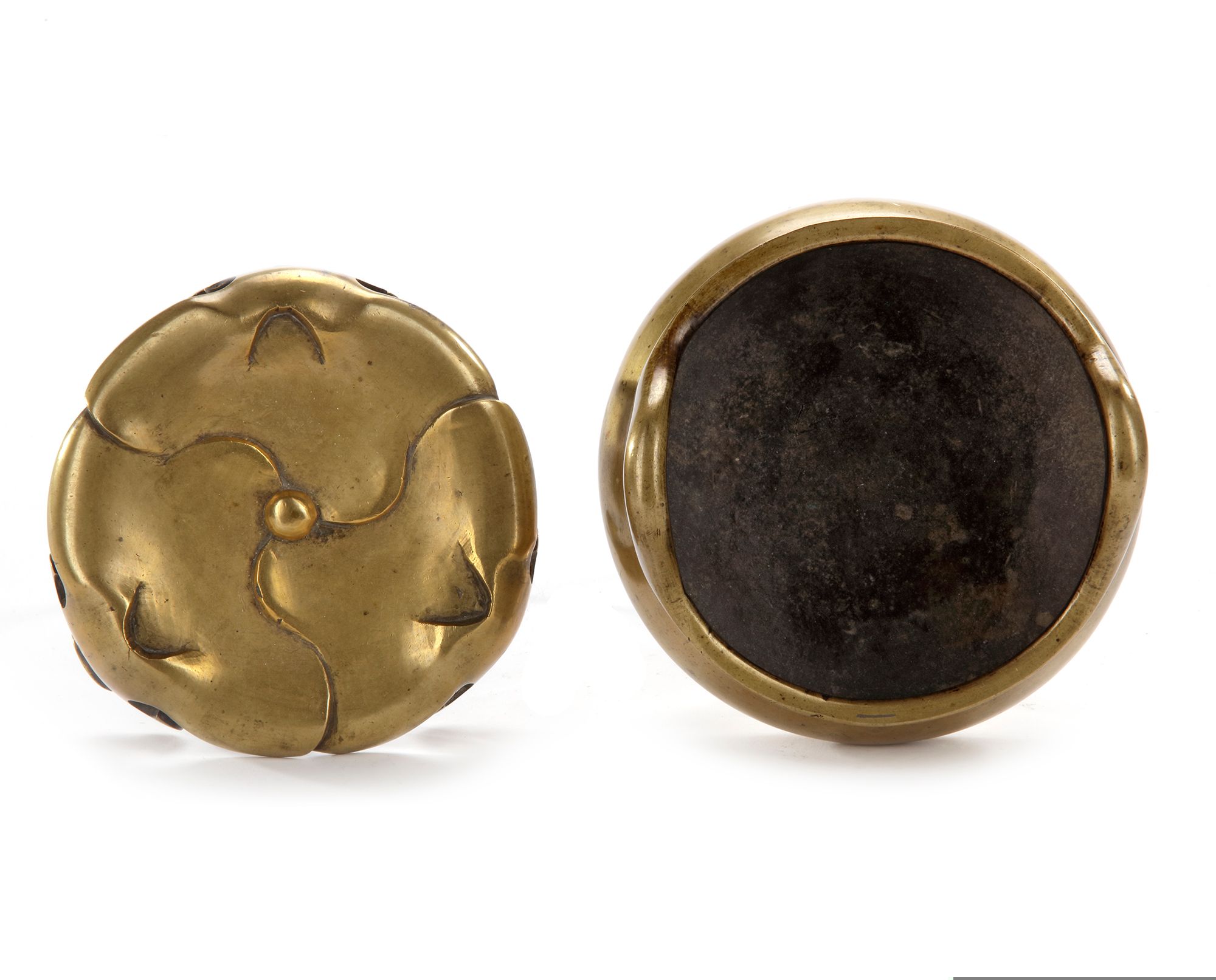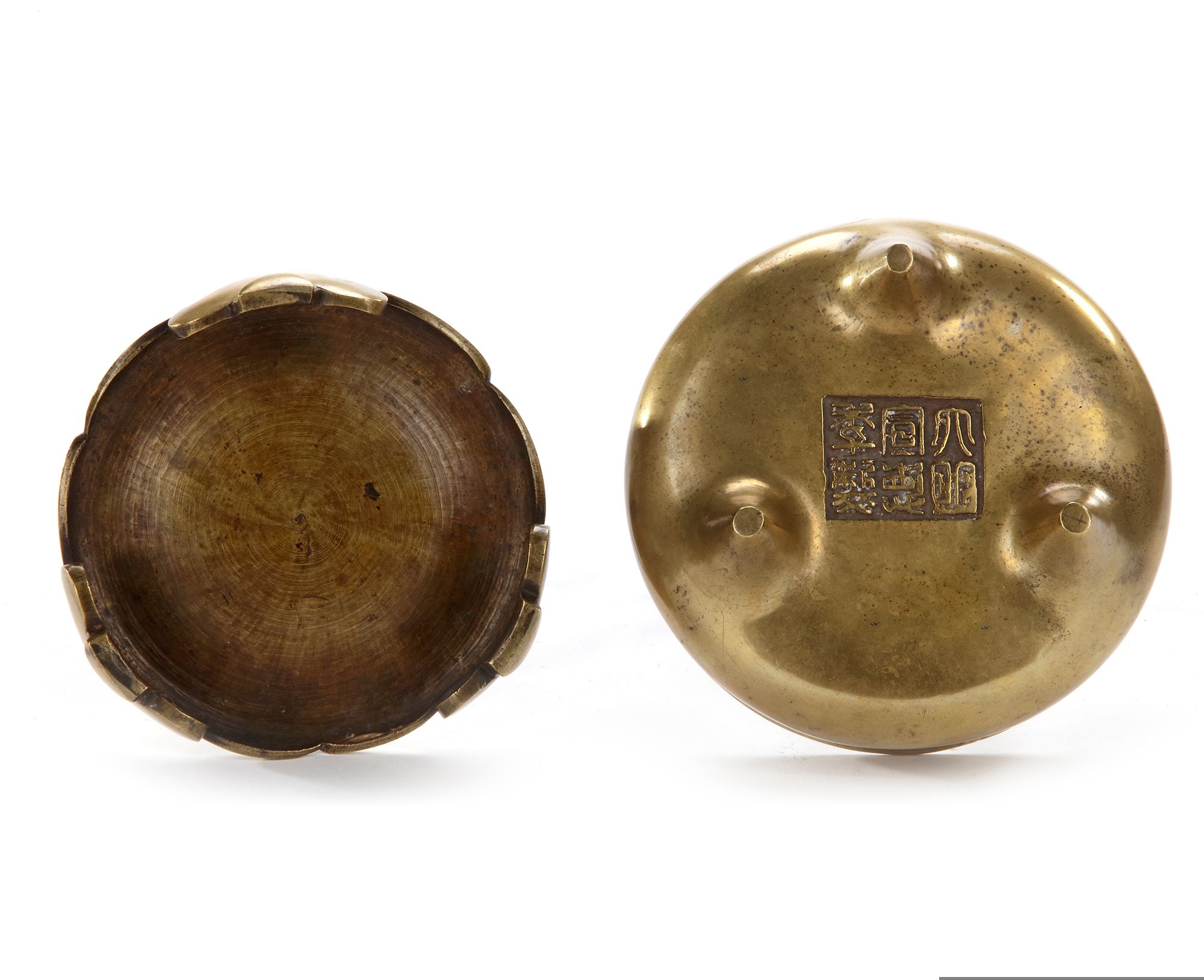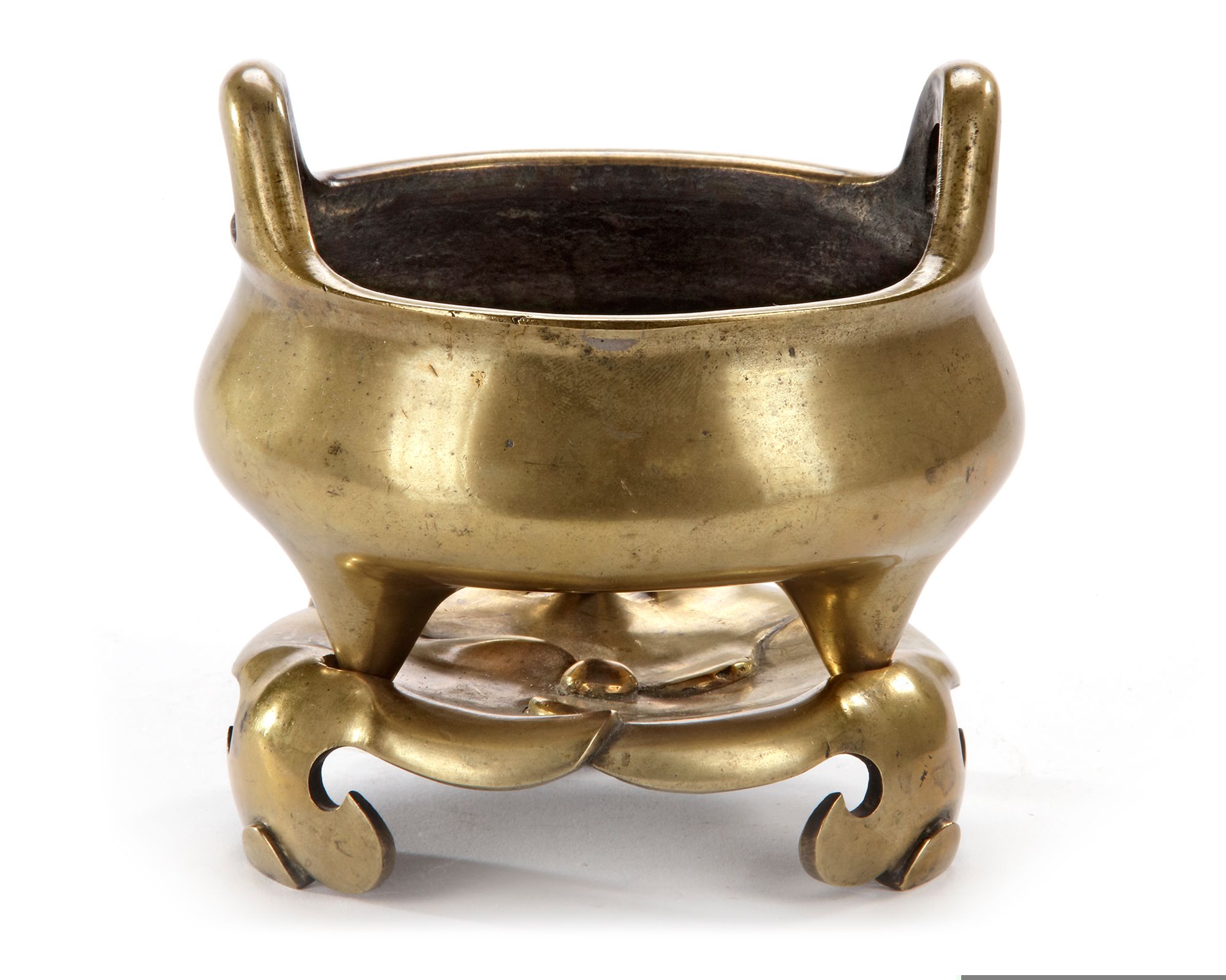A Chinese tripod censer, the compressed body with an upright twin handles and three small feet, cast of a leaf form base with three ruyi form feet. The bottom carved with a Chinese six character mark.