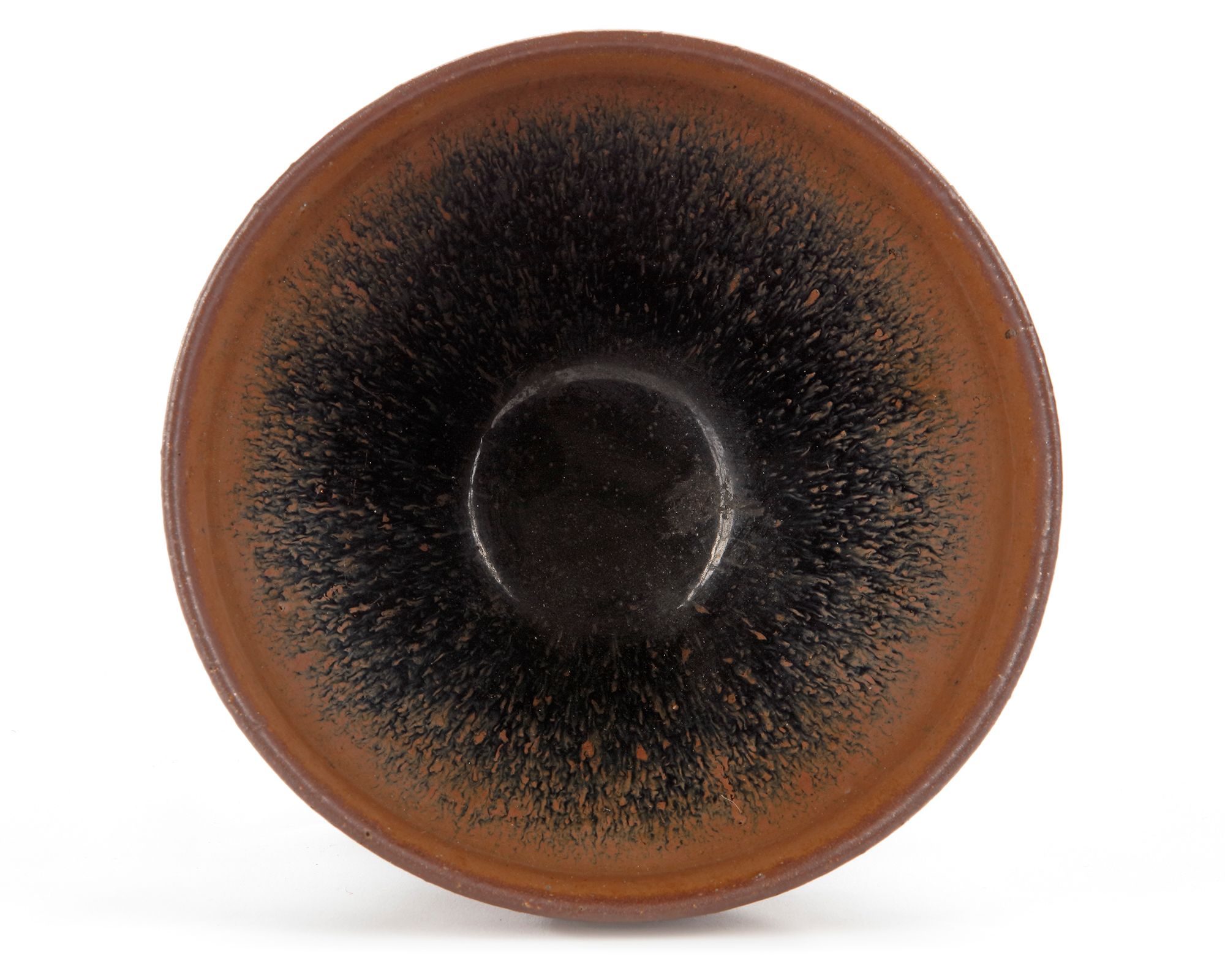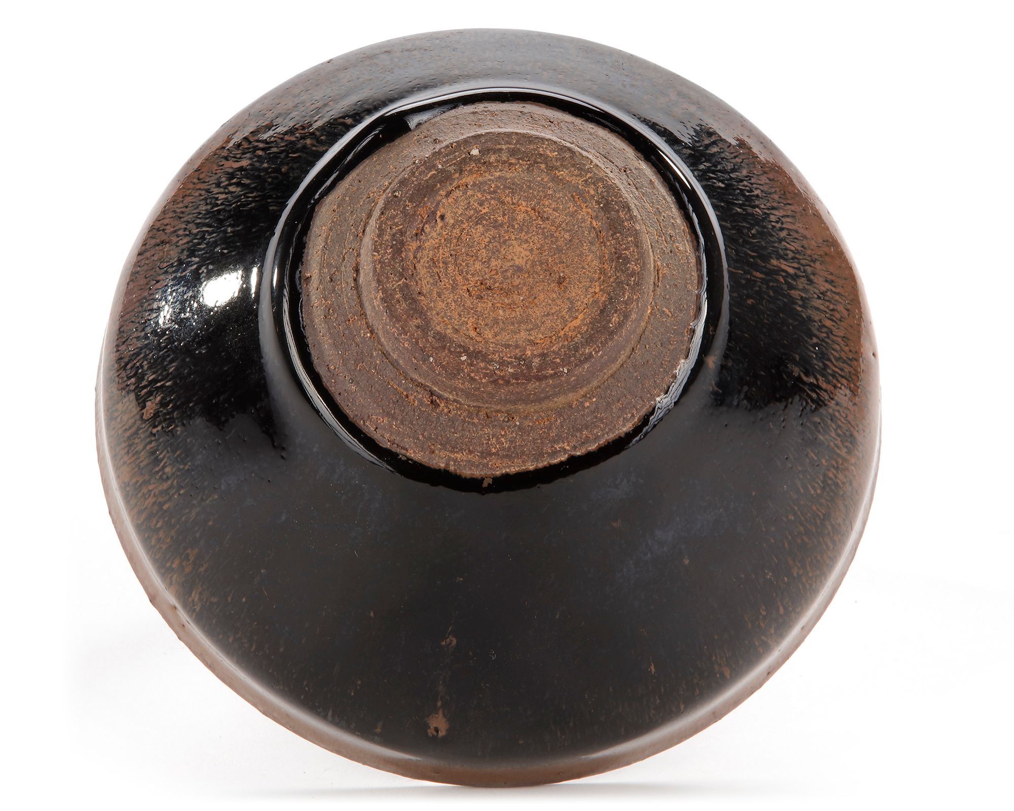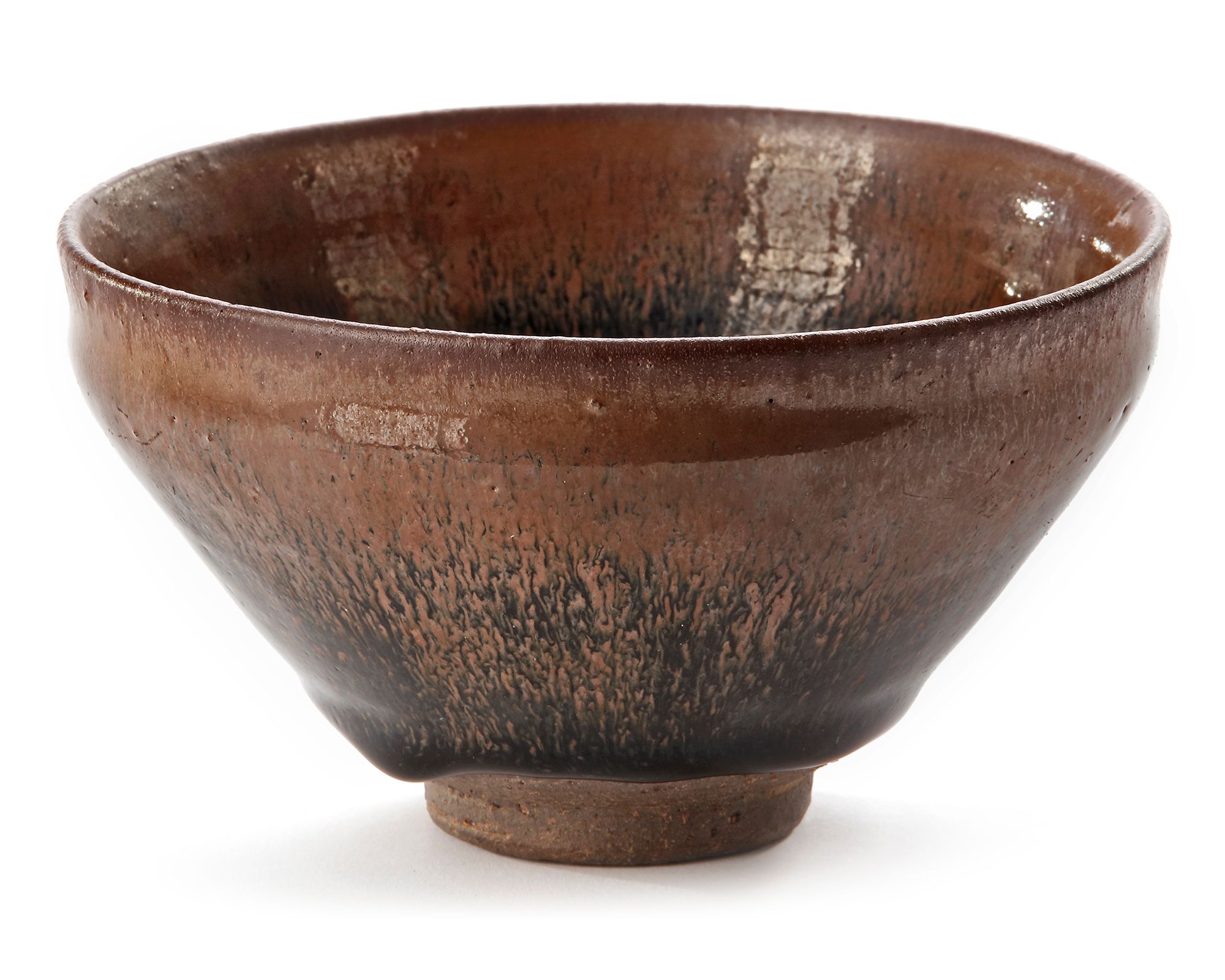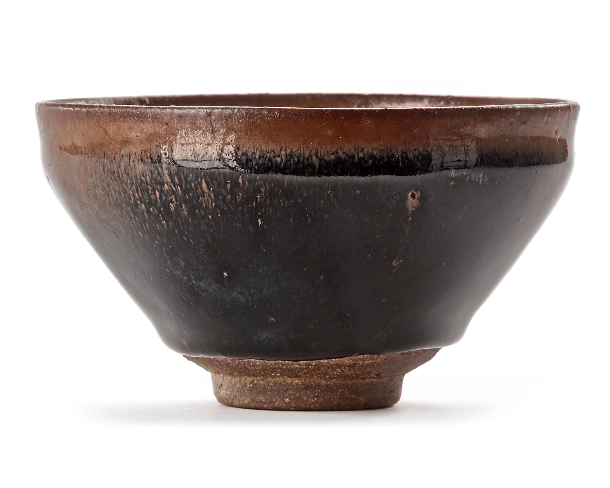 The bowl is covered overall with a lustrous blackish-brown glaze finely streaked with russet 'hare's fur' pooling in an irregular line above the foot exposing the chocolate-brown body.