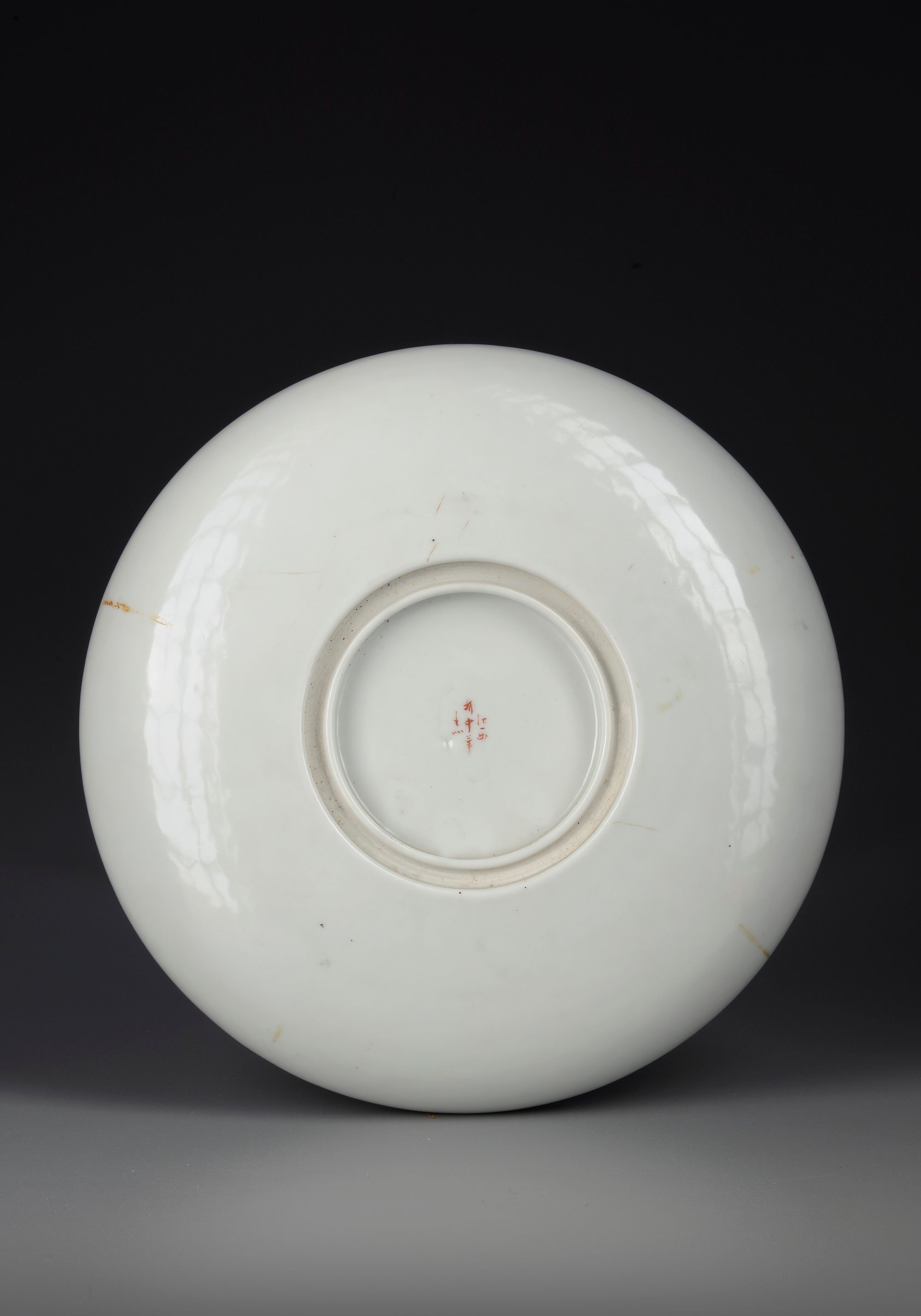 A Chinese porcelain brush washer decorated with two houses beside large trees in a river and mountain landscape. Diameter: 23 cm.