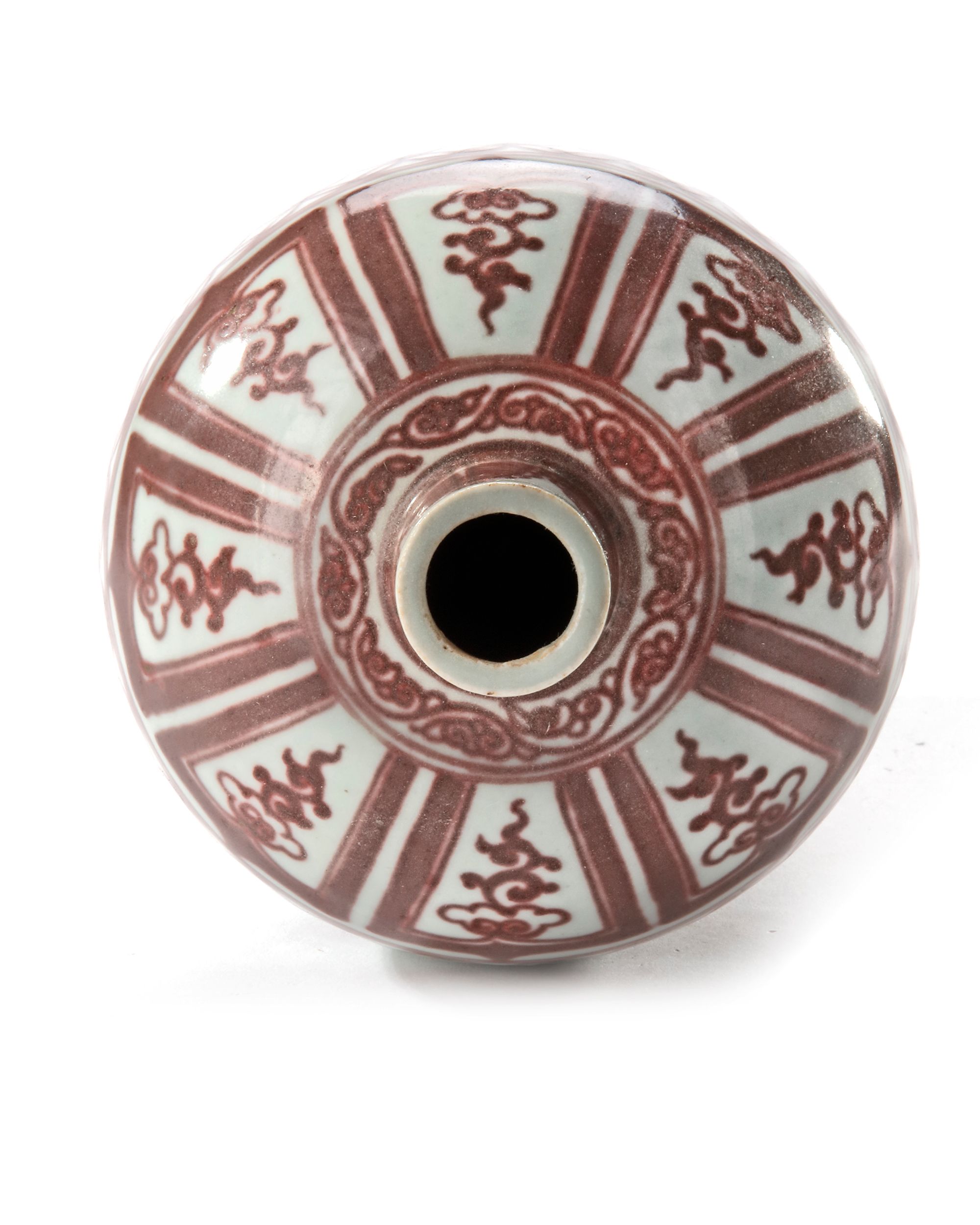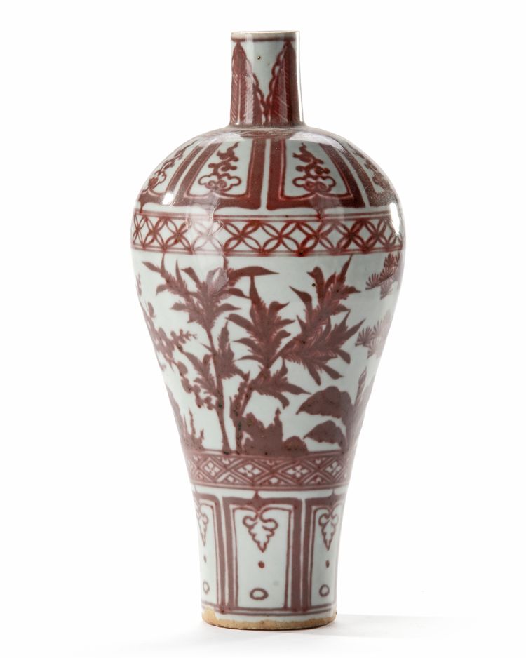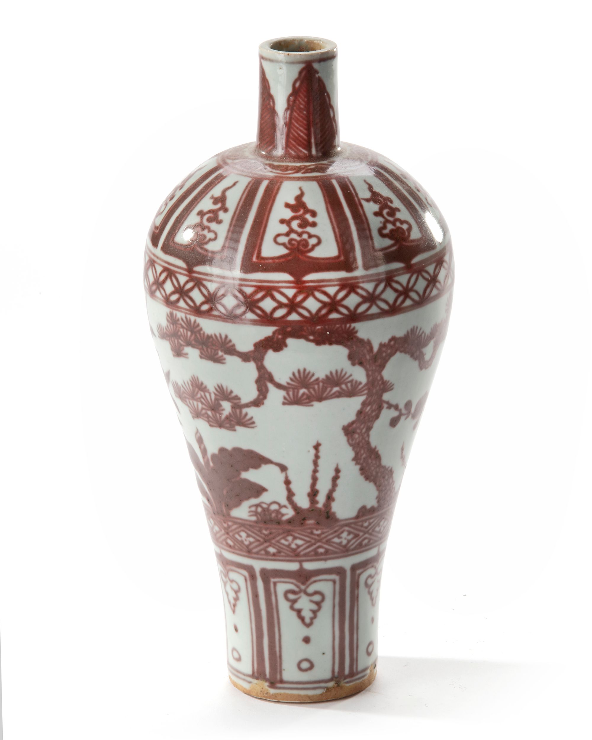 A Chinese porcelain meiping vase decorated around the body in copper red with the three friends of winter, set between a petal lappet border to the shoulder and the base. The small mouth with upright stiff leaves, the base is unglazed.