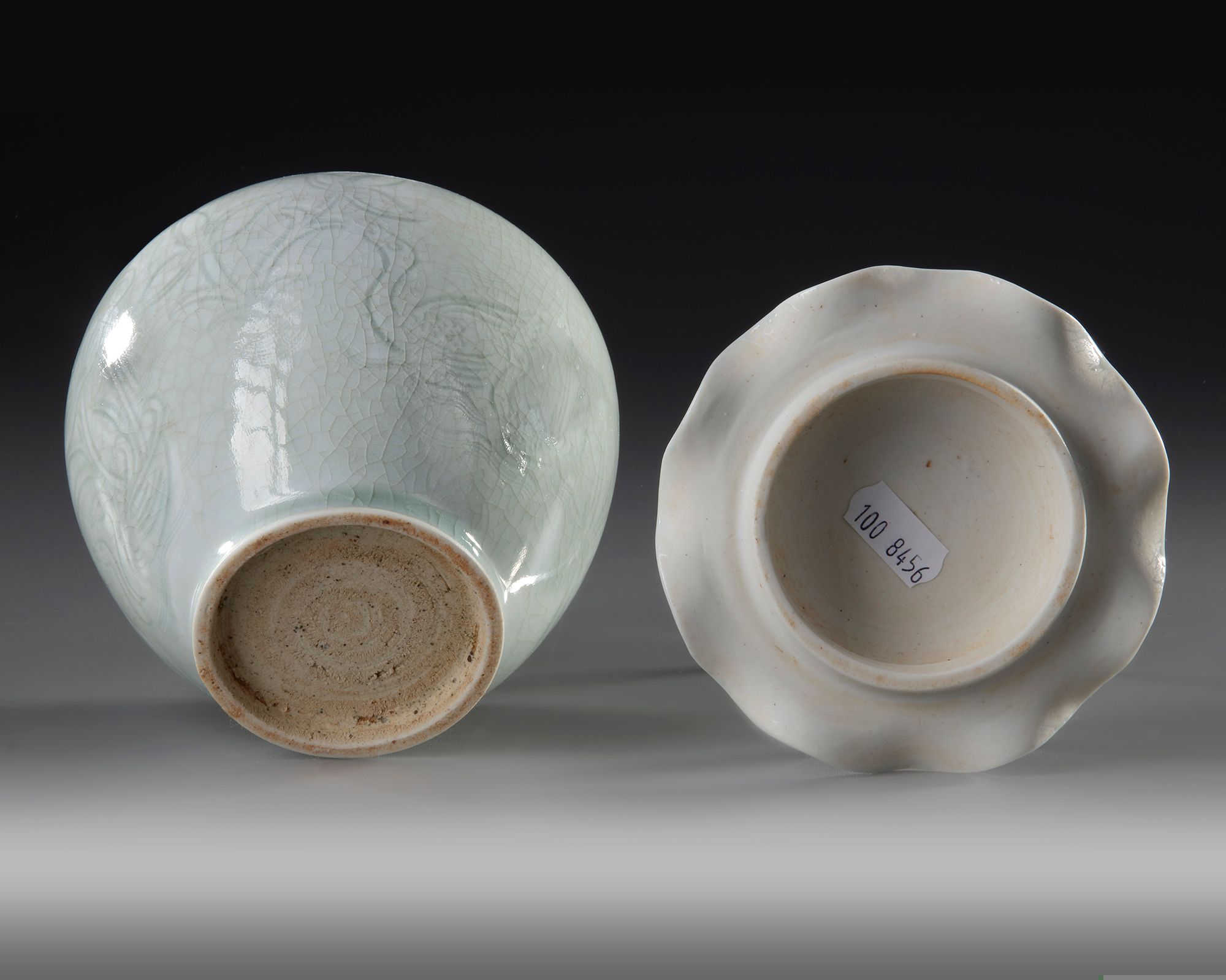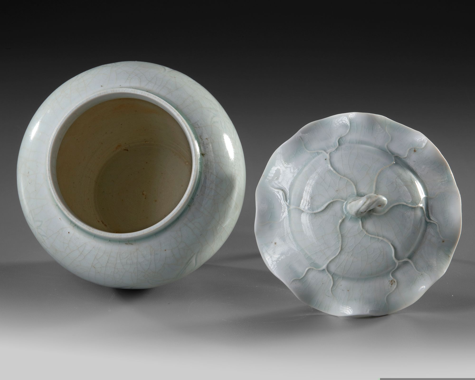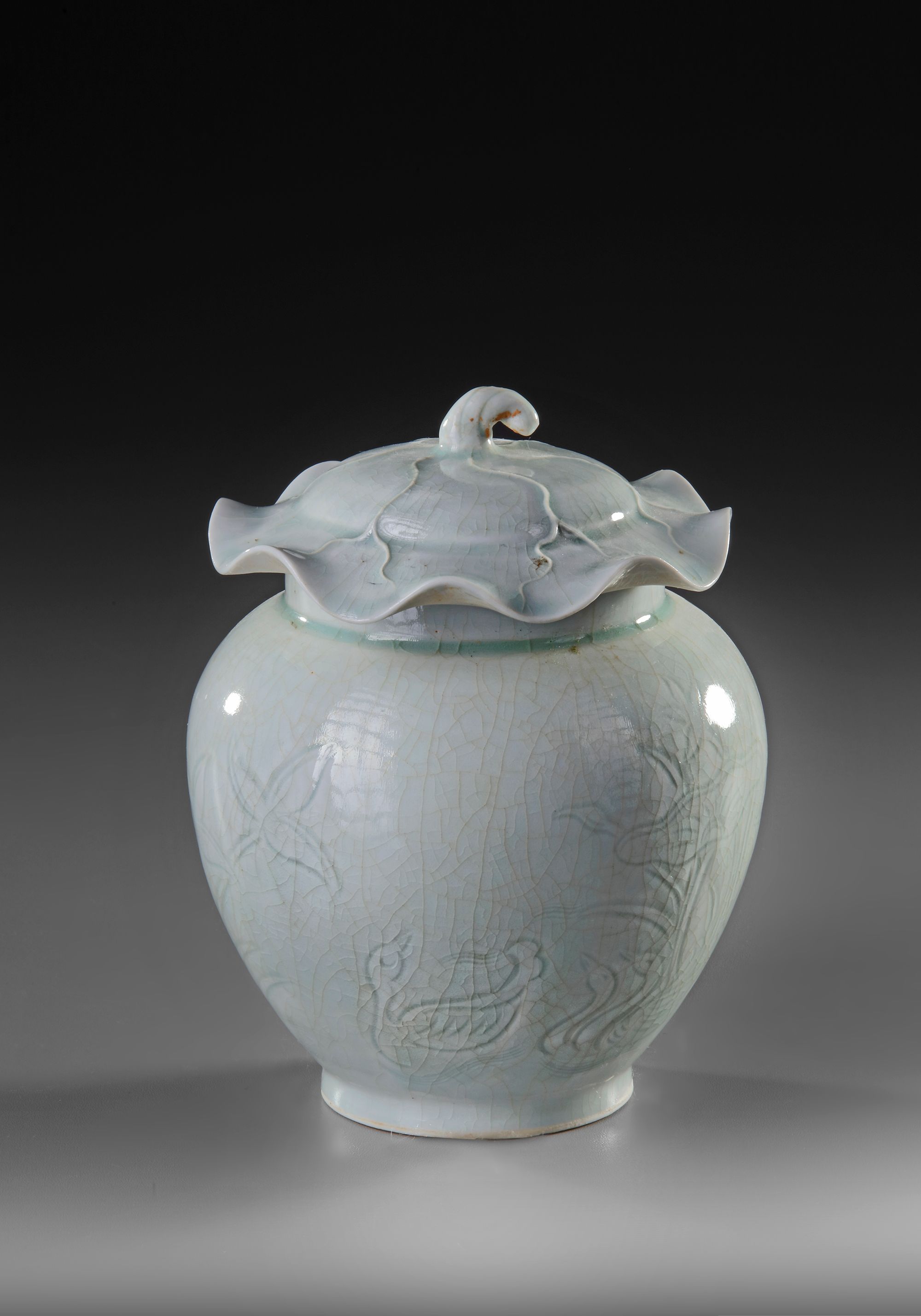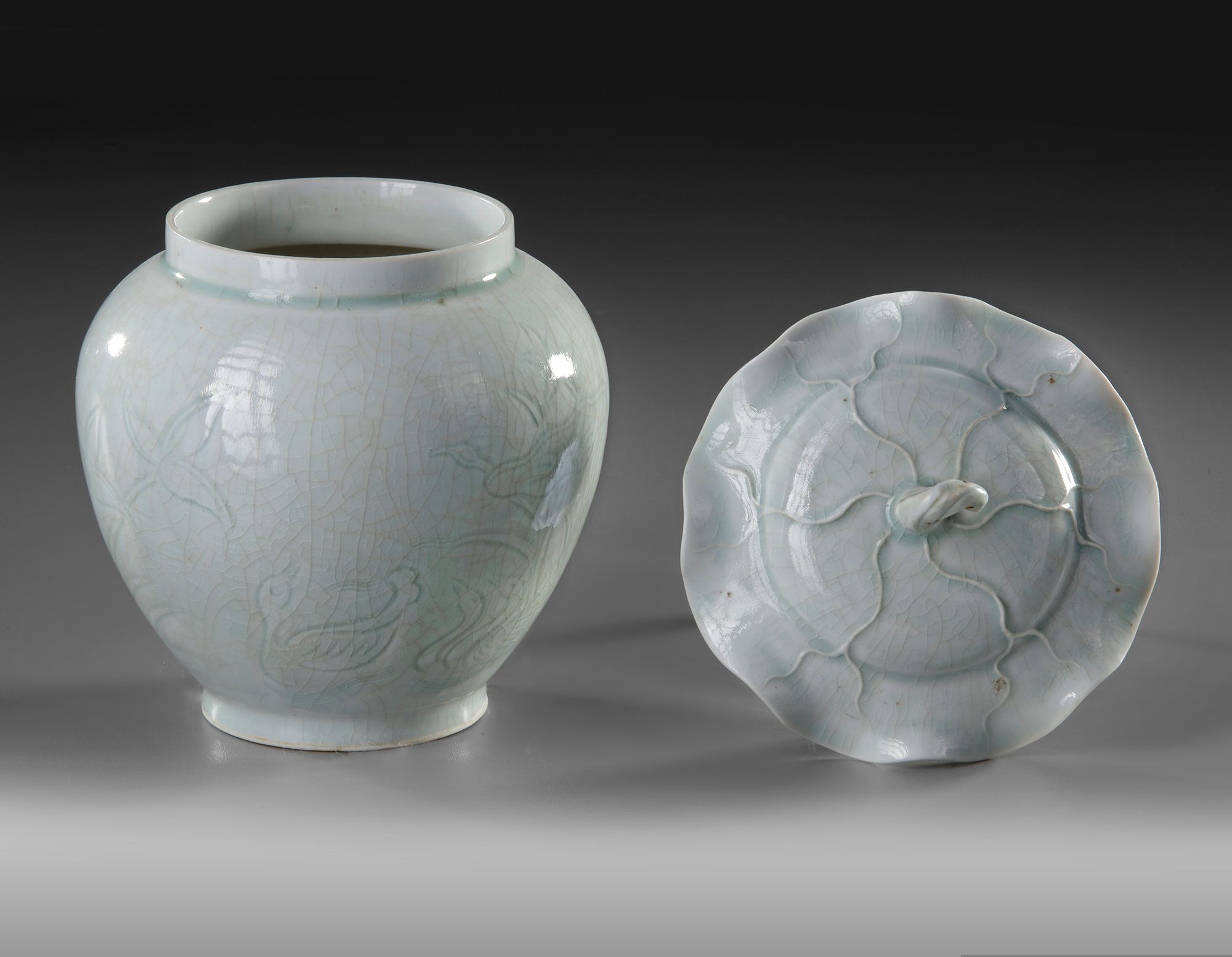 A Chinese porcelain jar, incised with ducks swimming amongst lake plants. The cover is in the form of a lotus leaf and is surmounted with a stem-form finial. The vessel is covered overall with a pale blue glaze that pools in the recesses. The base is unglazed to reveal the white body.