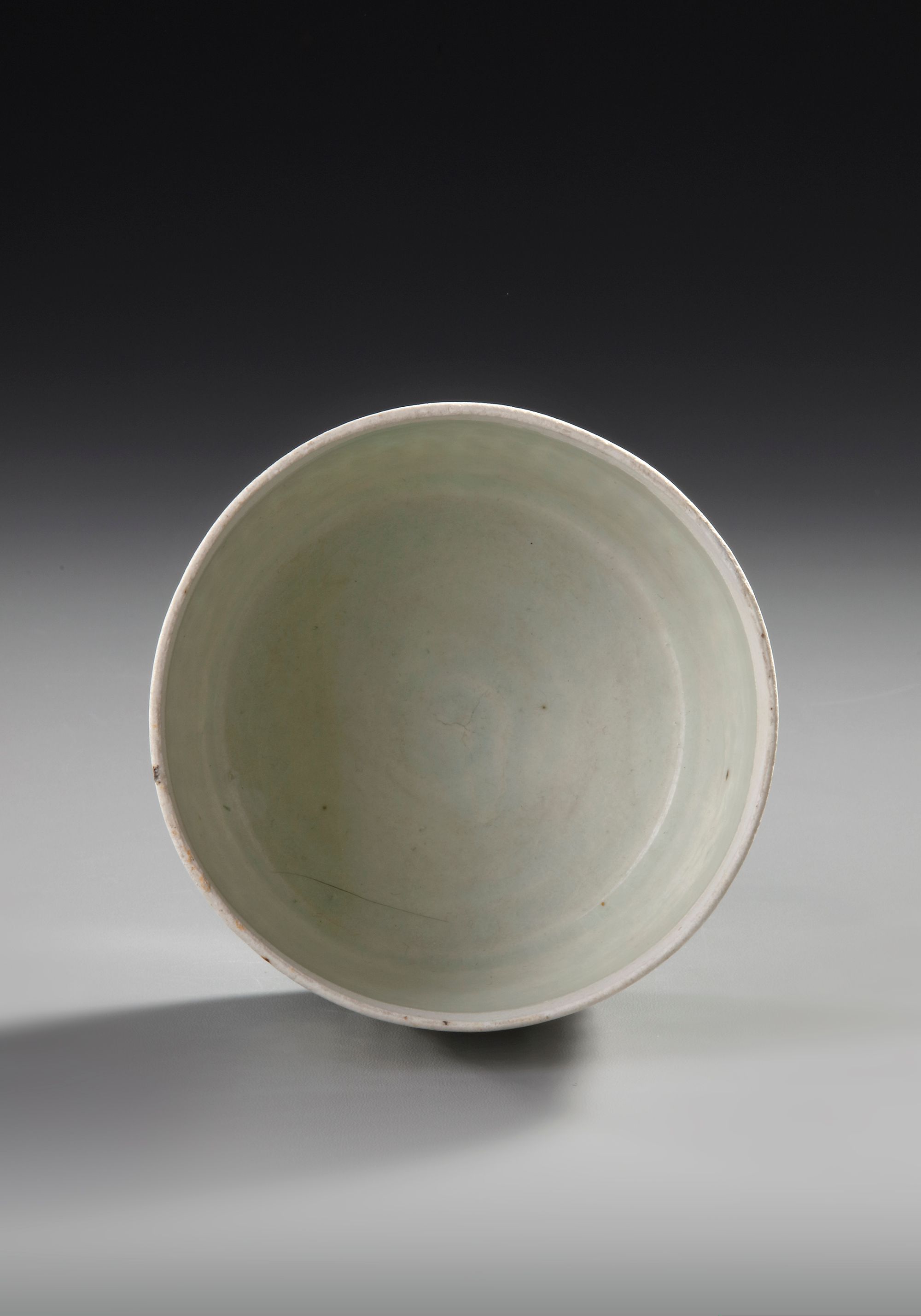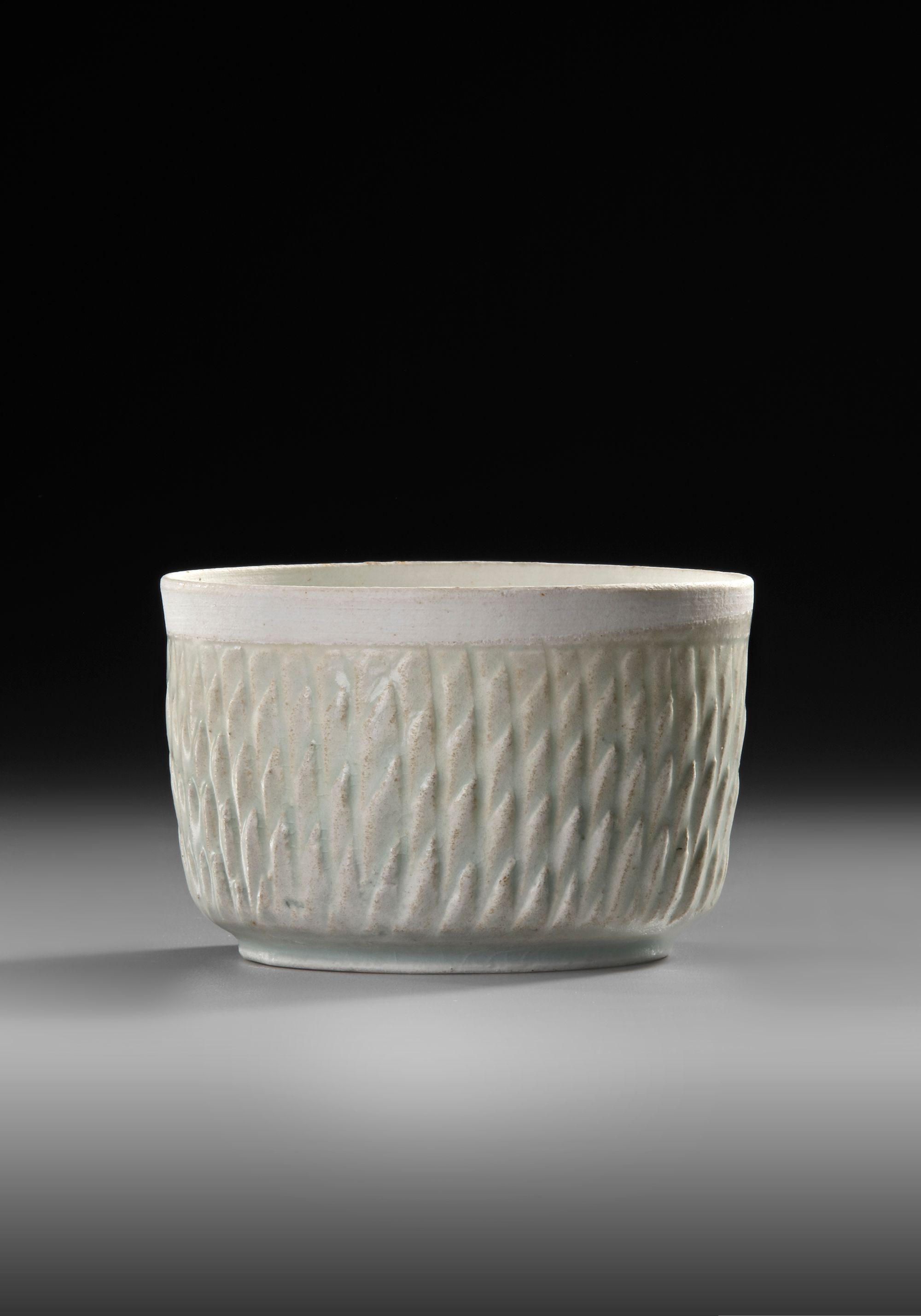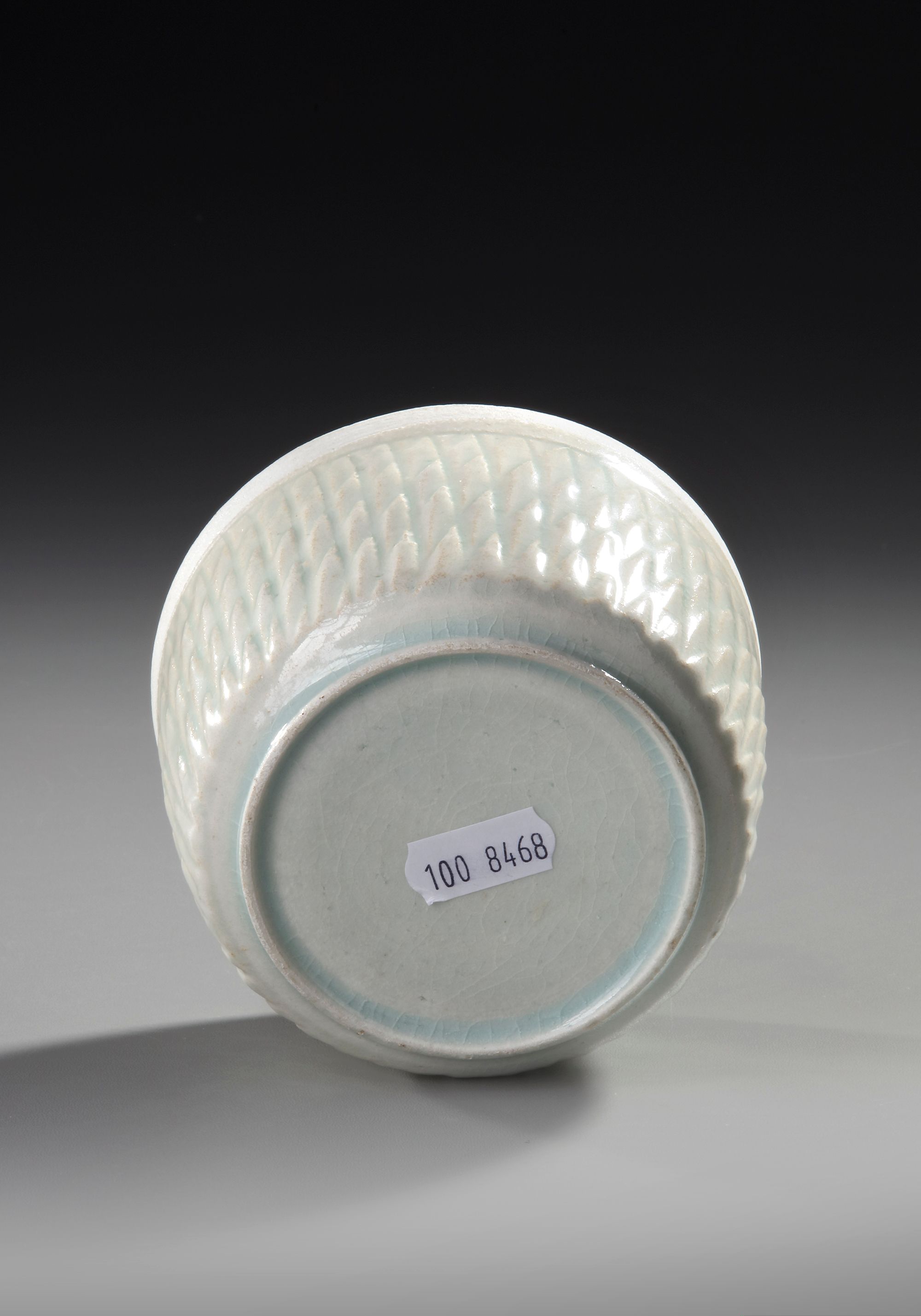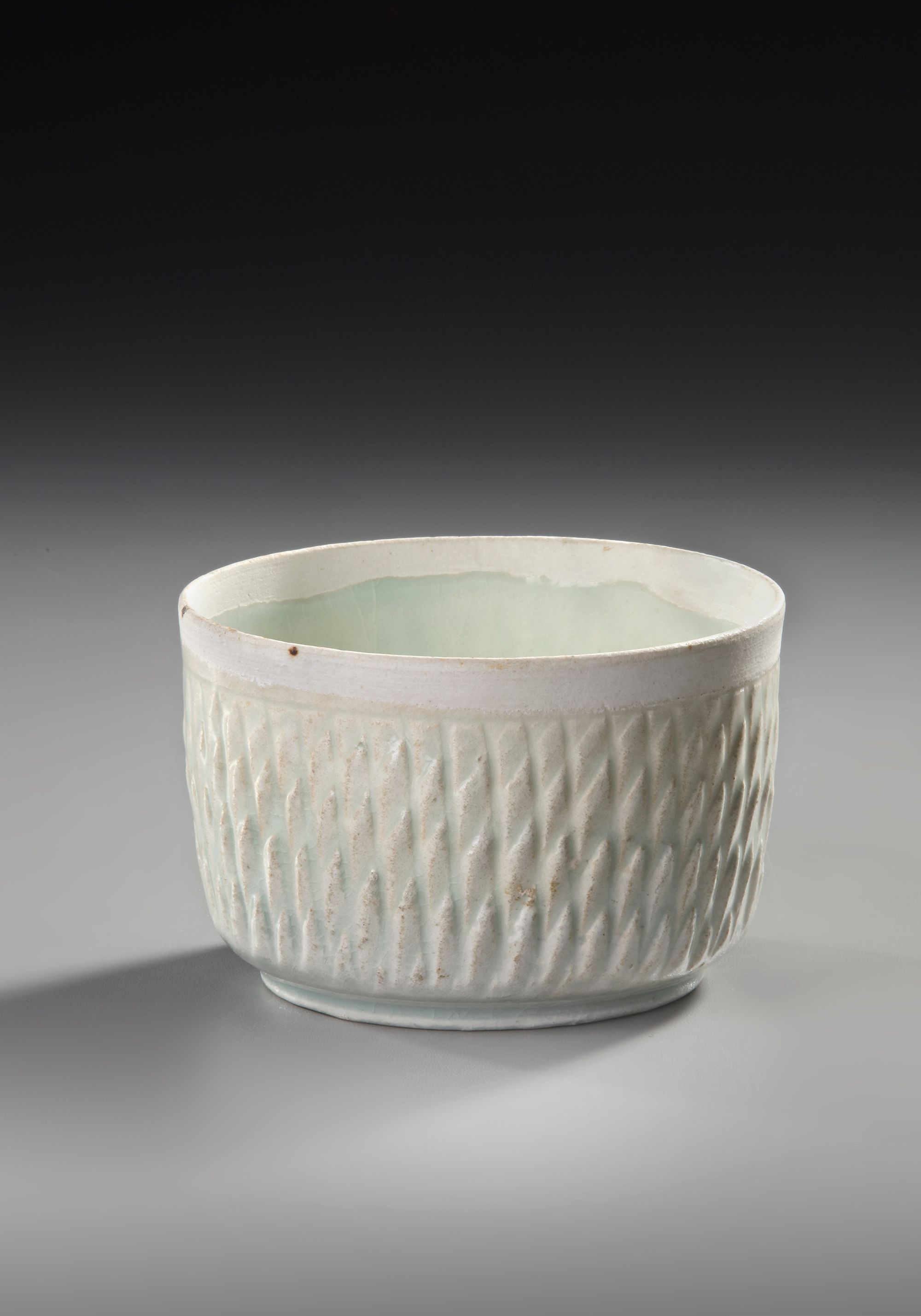 A Chinese porcelain bowl, very thinly potted, deeply rounded sides rising from a small base. The exterior of the bowl is carved with a crosshatched design, imitating a basket weave pattern. The bowl is covered in a transparent glaze of even, pale blue hue that pools to darker tone in the crevasses. The rim of the bowl is wiped clean of glaze, showing the very fine white porcelain body.