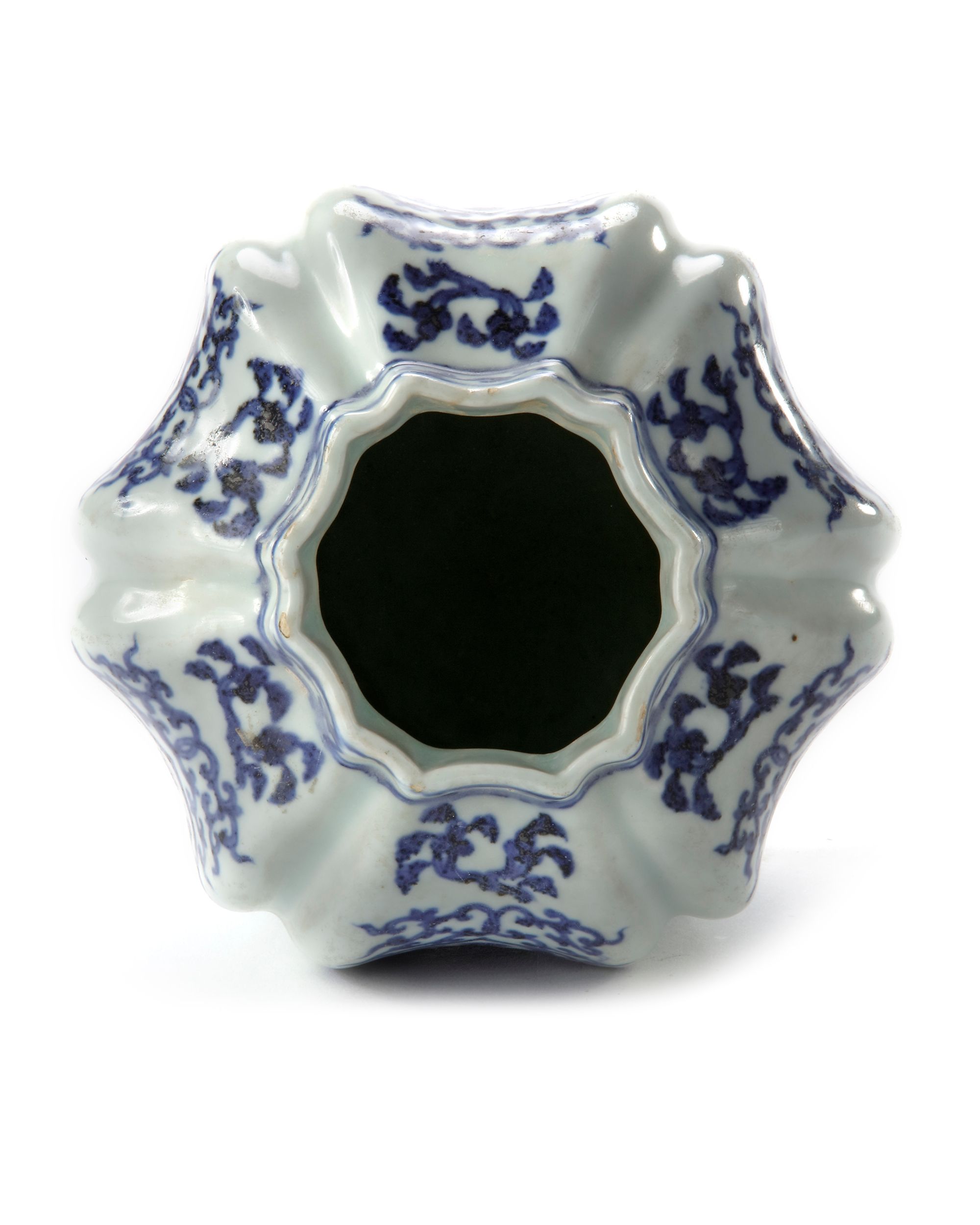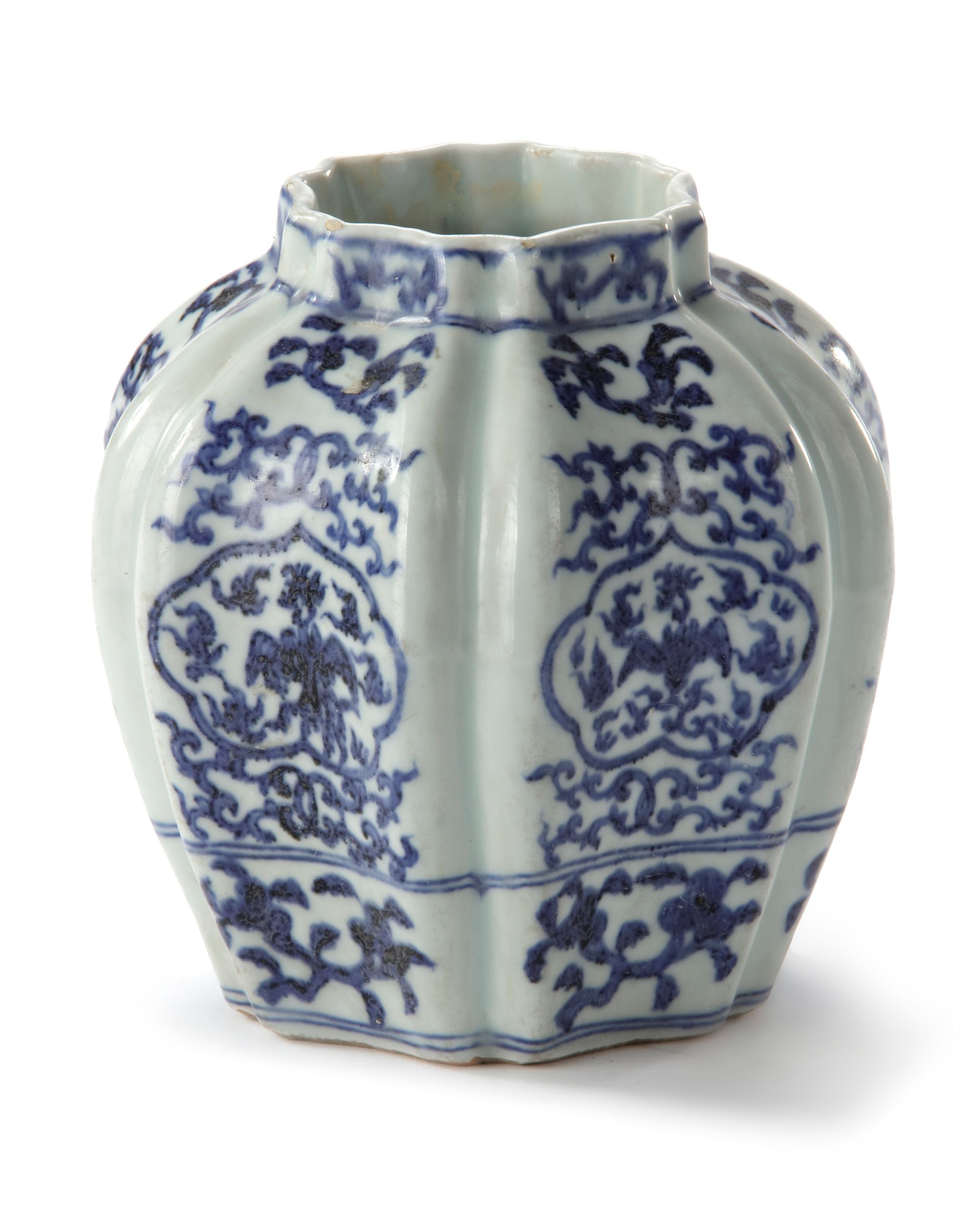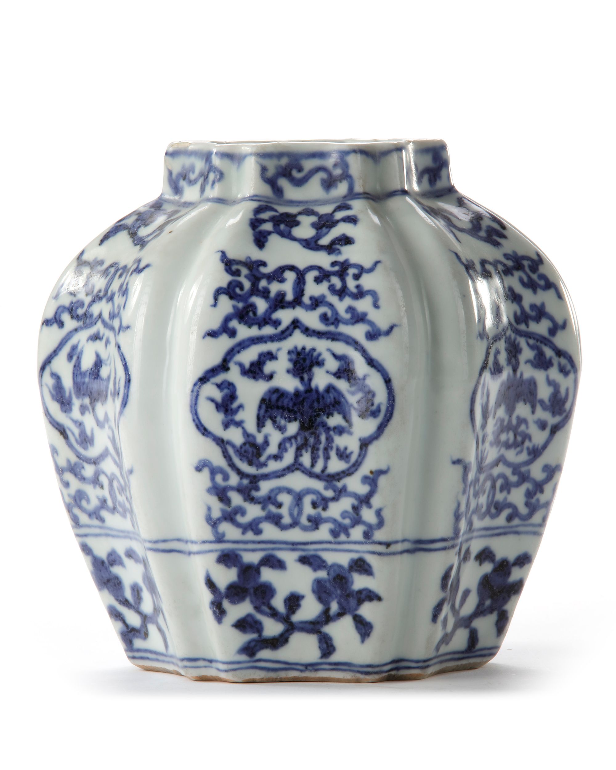 A Chinese porcelain six lobbed jar, each lob decorated in cobalt blue with a panel enclosing a phoenix bird surrounded by floral leafy sprays, further to the shoulder and the base with peach blossoming branches.