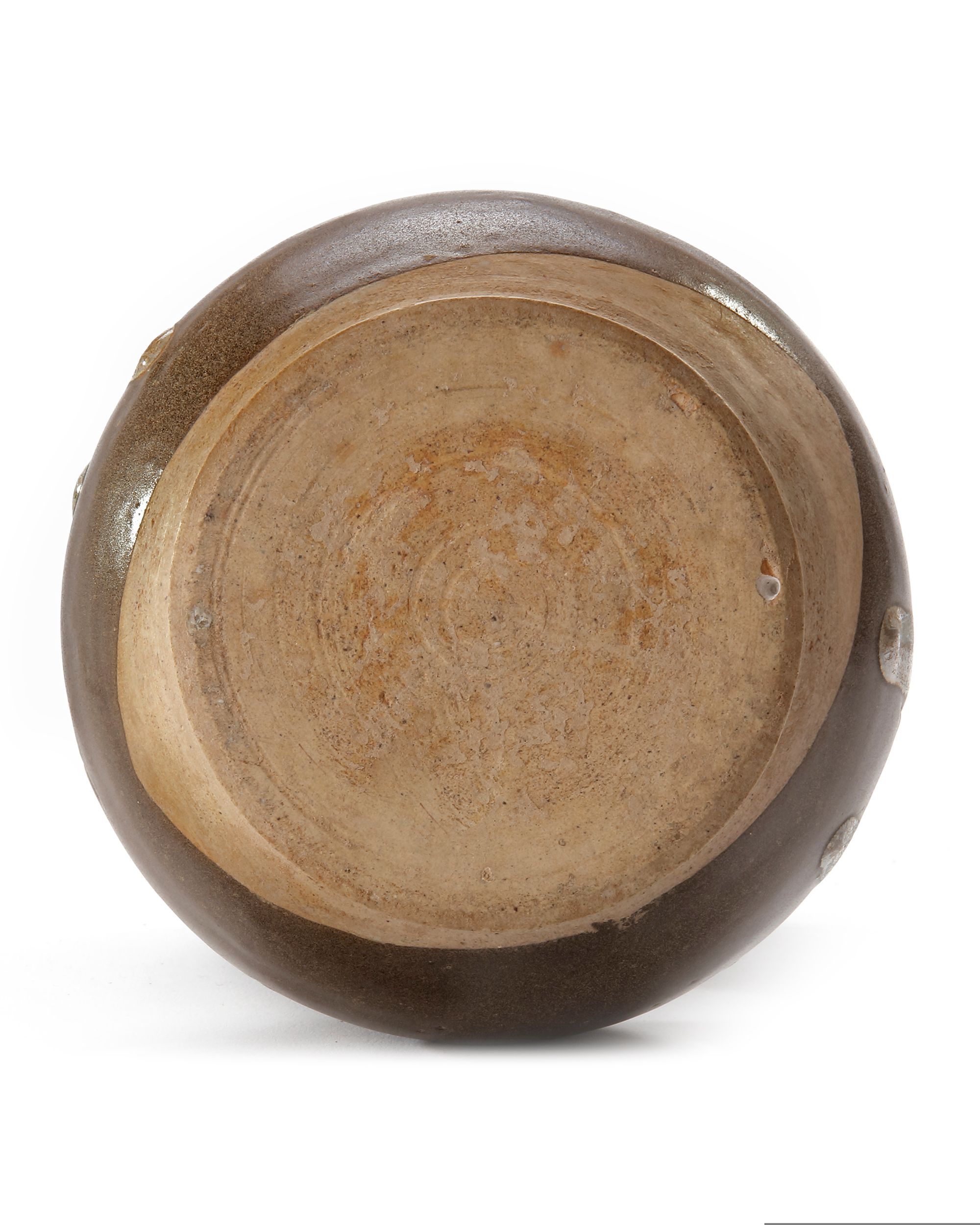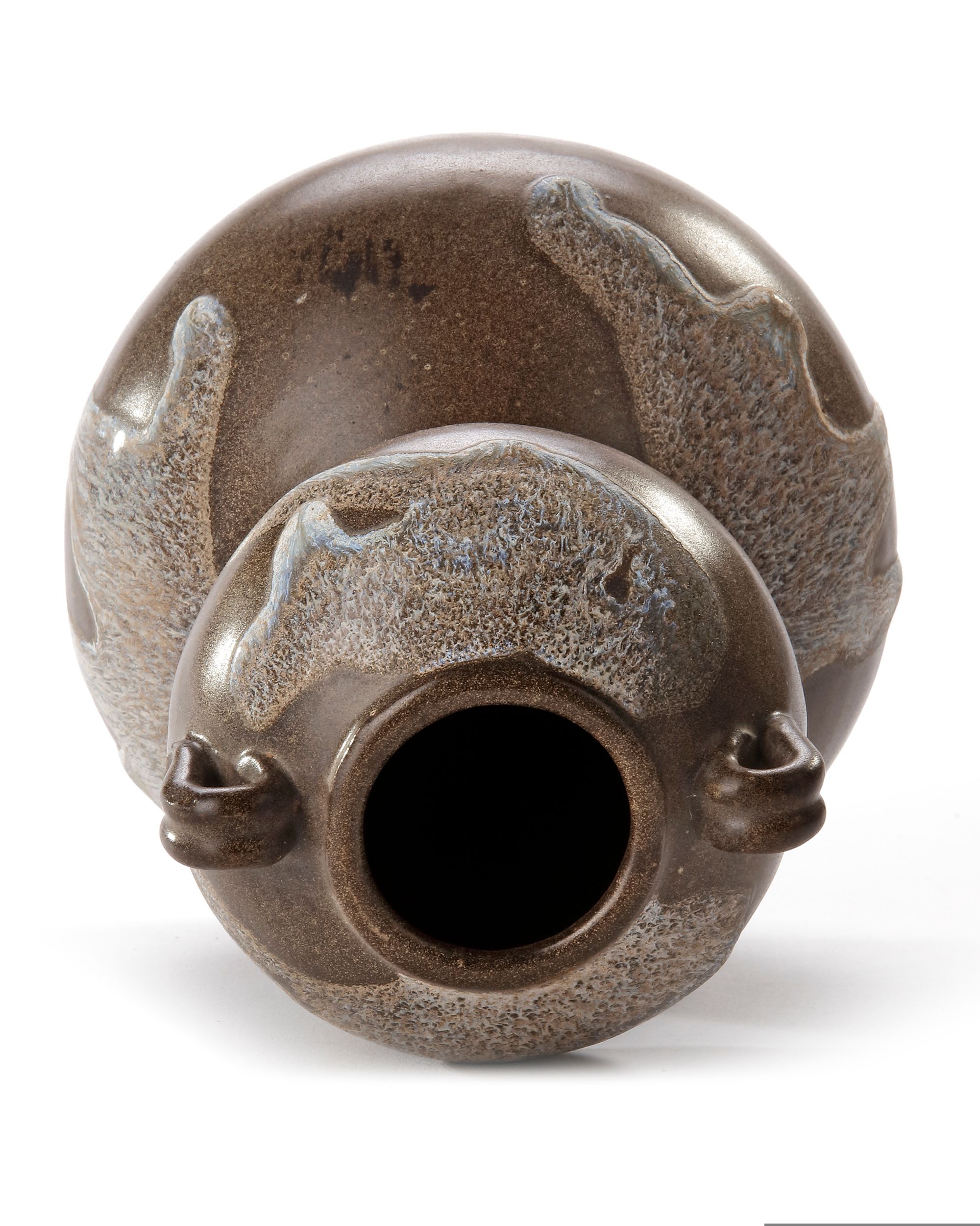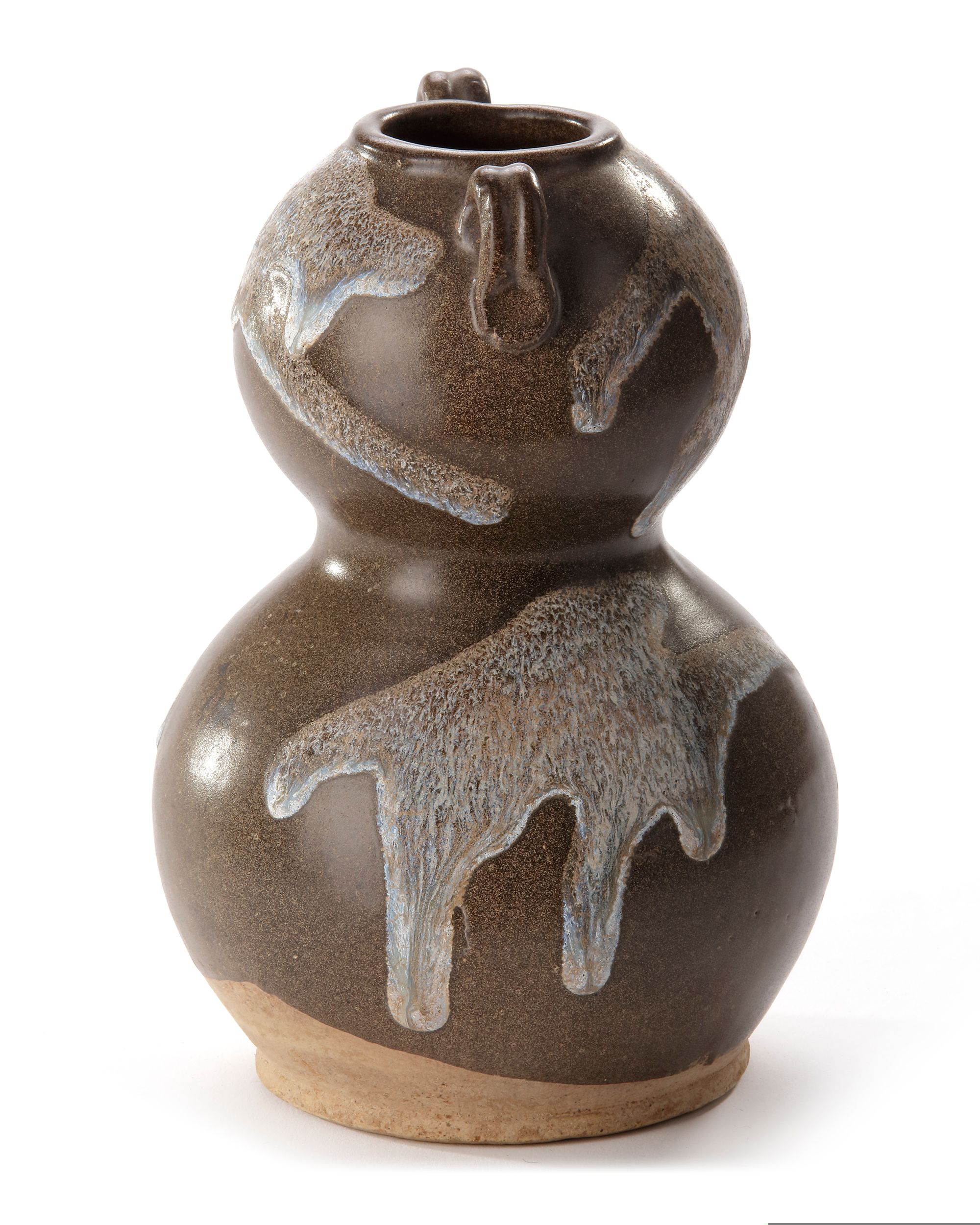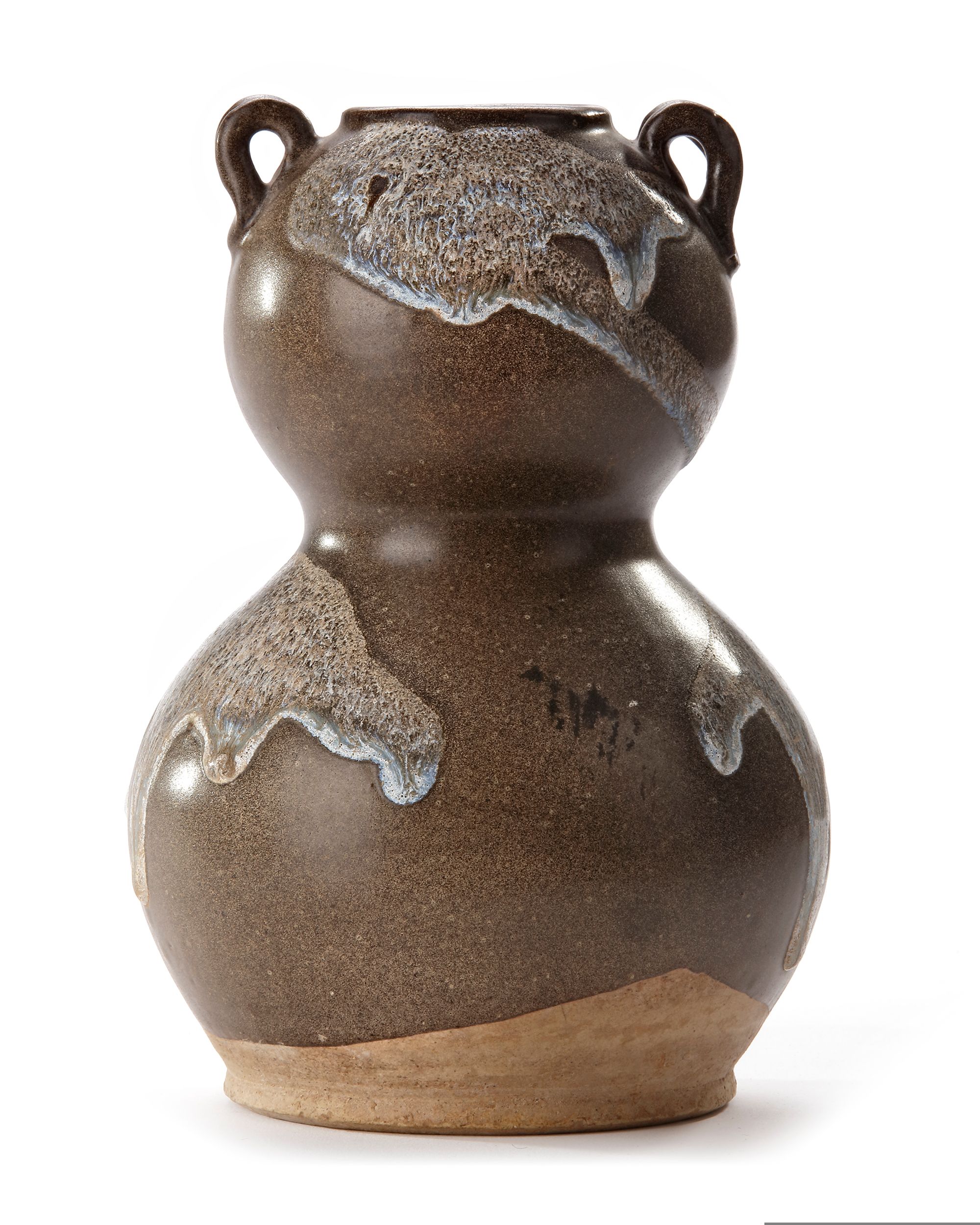 A Chinese double gourd vase stylized with a pair of small loop handles, covered with an olive-brown glaze that ends in an irregular line above the flat foot to expose the granular ware burnt reddish-brown in the firing, and is decorated with splashes of milky cream and blue phosphatic glaze.