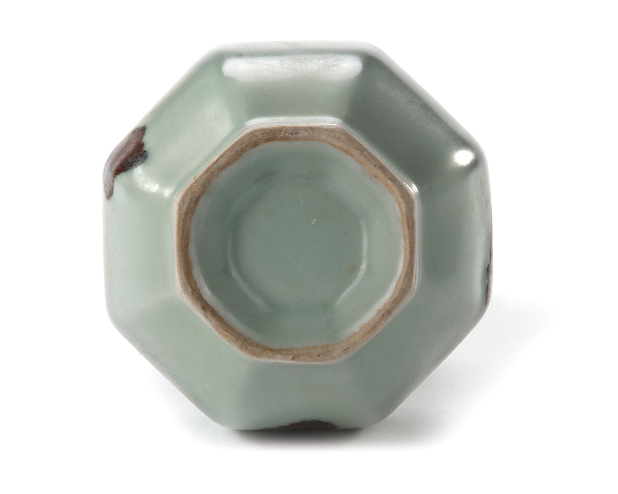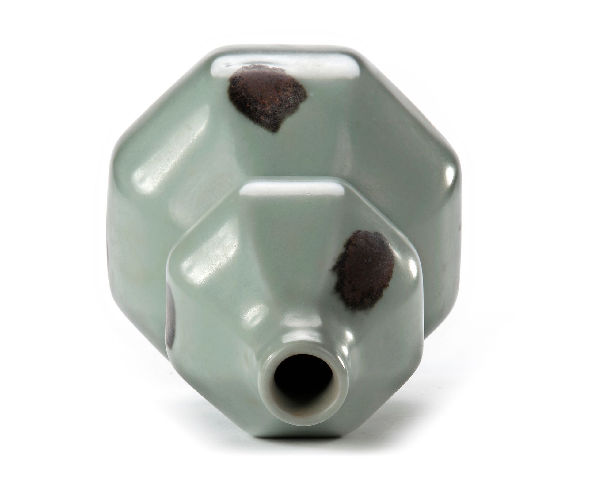 A Chinese octagonal double gourd vase with a small foot, covered with a thick greyish-celadon glaze decorated with scattered oxidised iron-brown splashes.