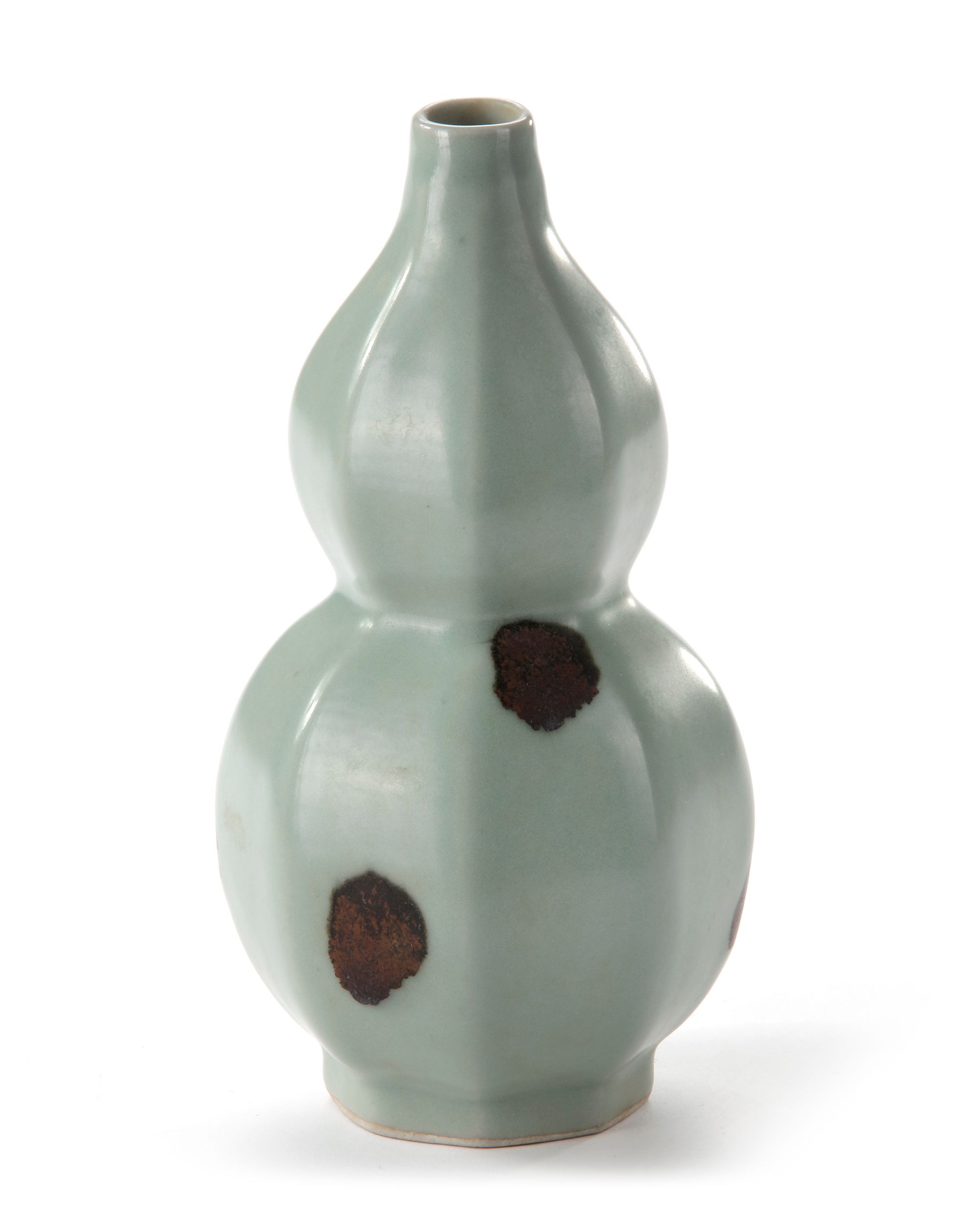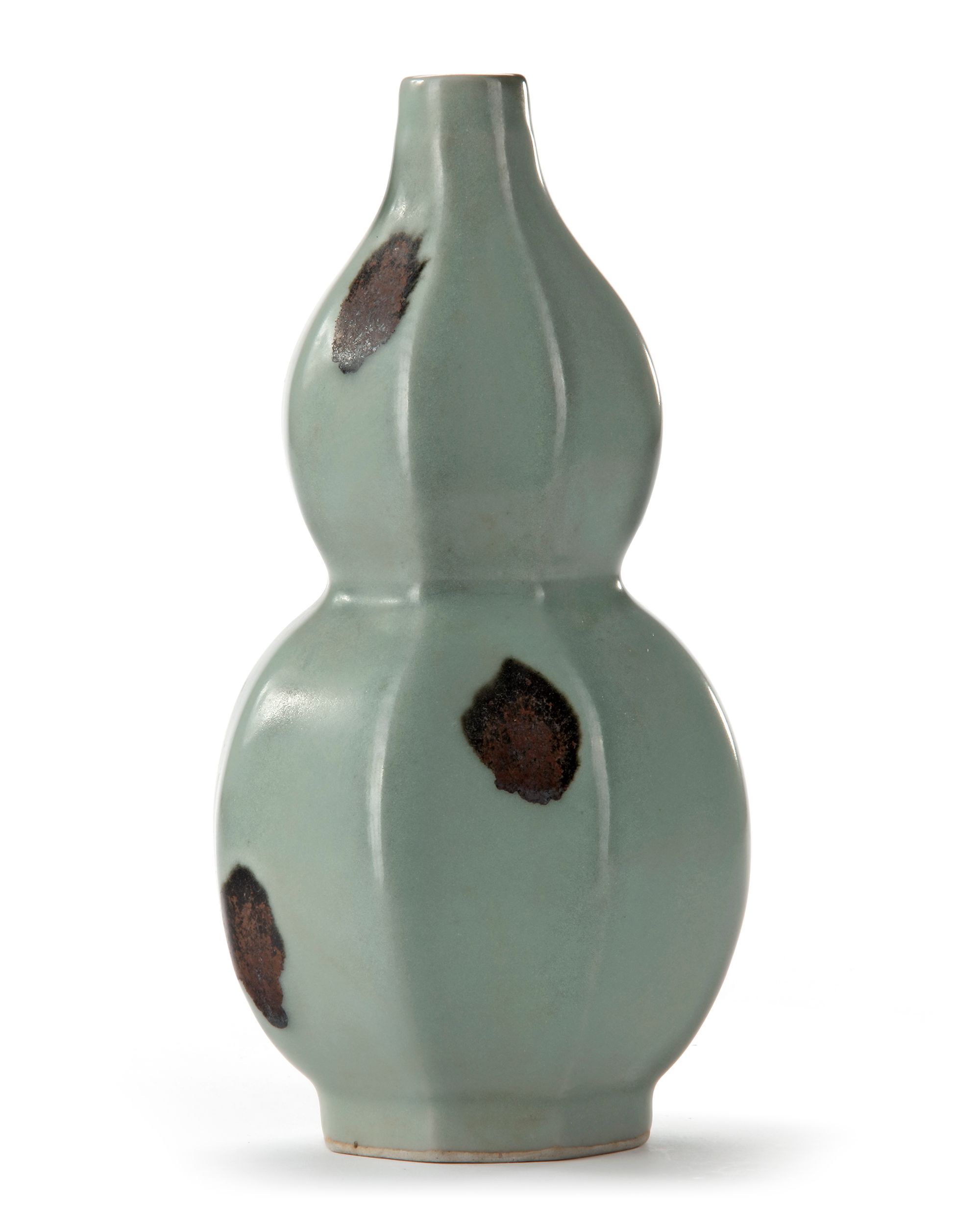 A CHINESE LONGQUAN CELADON RUSSET-SPLASHED DOUBLE GOURD VASE, YUAN DYNASTY (1279-1368)