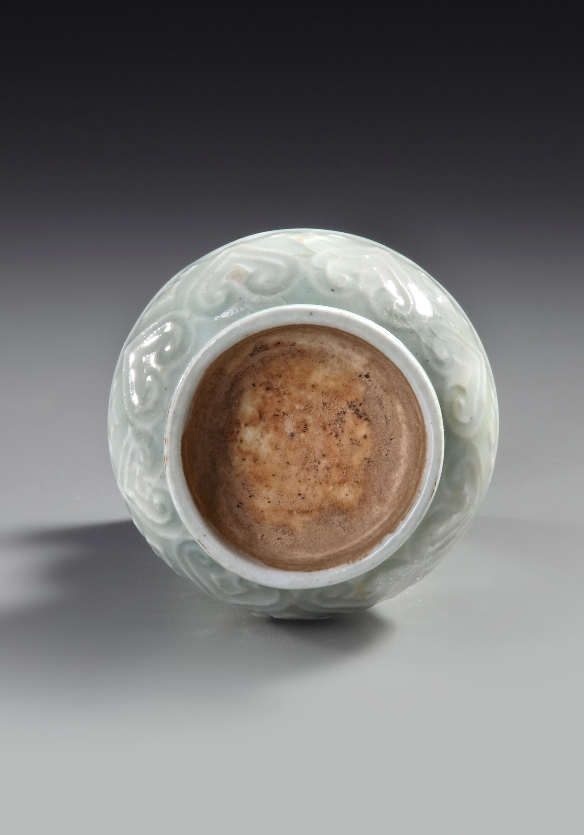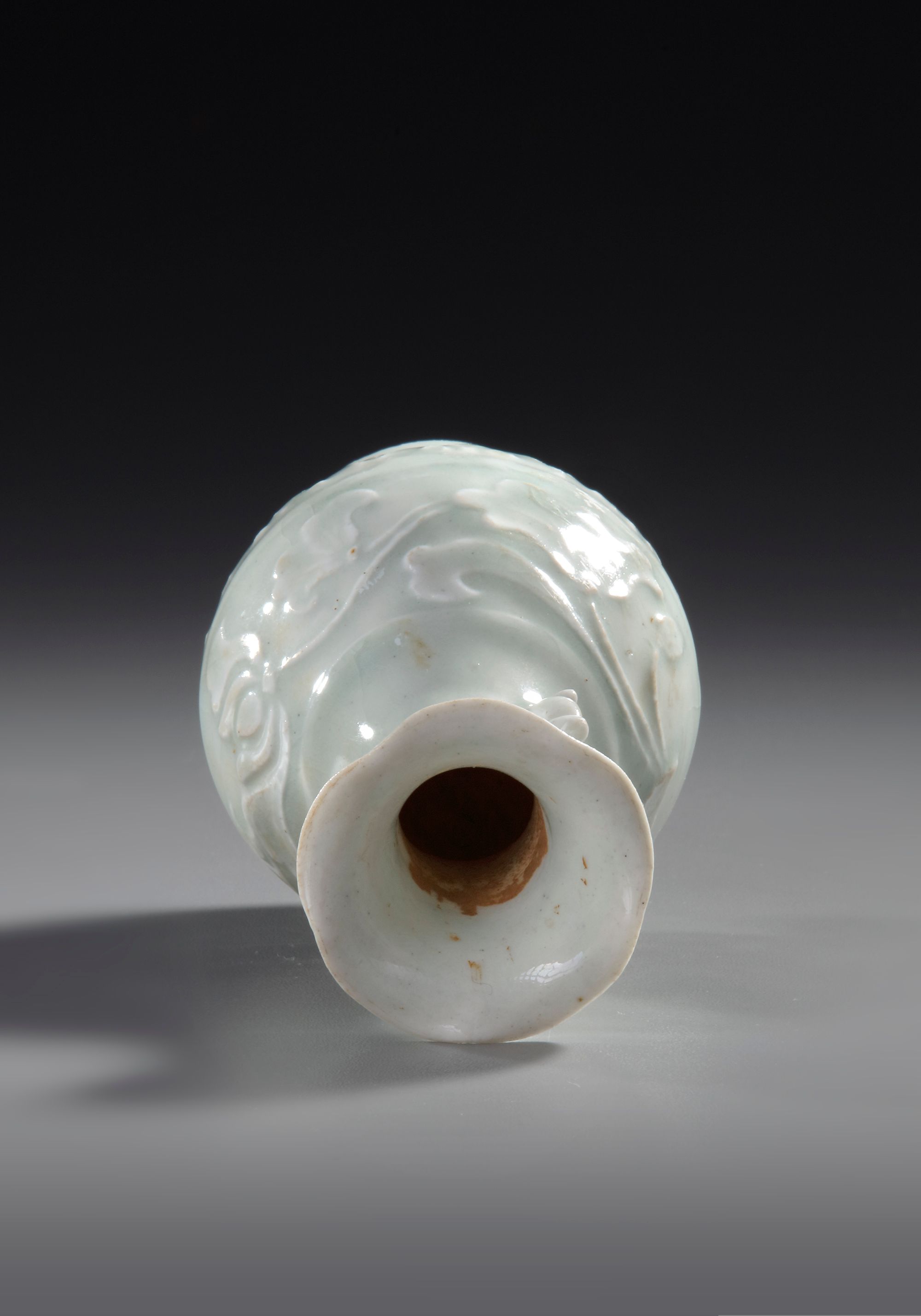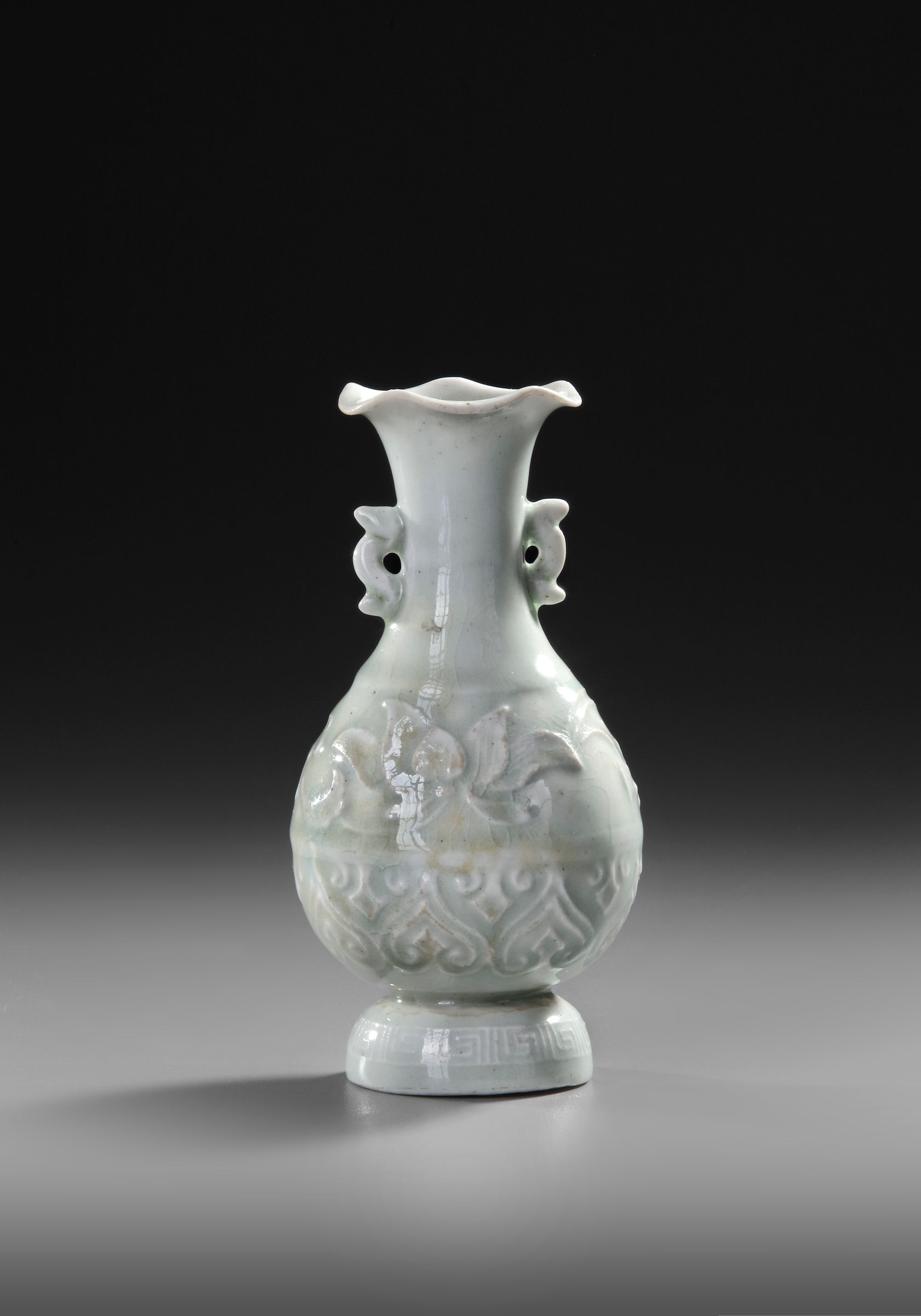 A Chinese porcelain vase with spreading foot, twin handles and flower shaped mouth, covered with a bluish glaze and carved around the body with lotus heads above a band of ruyi heads. The base with a key fret chain. The bottom is unglazed.