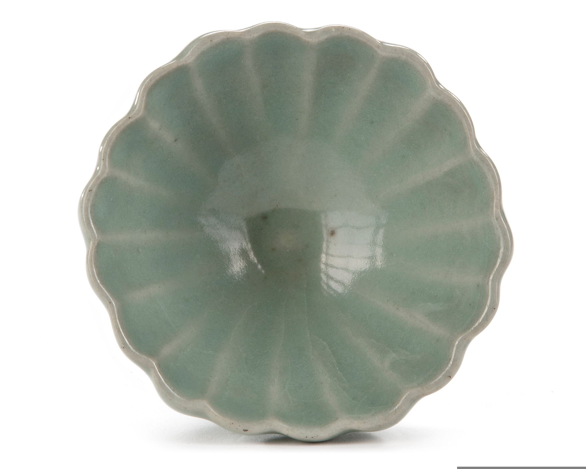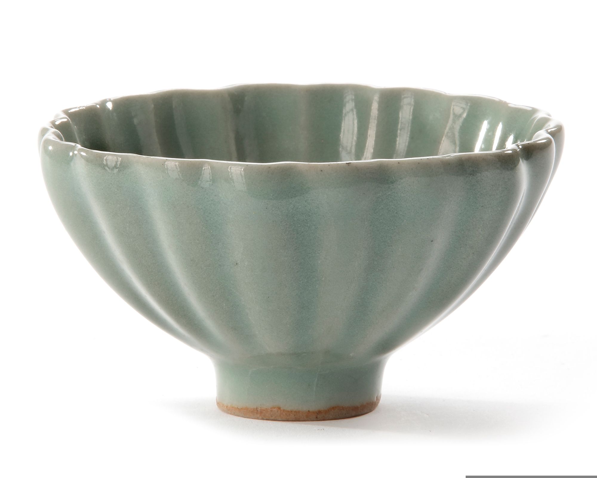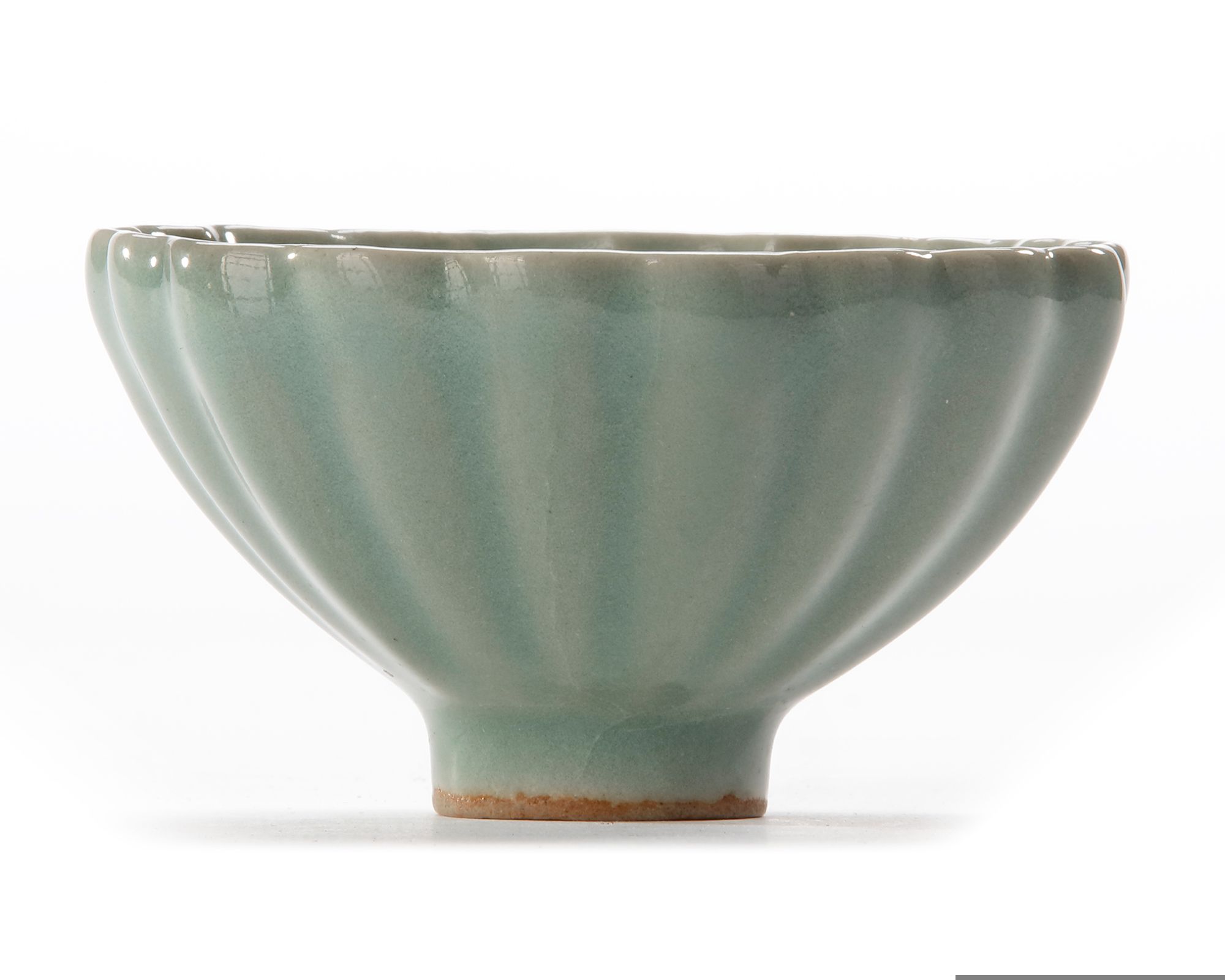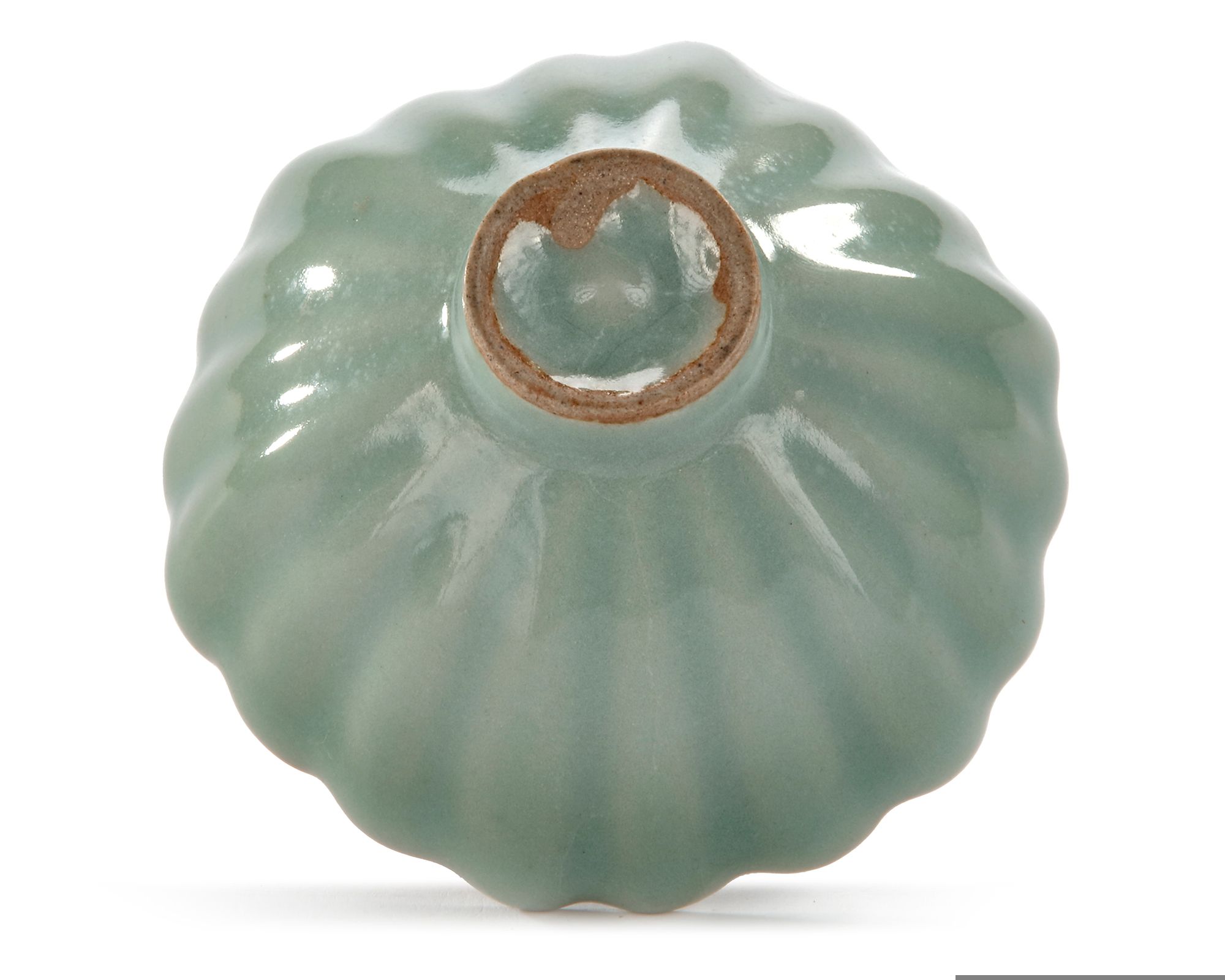 Delicately potted with rounded, vertically-lobed sides rising from a small foot ring, covered all over with a luminous glaze of sea-green tone suffused with a network of icy, colourless crackle, the interior of the foot and pointed base similarly glazed.