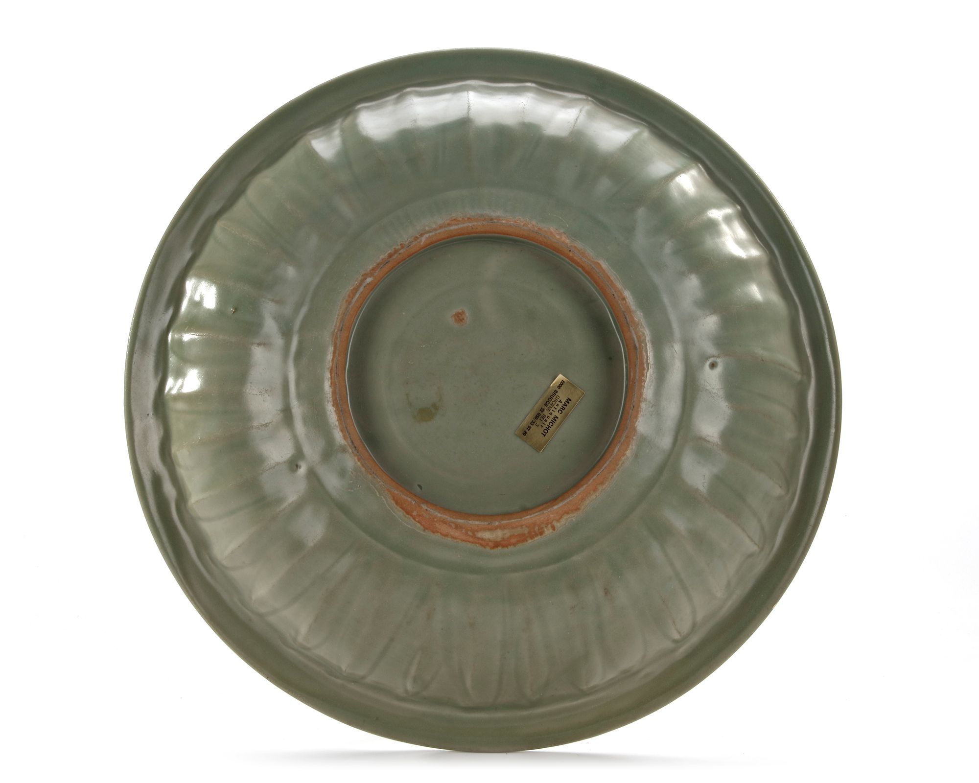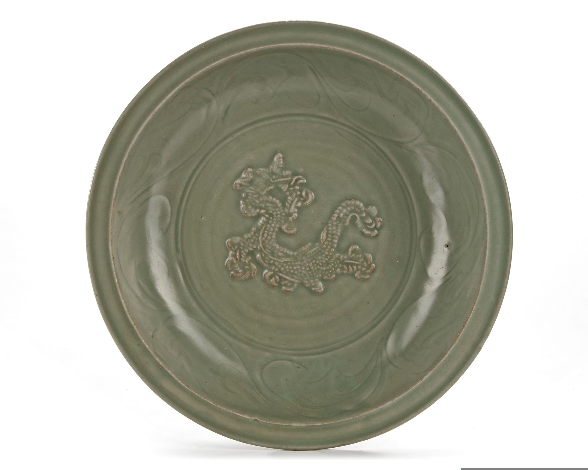 The heavily potted dish relief-decorated at the centre with a writhing four-clawed dragon chasing a flaming pearl, enclosed by an incised wave design at the cavetto below the everted, flattened rim, the exterior carved with a series of ribs to the sides, all beneath a rich green glaze.