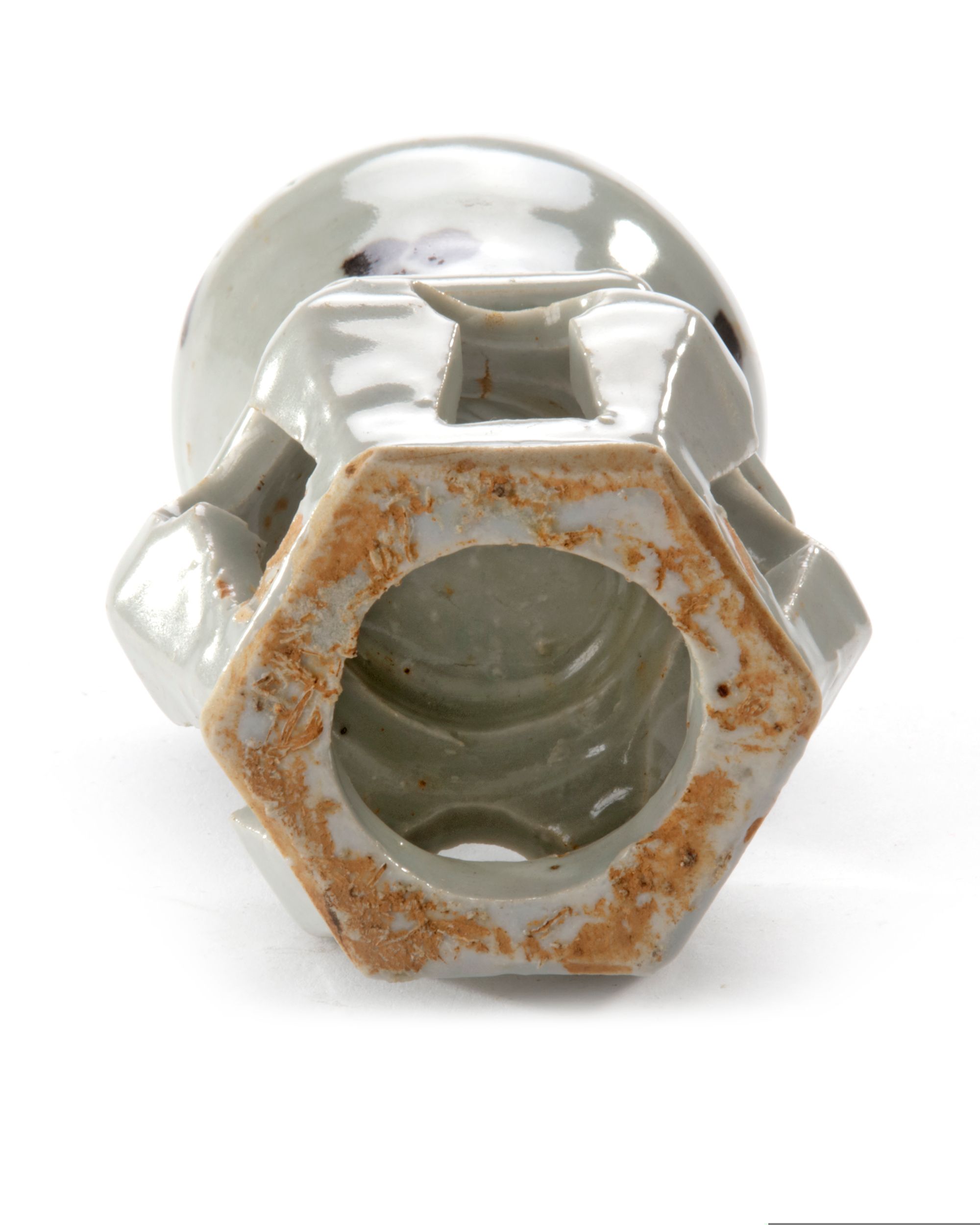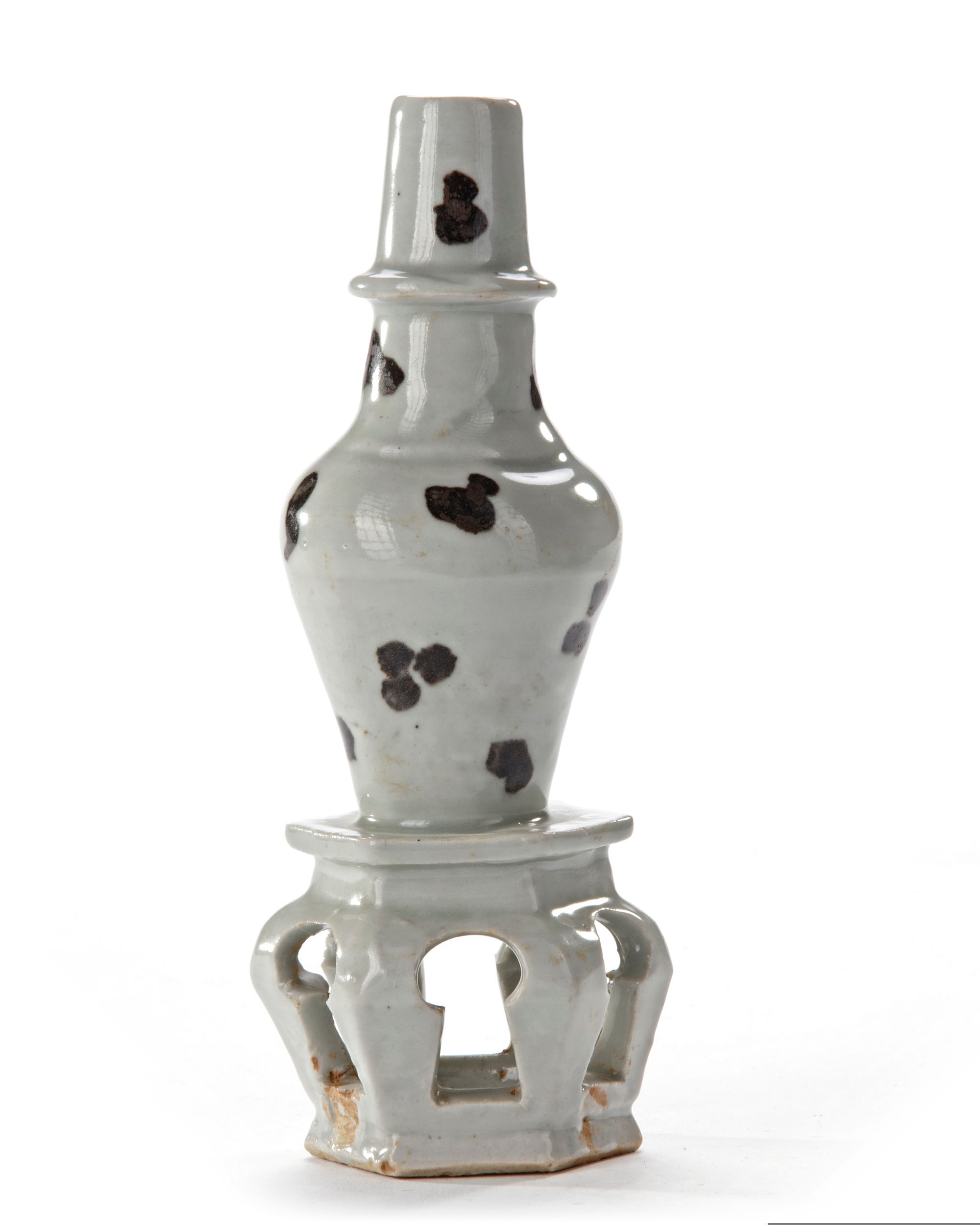 A Chinese porcelain vase on a stand, with pierced design, covered with a Qingbai glaze with iron spot (Tobi seiji) decoration. The beauty of tobi seiji lies primarily in the rich dark brown spots that create a striking visual impact on the otherwise subtle celadon surface. In fact, the name tobi seiji, literally ‘flying spot green ware’ in Japanese, was given by ancient Japanese tea masters for the dramatic appearance of iron spots. Such spots were added, using a brush, to the surface of the unfired glaze before the pieces were fired. These seemingly spontaneously added spots in fact follow a very thoughtful design principle.