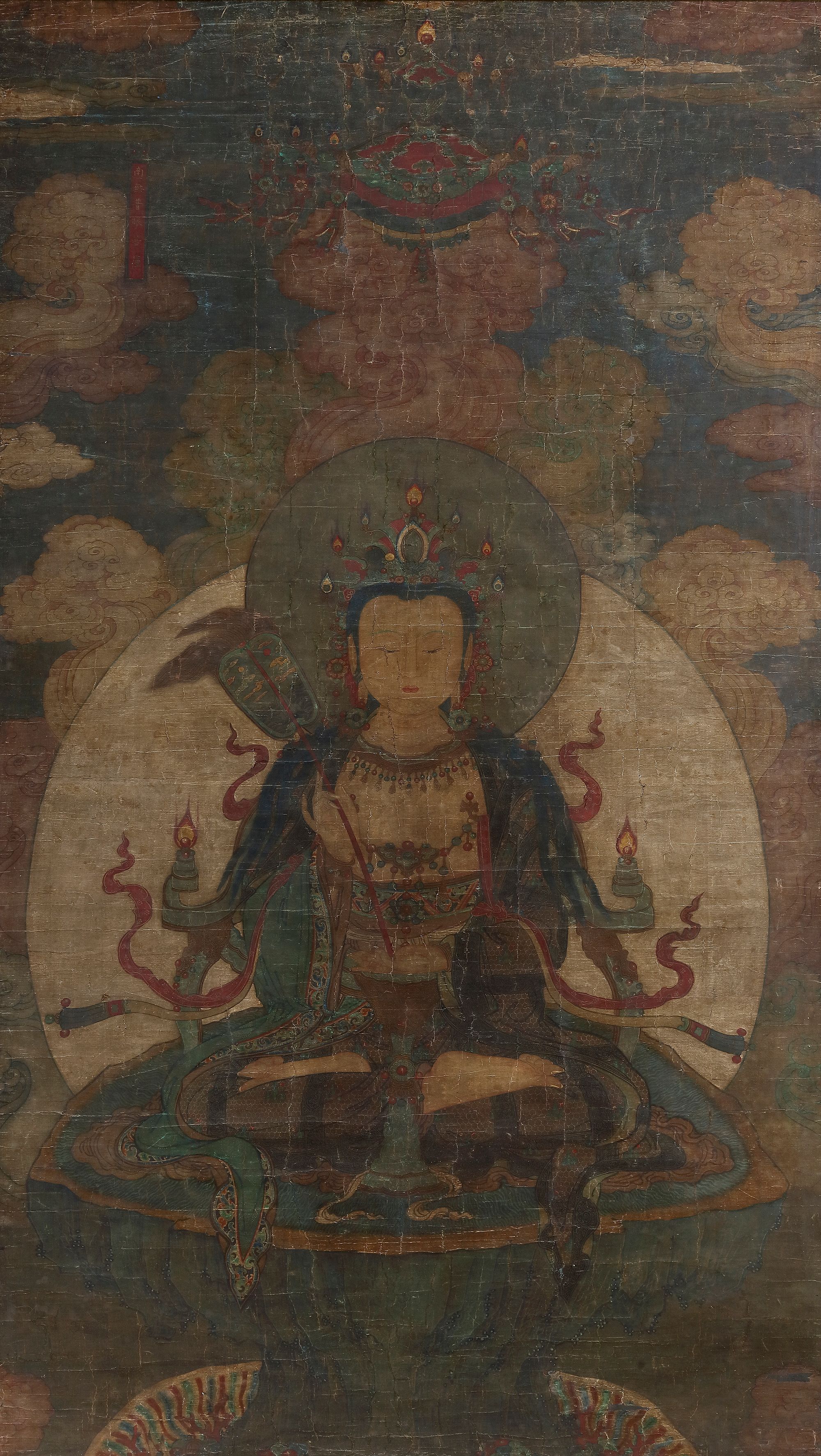 Avalokitesvara is depicted in the centre seated in dhyanasana on a rocky outcrop, both hands holding a fan decorated with waves crashing on rocks. The deity wears an elaborate crown decorated with flaming jewels, long robes finely decorated, and intricately depicted jewellery. All set before a circular mandala and cloud scrolls beneath a floating canopy decorated with further flaming jewels. The upper corner of the painting is inscribed "namo puyan pusa" ("Ode to Puyan Boddhisattva").