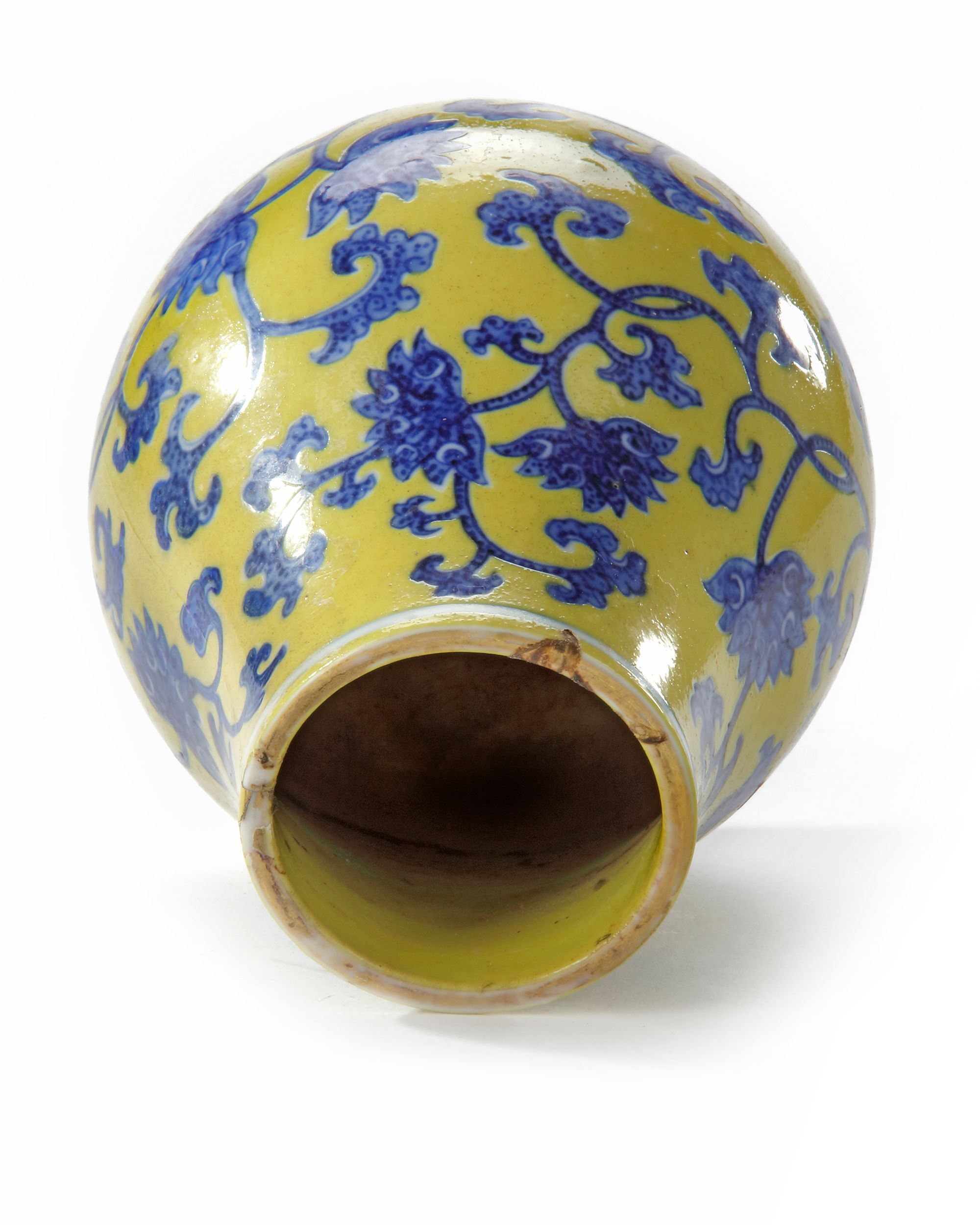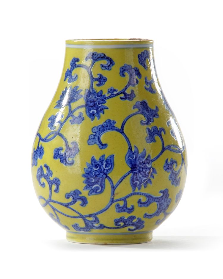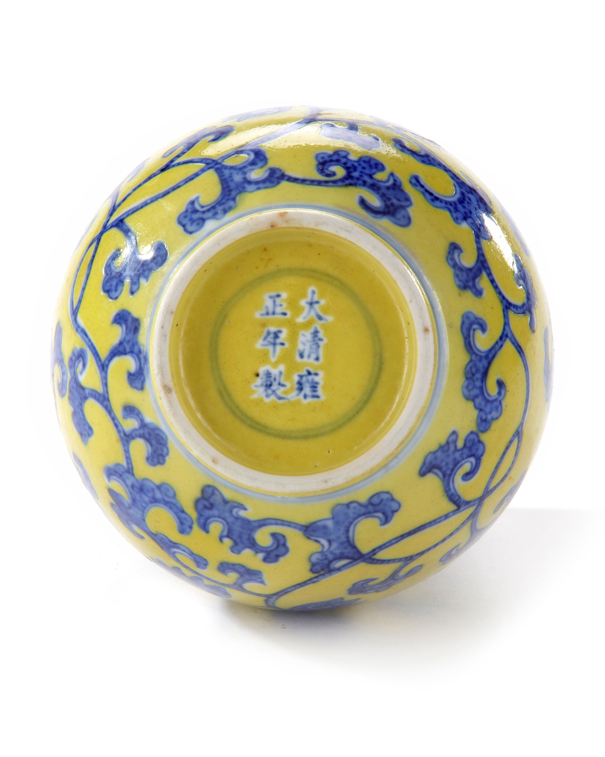 A Chinese porcelain Hu vase, decorated in underglaze-blue with formal scrolling lotus on a yellow ground. The bottom with a Chinese Yongzheng six character mark.