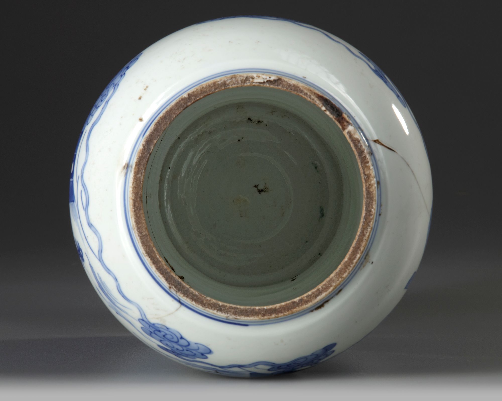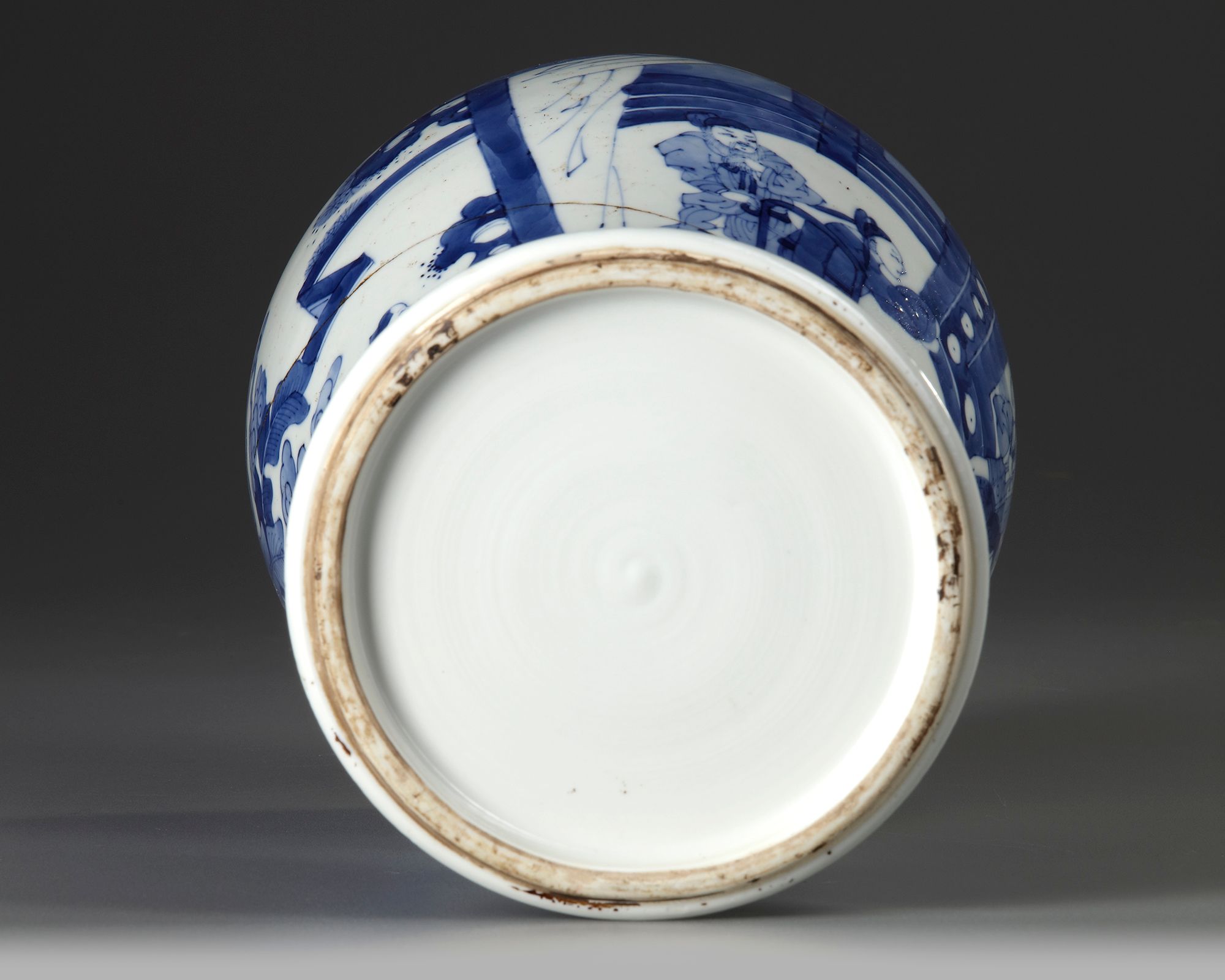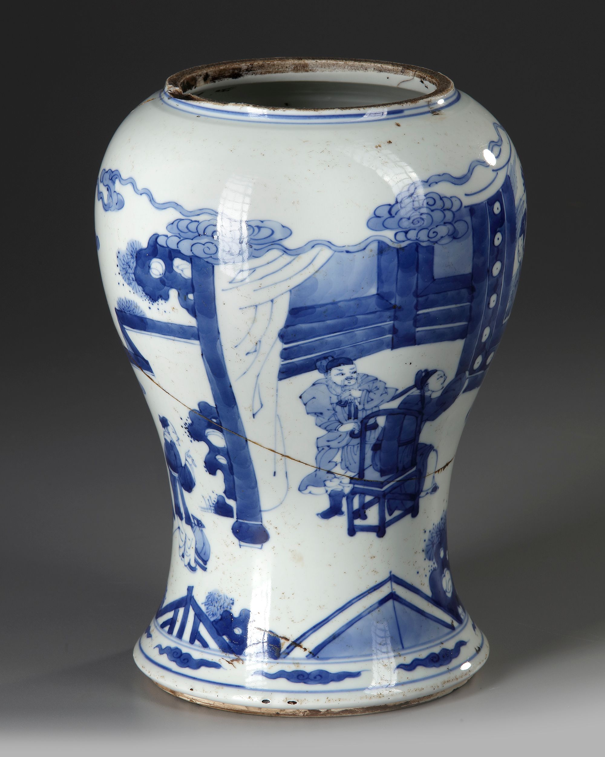A Chinese phoenix tail porcelain vase, the trumpet-neck is cut off, the body decorated in cobalt blue with a dignitary receiving a visitor with attendants in a fenced garden beside large banana trees.