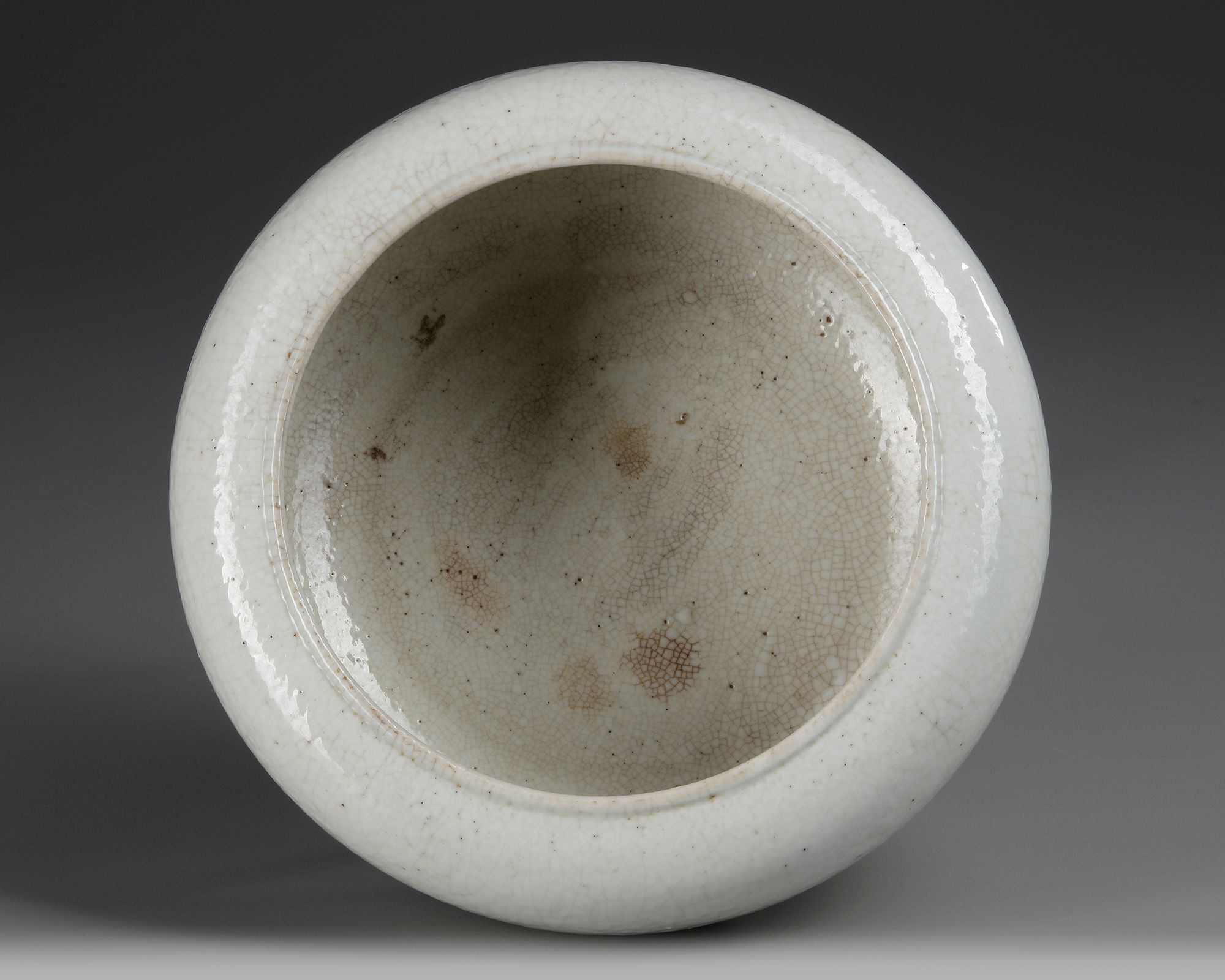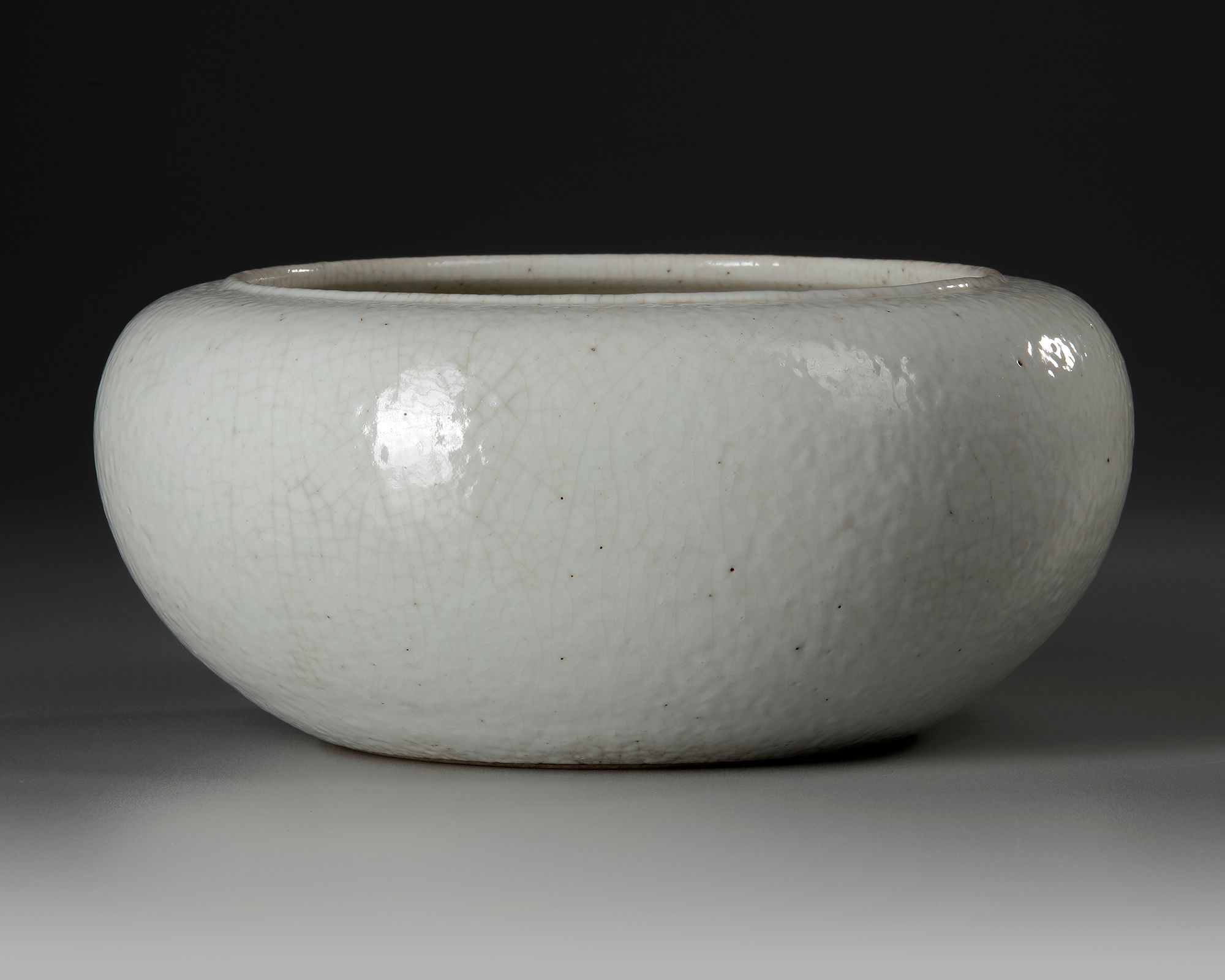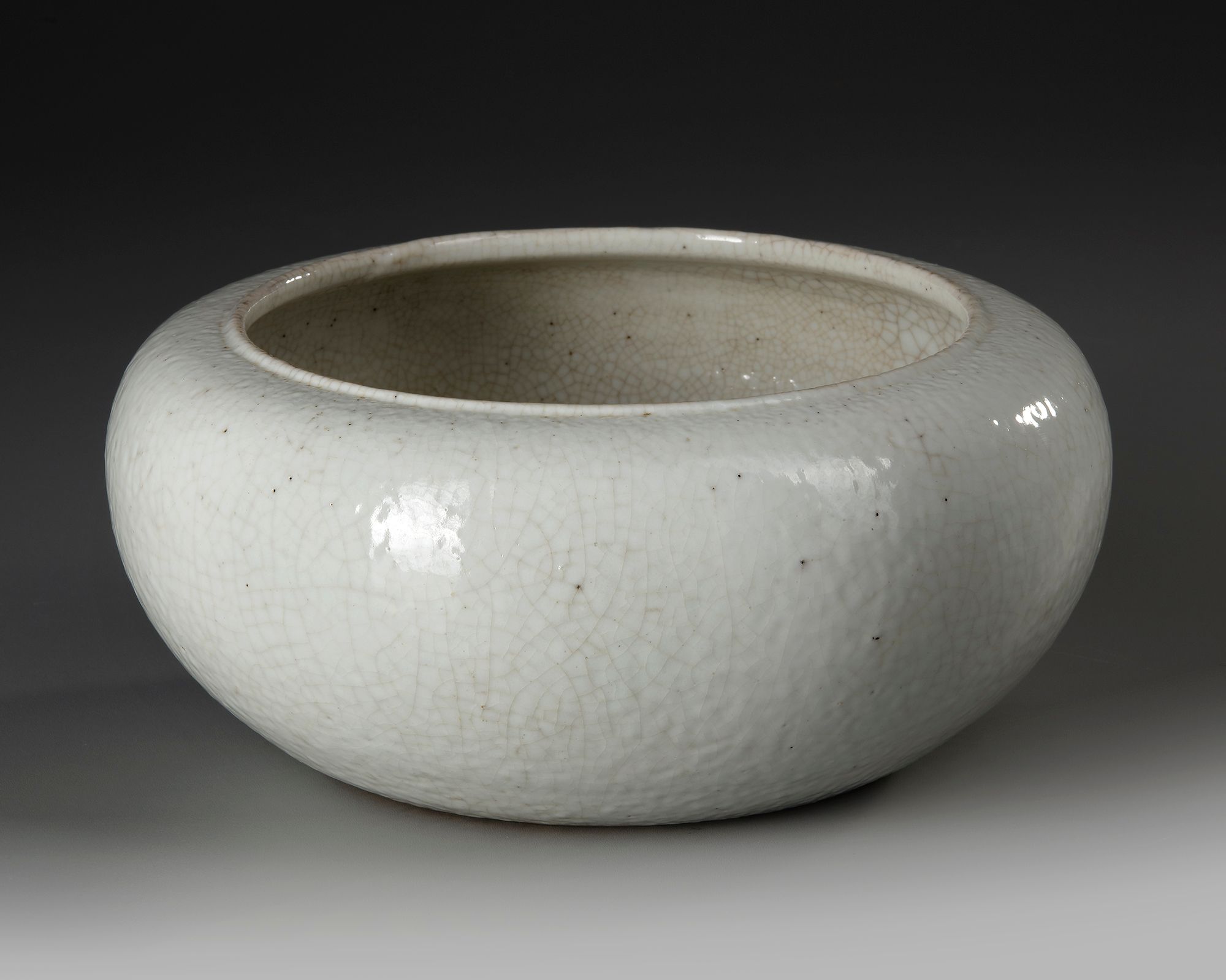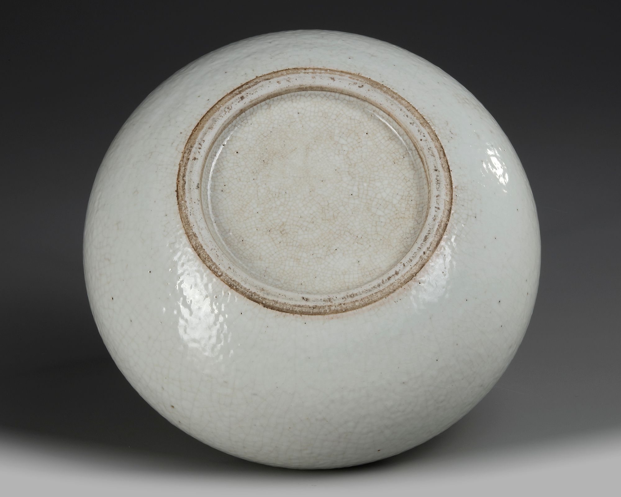 Sturdily potted with a slightly ovoid compressed globular body resting on a countersunk foot, decorated overall with a soft grey crackled glaze.