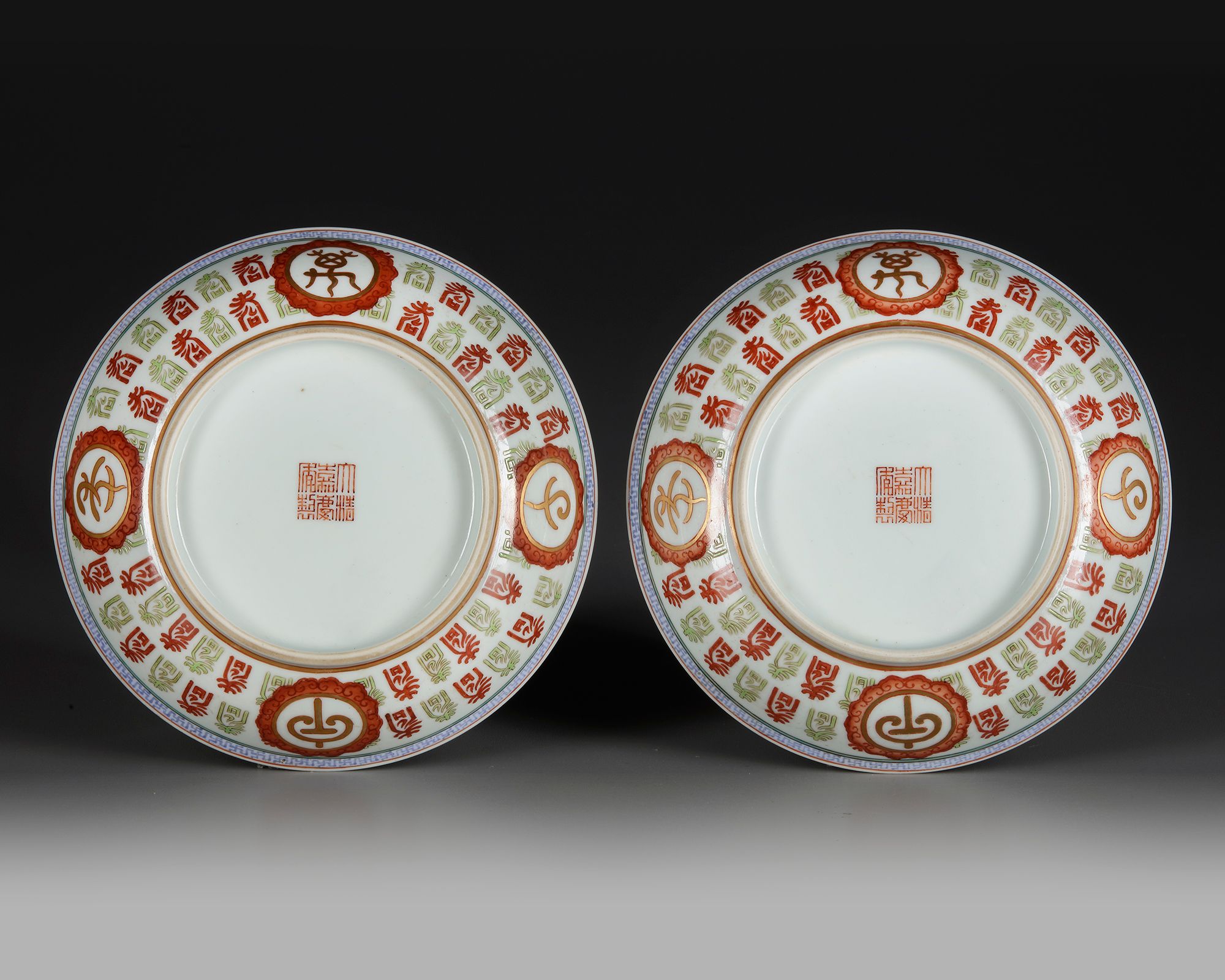 Two Chinese porcelain dishes, decorated to the interior with a central Shou character surrounded by five Fu bats, the exterior stylised with Chinese characters, the bottom with a Chinese Jiaqing seal mark.