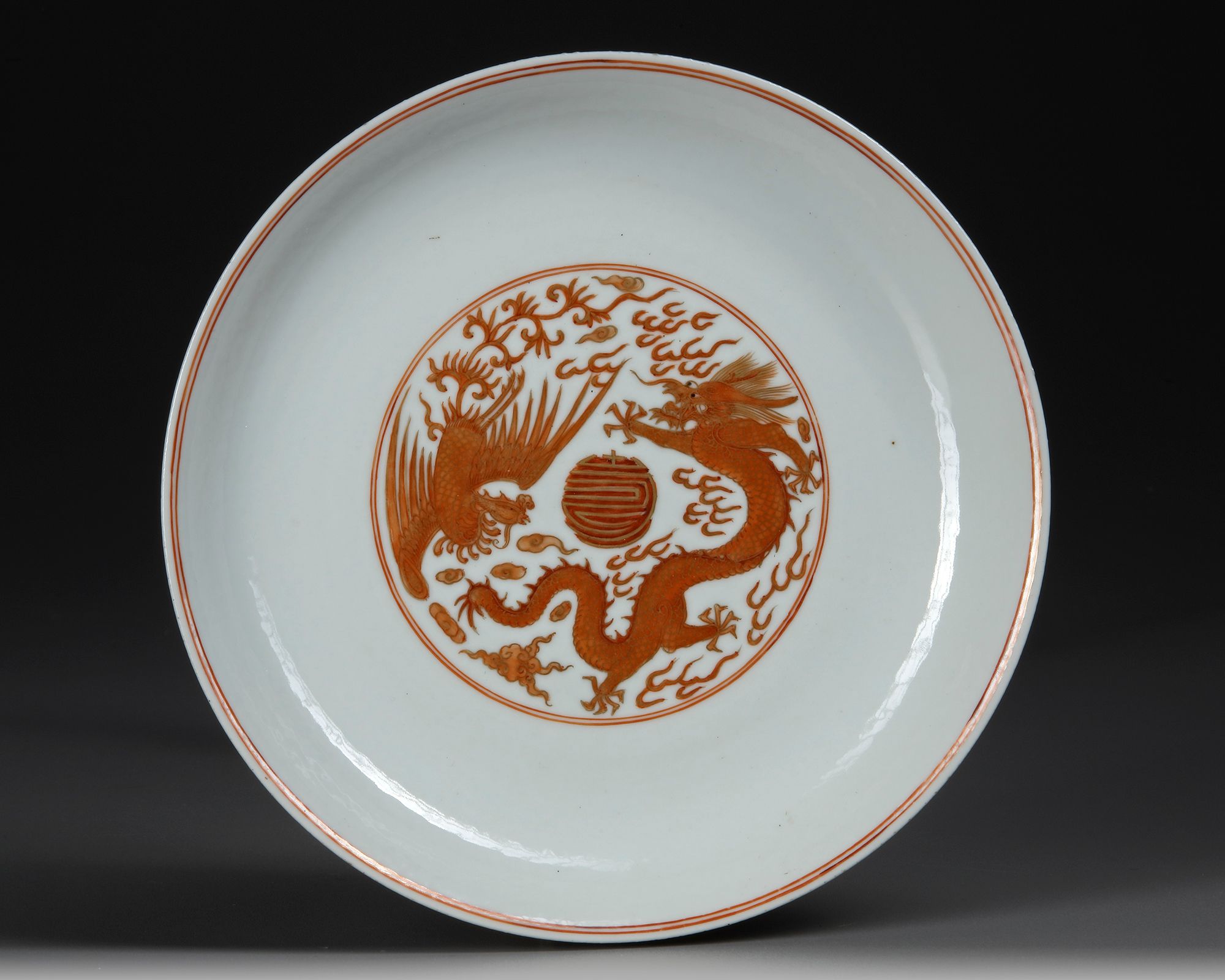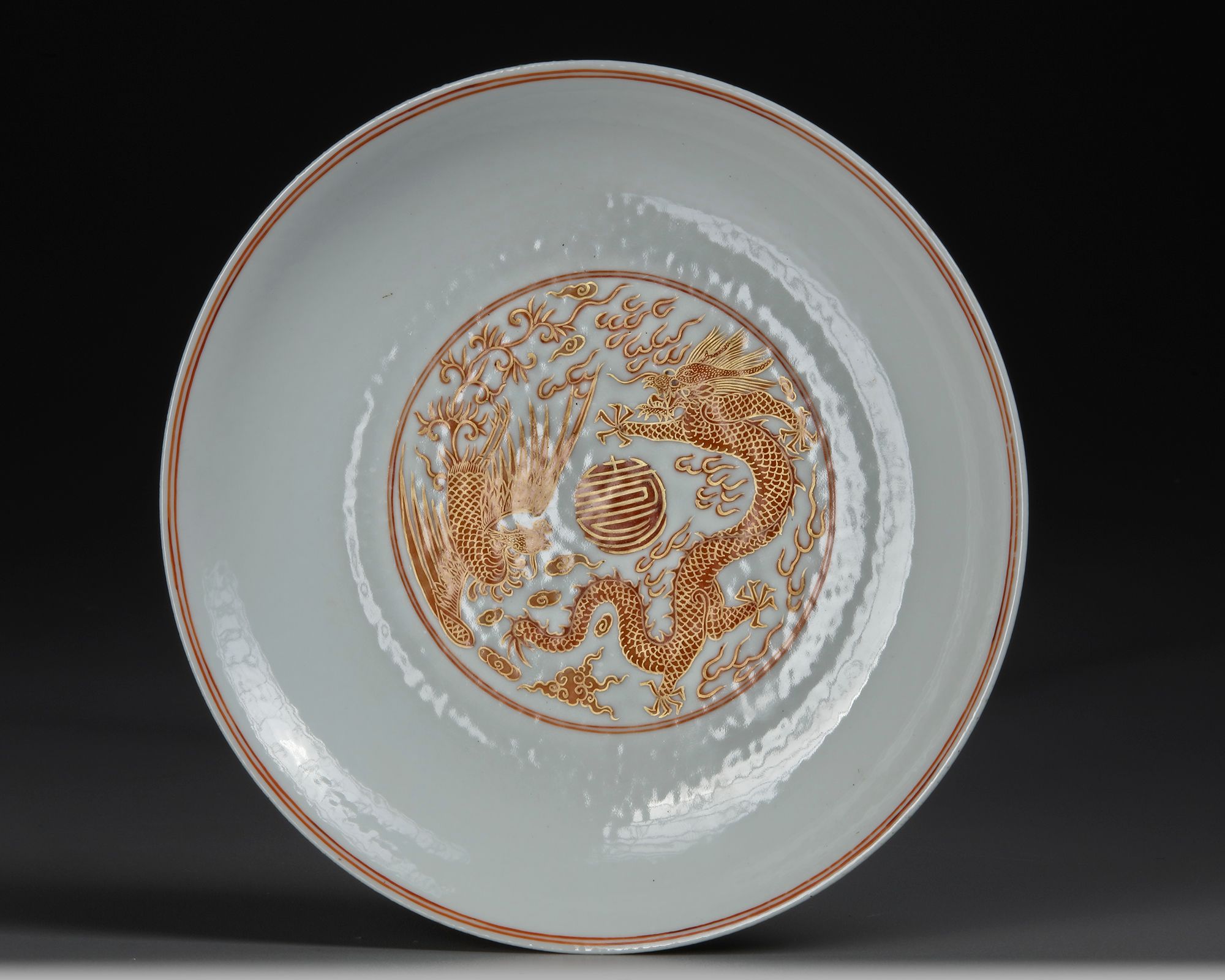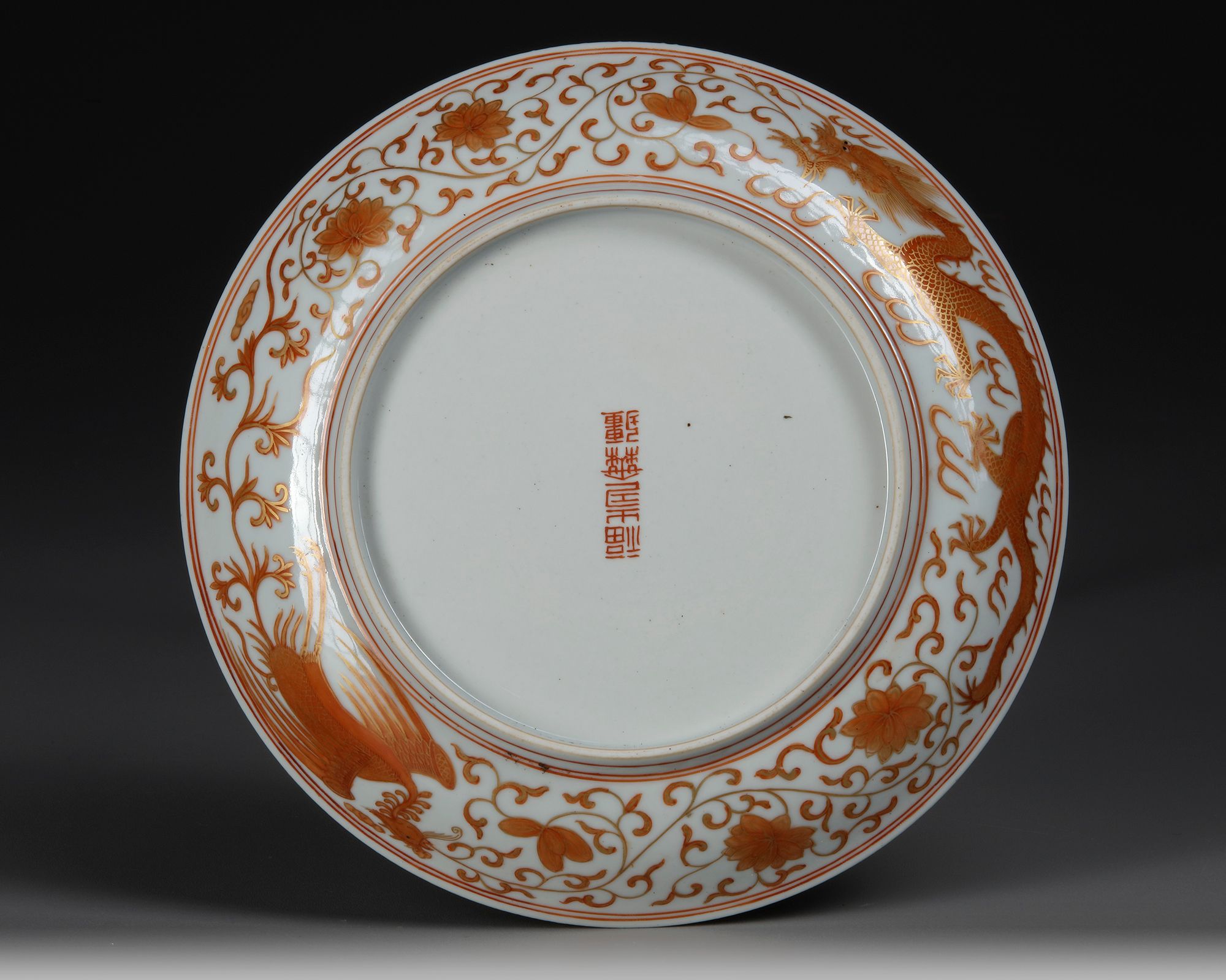 A Chinese porcelain dish decorated to the interior with a central panel enclosing gilt iron red dragon and phoenix bird chasing a flaming pearl amongst clouds. The exterior is sylized with a dragon and a phoenix bird amongst floral leafy sprays. The bottom with a Chinese four character mark.