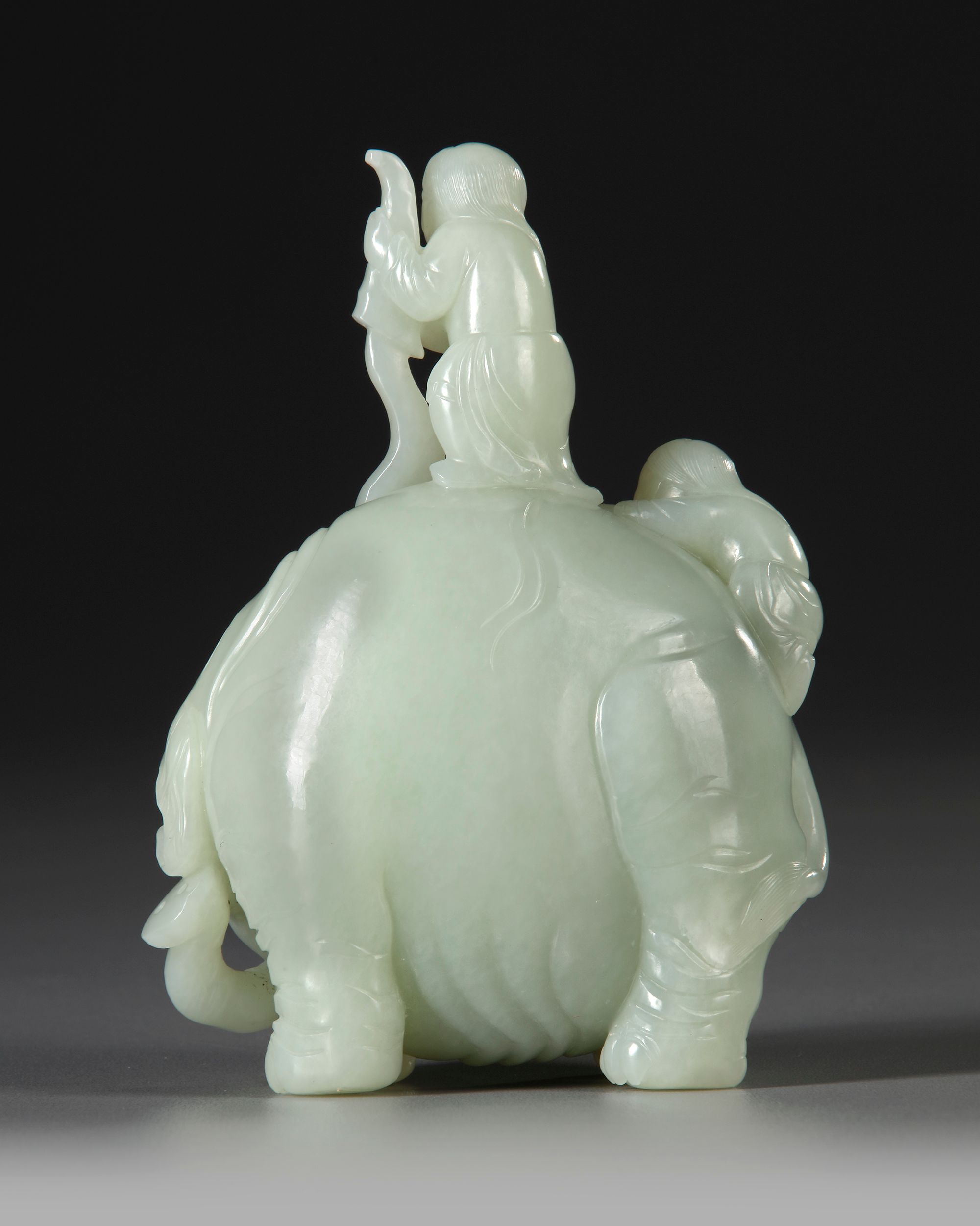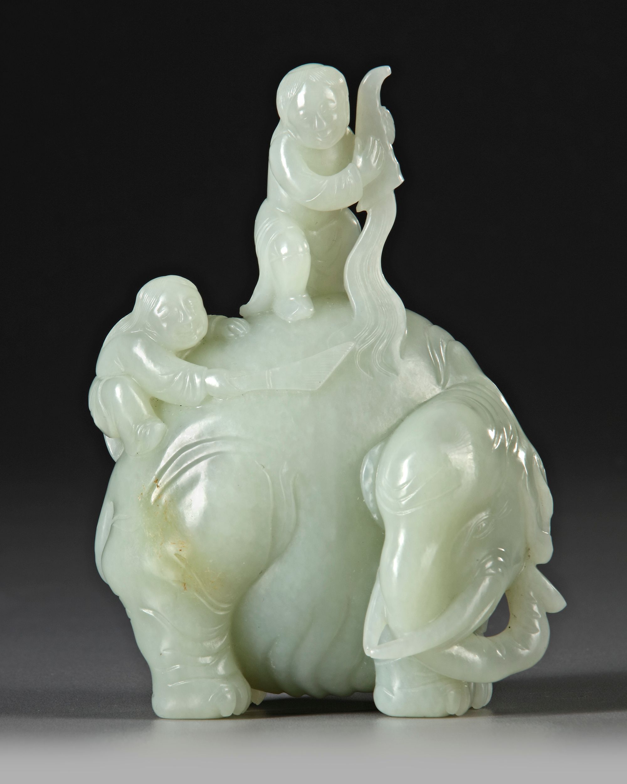Finely carved in the round as an elephant standing four-square with its head turned sideward with its trunk curled alongside its foreleg, two boys clambering up the back of the elephant and each cleaning the animal with a brush, their faces displaying a jovial expression, the stone of a pale celadon tone.