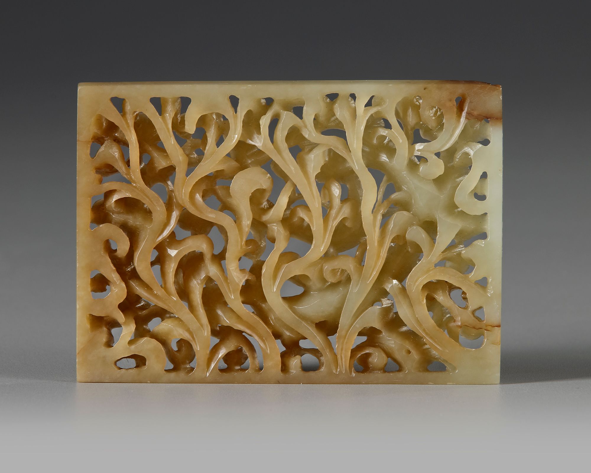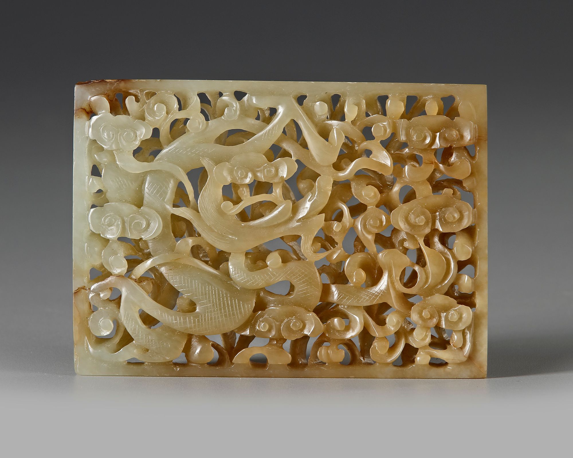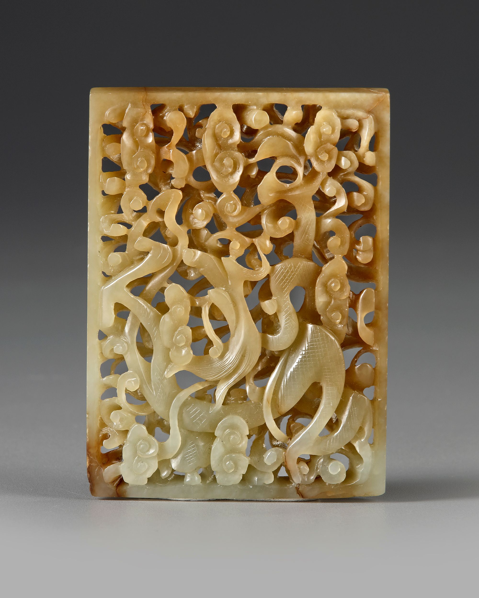 The rectangular plaque is carved with a striding three-clawed dragon amongst openwork scrolling lingzhi. 10.5 by 7.5 cm.