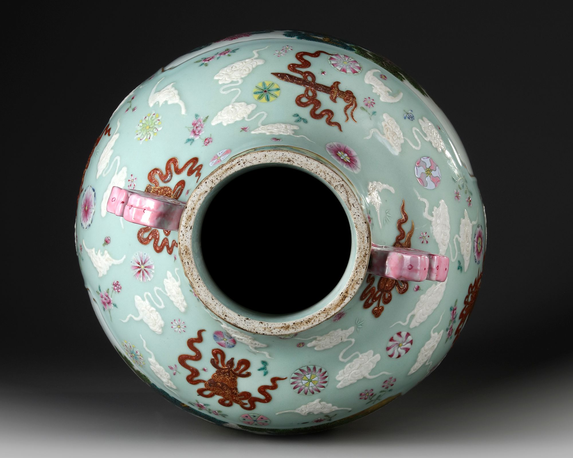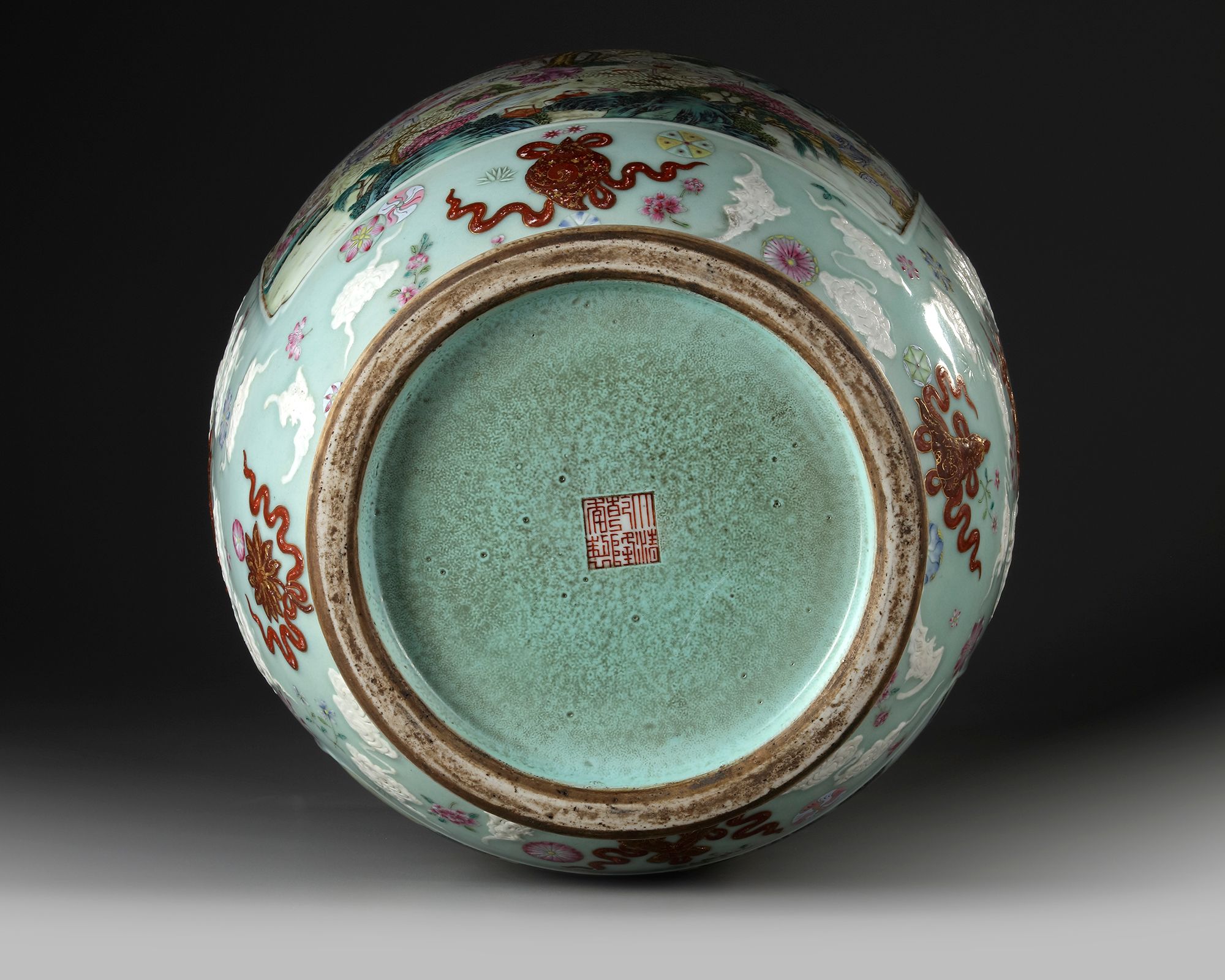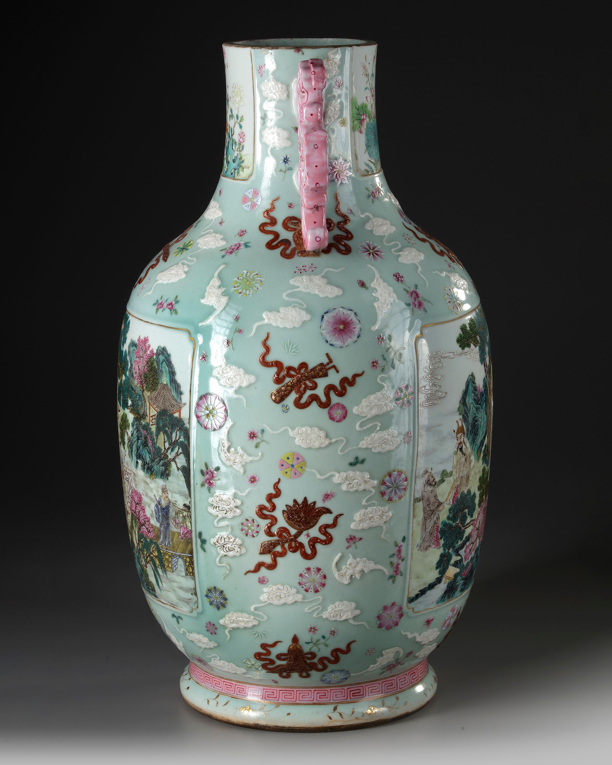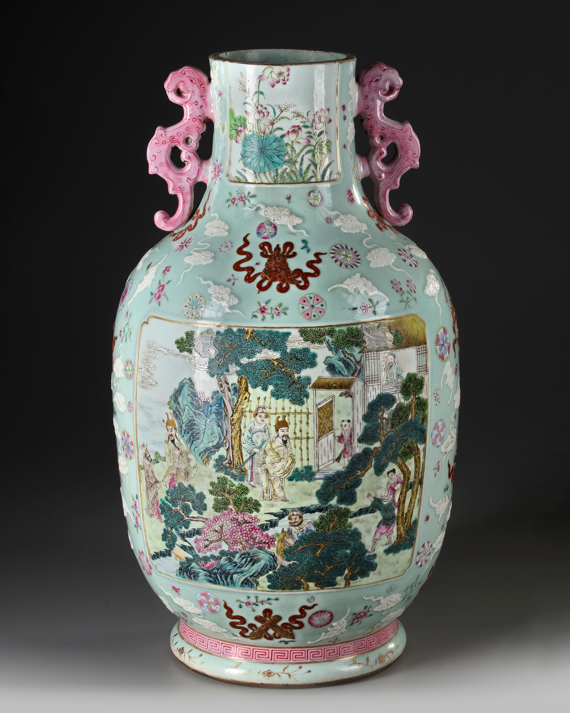 A large Chinese porcelain vase, stylized with two phoenix bird shaped handles in high relief around the shoulders. The body and the neck are both decorated in colorful enamels with two large panels enclosing elderly figures with children in a fenced garden with blossoming trees on both sides, the neck with panels containing flowers growing from ornamental rocks. Further applied with eight Buddhist embelms, Fu bats and clouds amongst flower heads against a turquoise ground. All above a key fret chain to the base. The bottom with a Chinese Qianlong seal mark on a turquoise glazed ground.